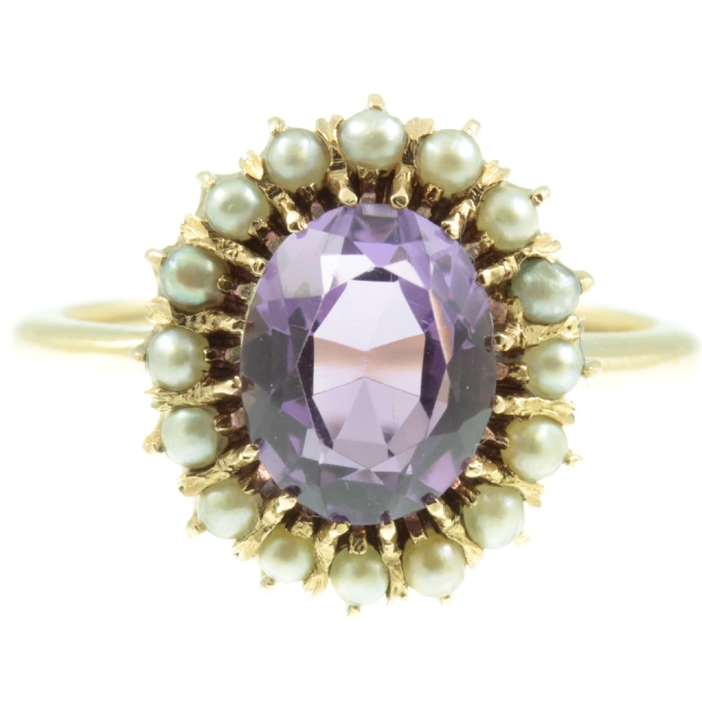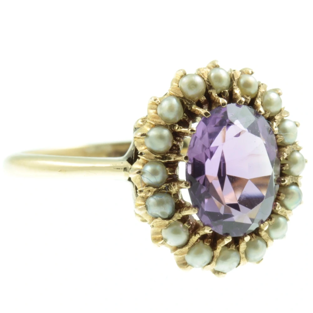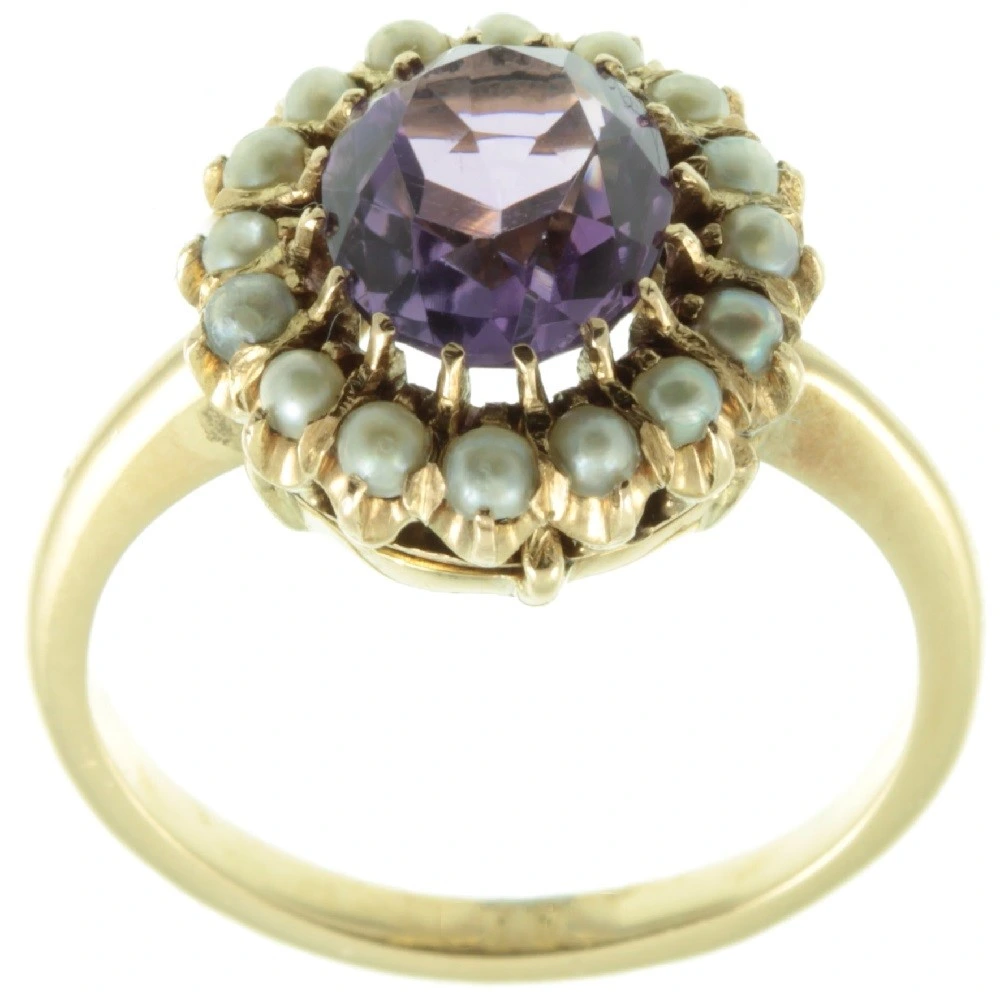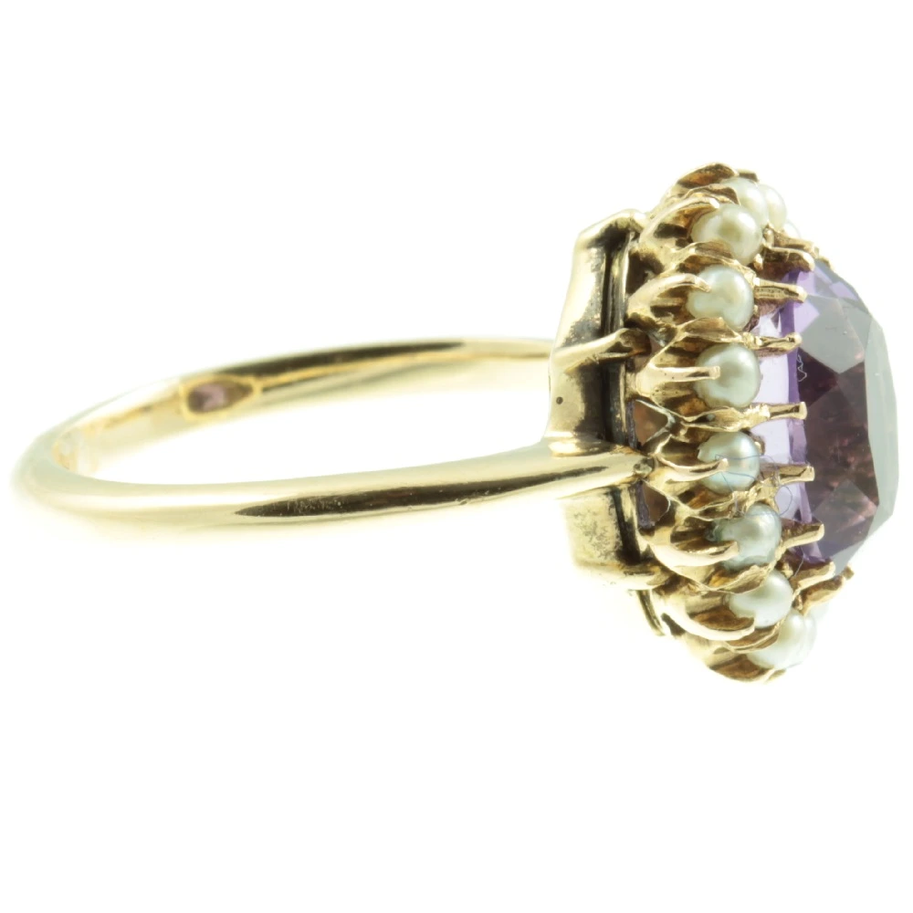 An exceptional Edwardian 15ct Gold Amethyst and Seed Pearl Ring. An oval cut Amethyst weighing 1.40ct has been set in rich 15ct yellow gold and is surrounded by a row of sixteen seed pearls. This Amethyst gemstone has excellent clarity and as such catches the light beautifully. A rare and unique Edwardian ring.