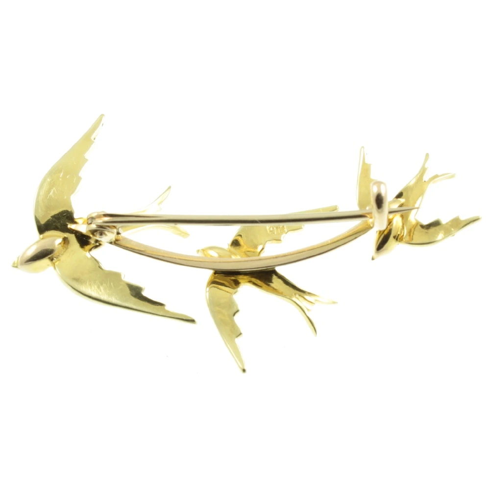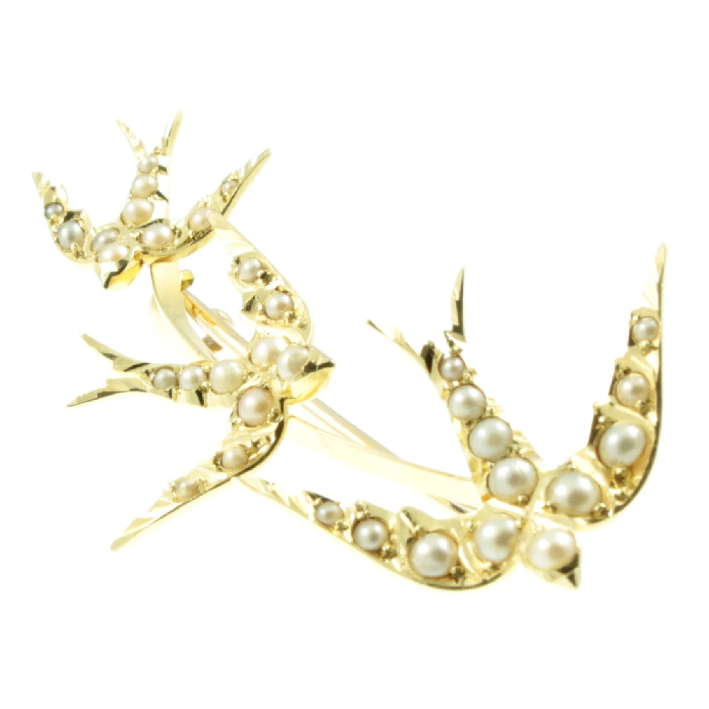 A rich Edwardian 15ct Gold swooping swallows brooch. A graduated line of three swallows in mid-flight has been made from 15ct yellow gold, with each one studded in split seed pearls. This brooch has a beautiful deep luster which make it stand out when worn.
