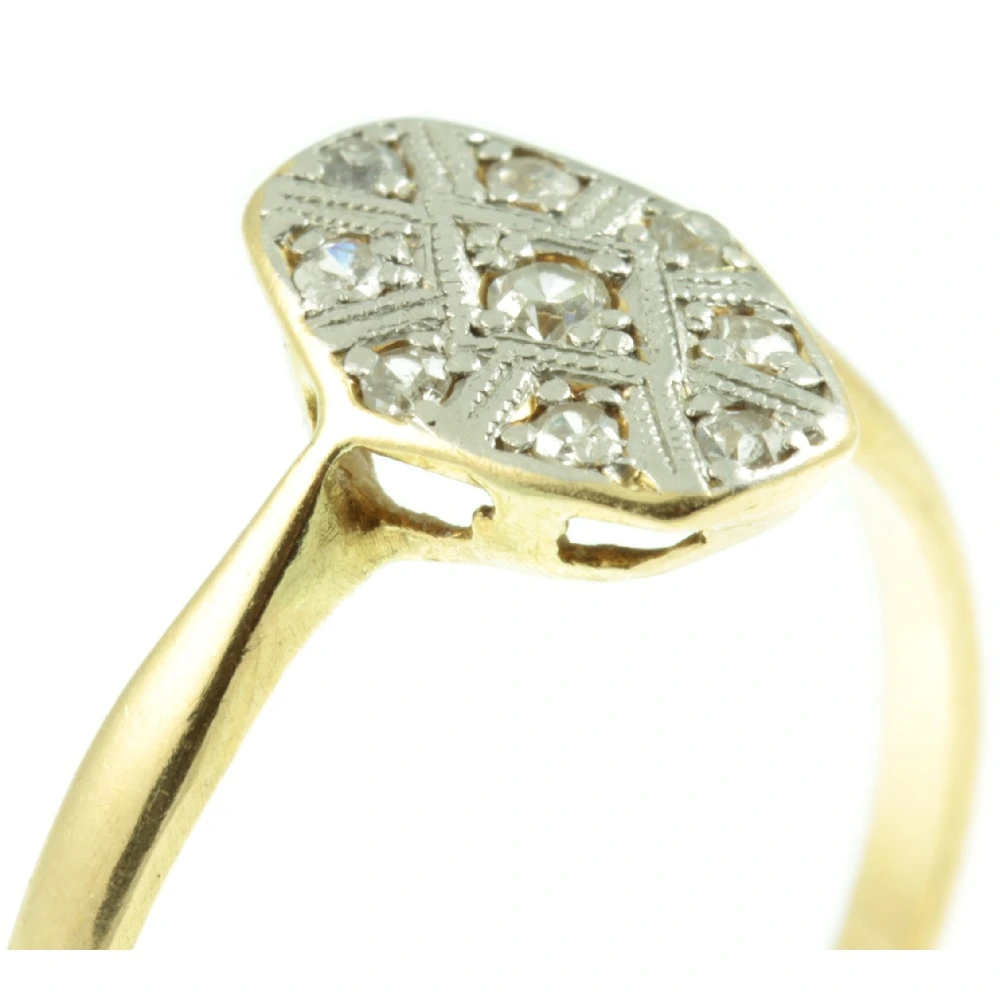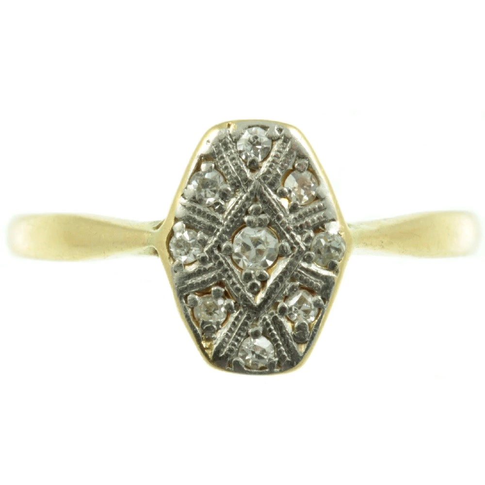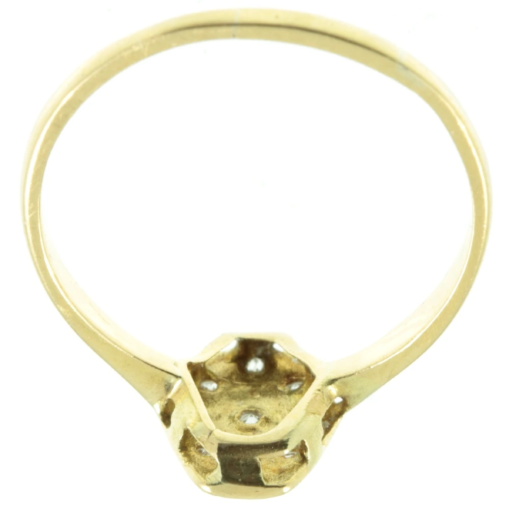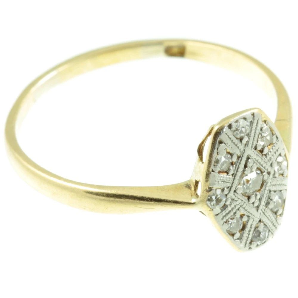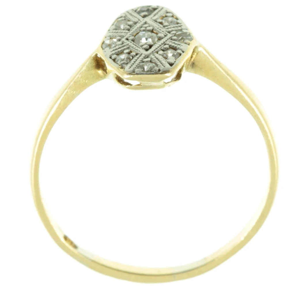 A petit Art Deco 18ct Gold Diamond hexagon ring. A central round-cut diamond has been set in 18ct white gold and is surrounded by eight round-cut diamonds to form a hexagon shape. The gallery and band are made from rich 18ct yellow gold, giving this ring a lovely contrast. An elegant and understated piece of fine jewellery.
