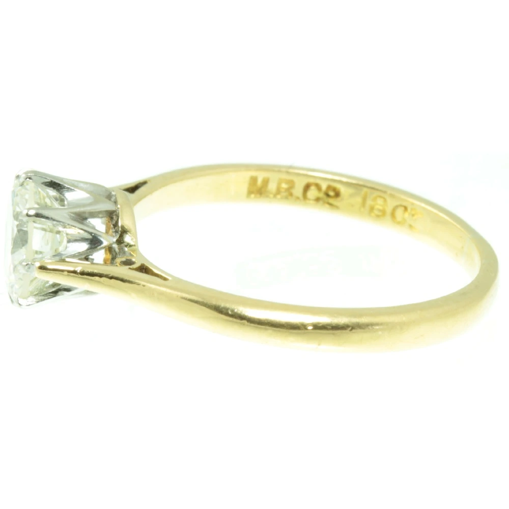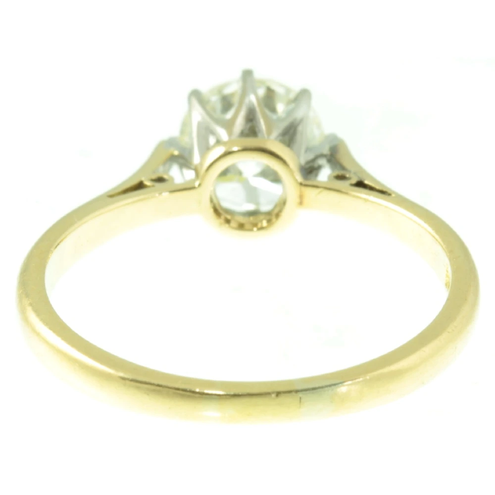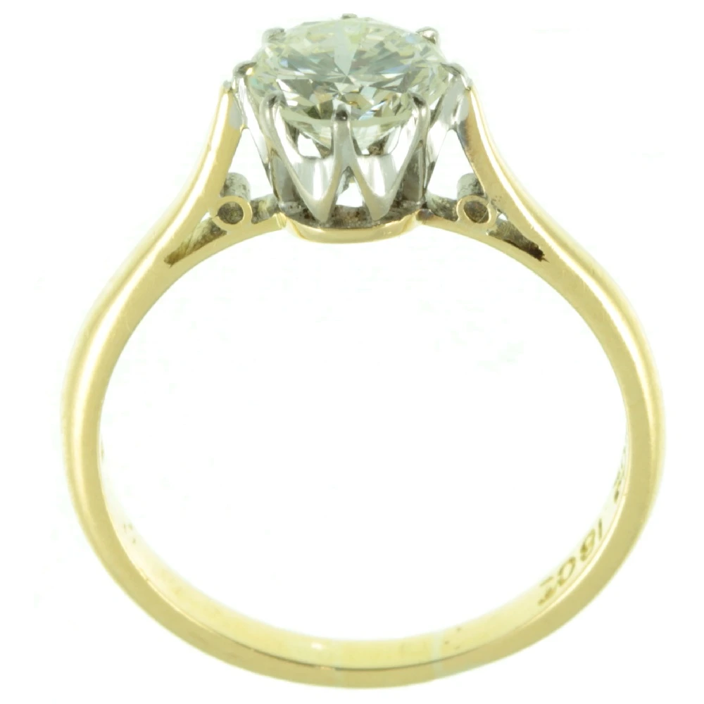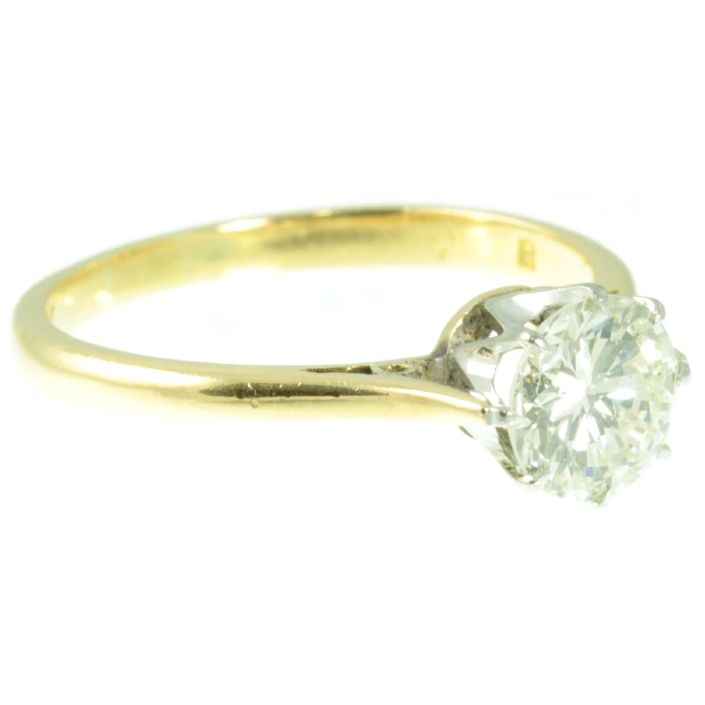 A stunning Vintage 18ct Gold Diamond Solitaire Ring. This round brilliant cut diamond weighs 75 points and has exceptional clarity. It is set in 18ct white gold using a claw setting, making it very secure and wearable for everyday use. The white gold setting is mounted in a luxurious 18ct yellow gold band with scrolling detail to the shoulders. This modern solitaire diamond ring has a bright and vibrant quality to it, producing a beautiful sparkle. A most desirable engagement ring.