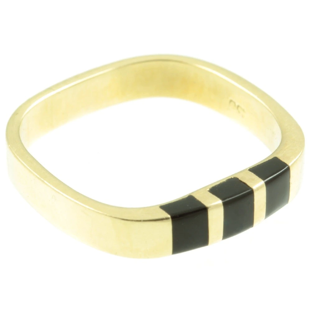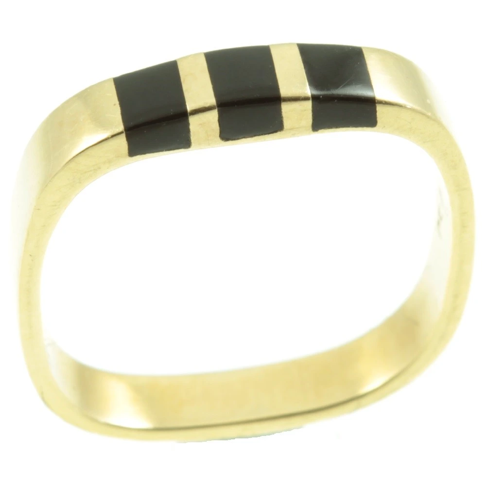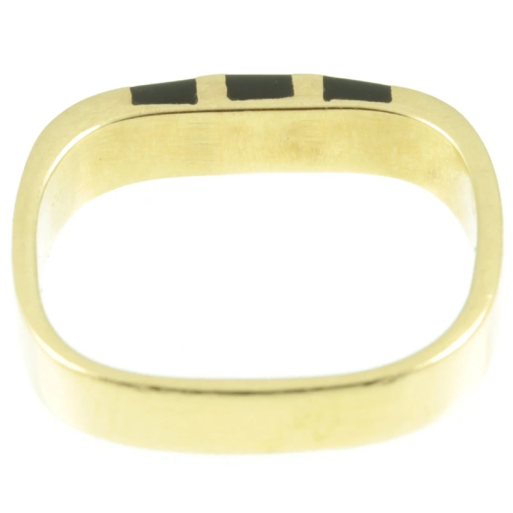 A highly polished Mid-Century 18ct Gold Onyx Ring. Three cube-shaped pieces of Onyx have been set in rich 18ct yellow gold, with a cushion-shaped band. A very distinguished ring.