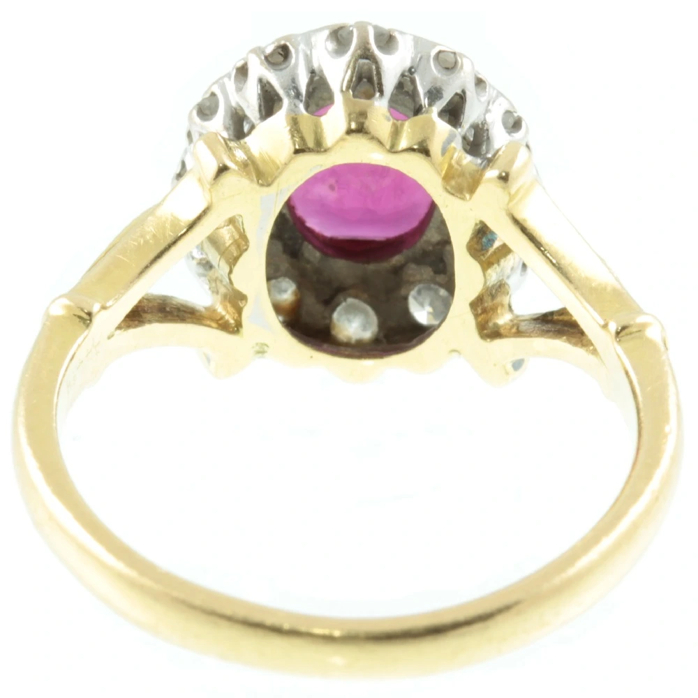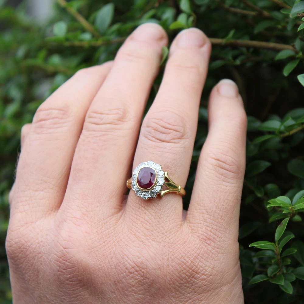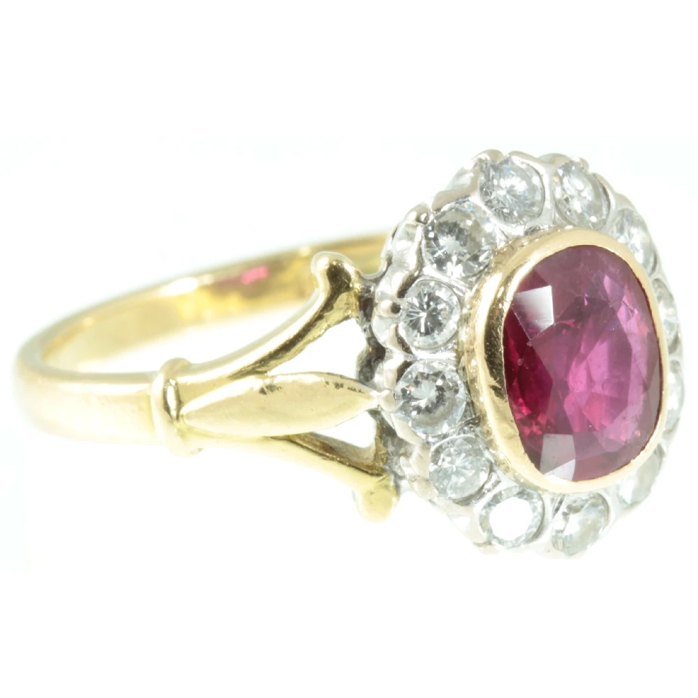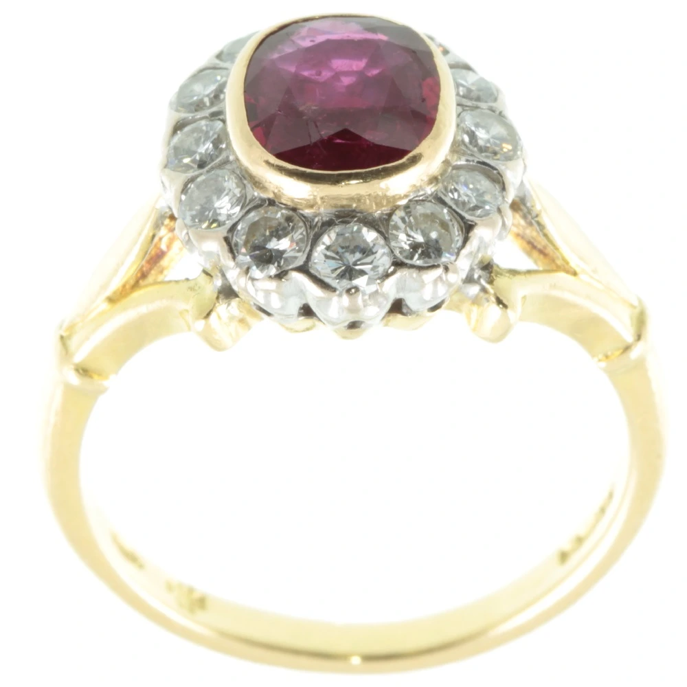 A classically designed Vintage 18ct Gold Ruby and Diamond ring. An oval cut Ruby gemstone weighing 1ct has been set in 18ct yellow gold by means of a bezel setting. This Ruby has excellent clarity and a beautiful depth of colour, it is surrounded by twelve bright diamonds with a total weight of 70 points and finished in a scalloped-edged setting. An elegant and timeless ring.