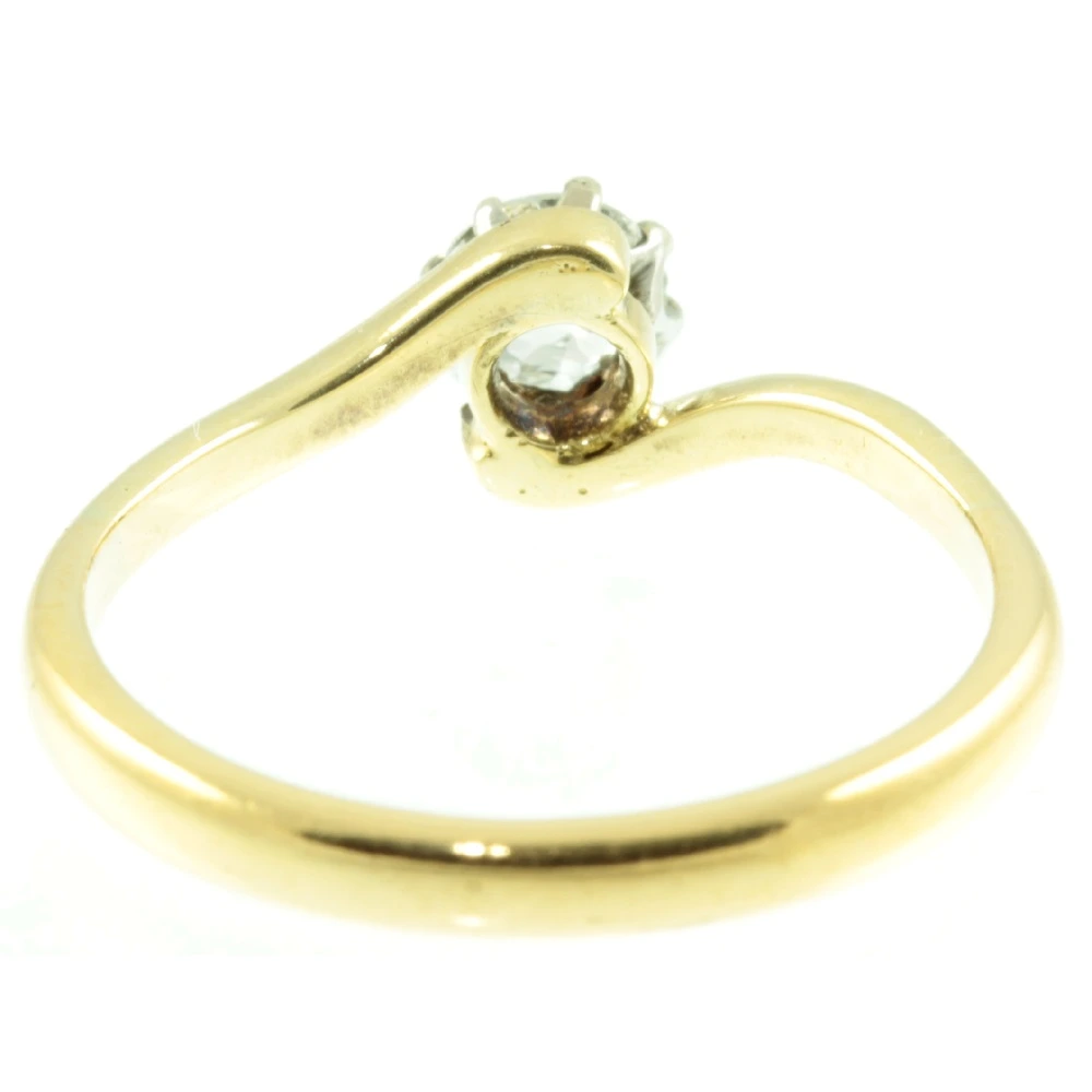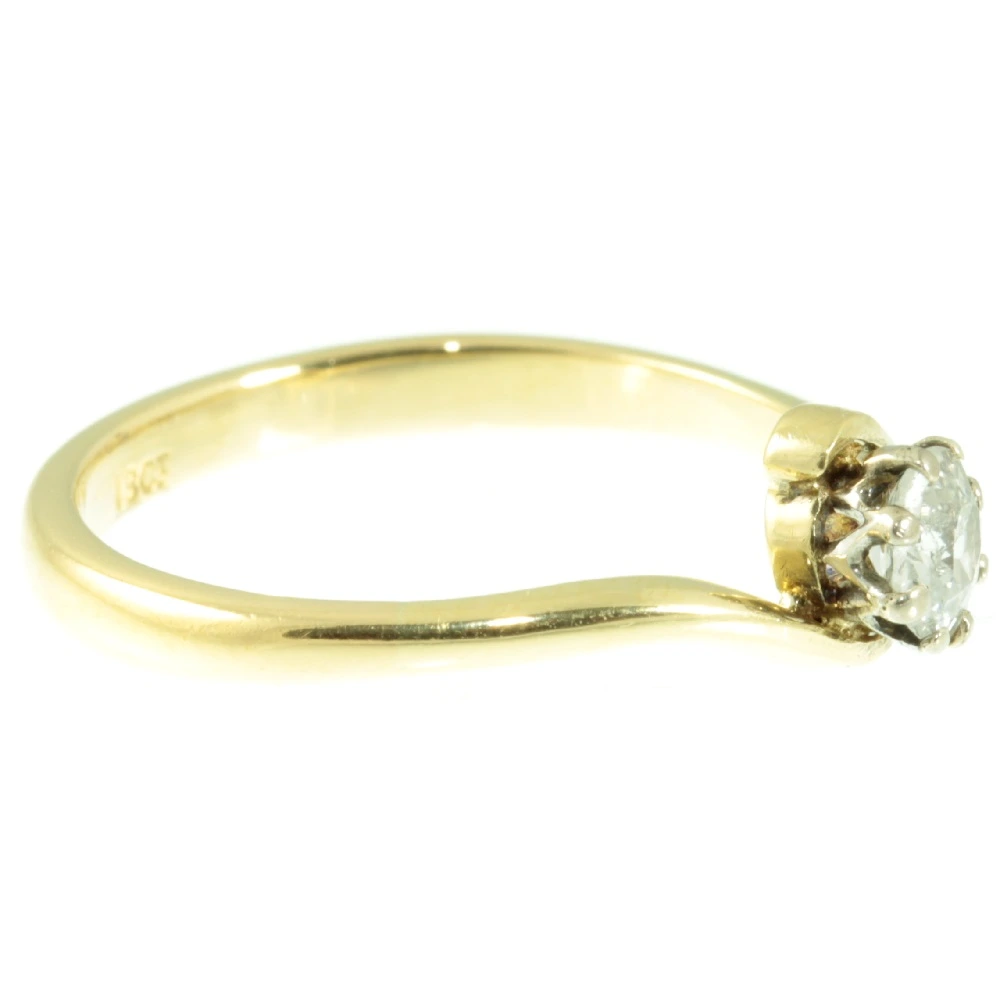 A radiant Art Deco 18ct Gold Solitaire Diamond ring. A striking old cut diamond weighing 20 points has been set in rich 18ct yellow gold. The diamond has excellent clarity and as such catches the light beautifully. This stylish 1920s twist ring would make a stunning engagement ring.