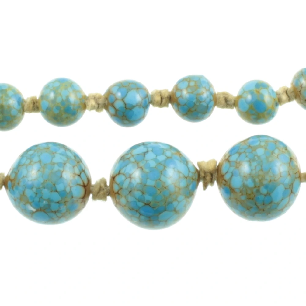 An original Art Deco 1930s Sea Sediment Jasper Necklace. Graduated polished sea sediment Jasper beads have been hand-knotted to form this exotic necklace. These sea sediment jasper beads have a crackle glaze pattern with hues of turquoise. An iconic Art Deco flapper necklace.