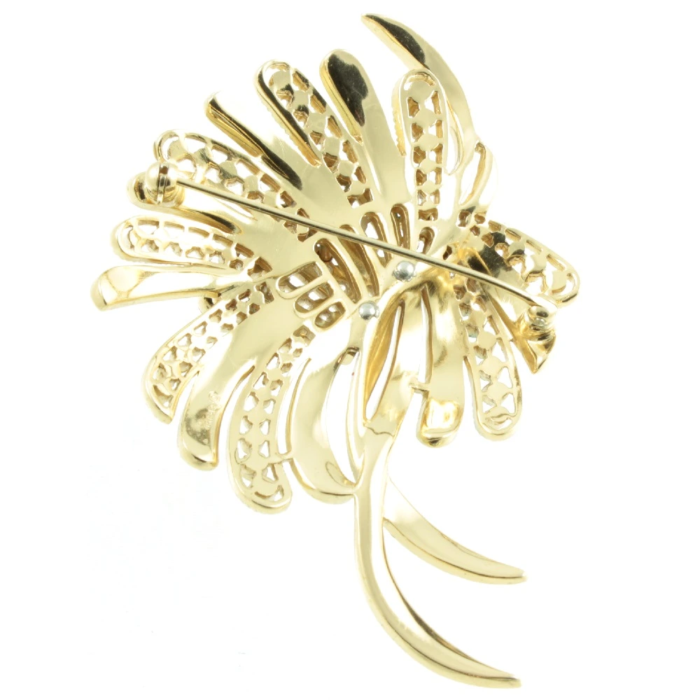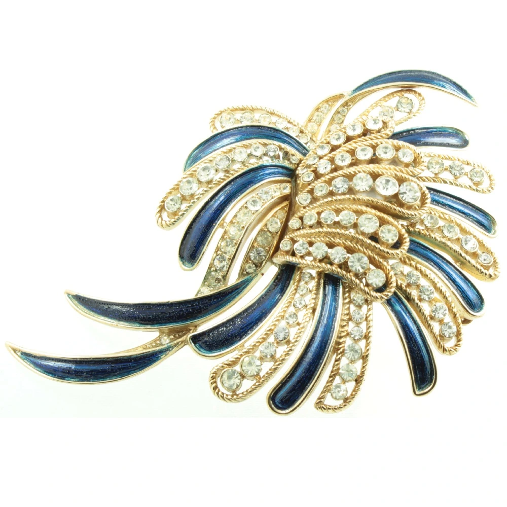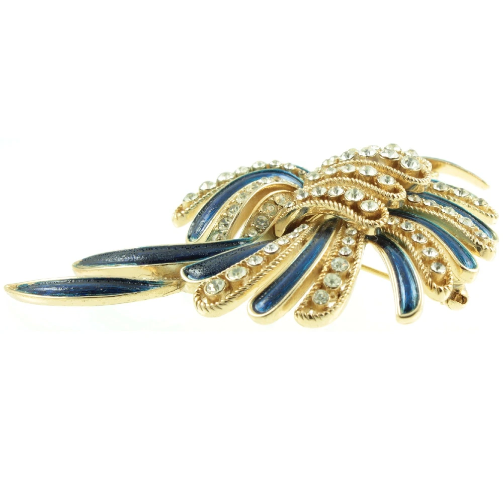 A beautiful Art Deco 1930s Trifari Spray Brooch. A gold-plated spray brooch, studded with clear rhinestones individually mounted in a closed-back rub-over setting. Each rhinestone frond features a twisted rope finish, which adds texture as well as extra sparkle to the piece. These rhinestone fronds alternate with metallic blue fronds, creating a gorgeous combination of depth and sparkle. This brooch is signed Trifari and is an original piece of vintage costume jewellery.