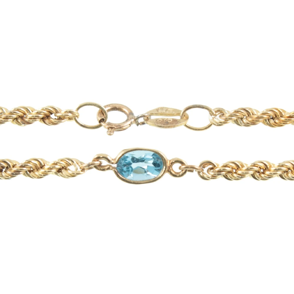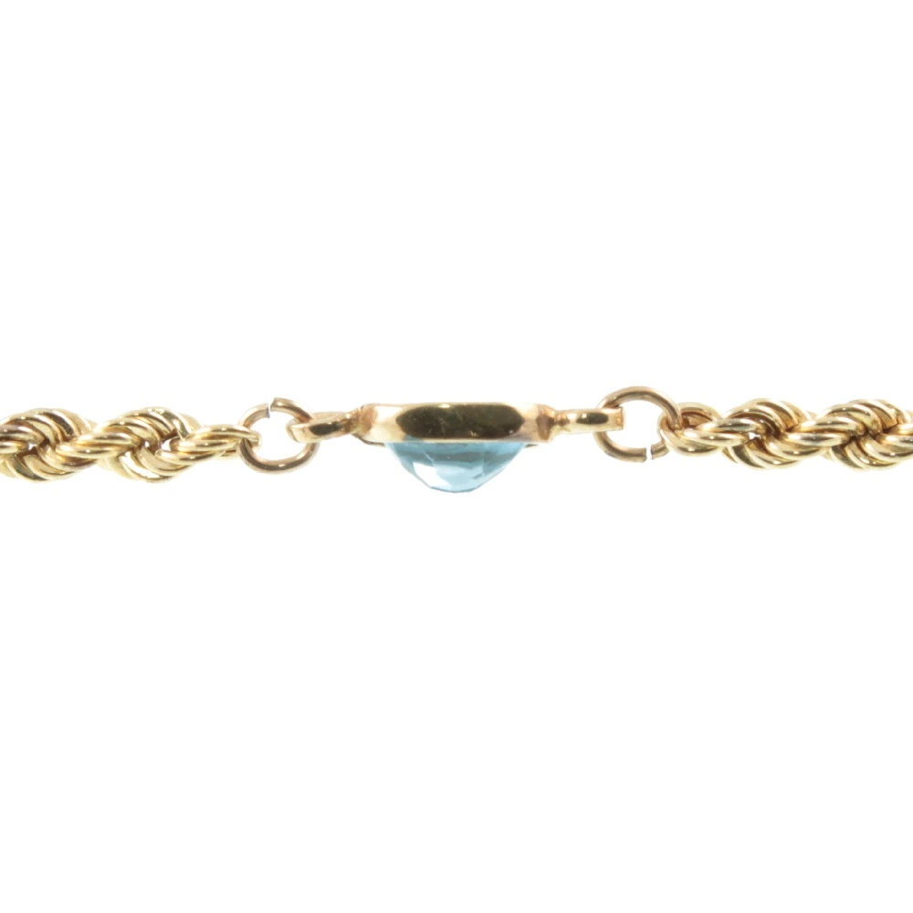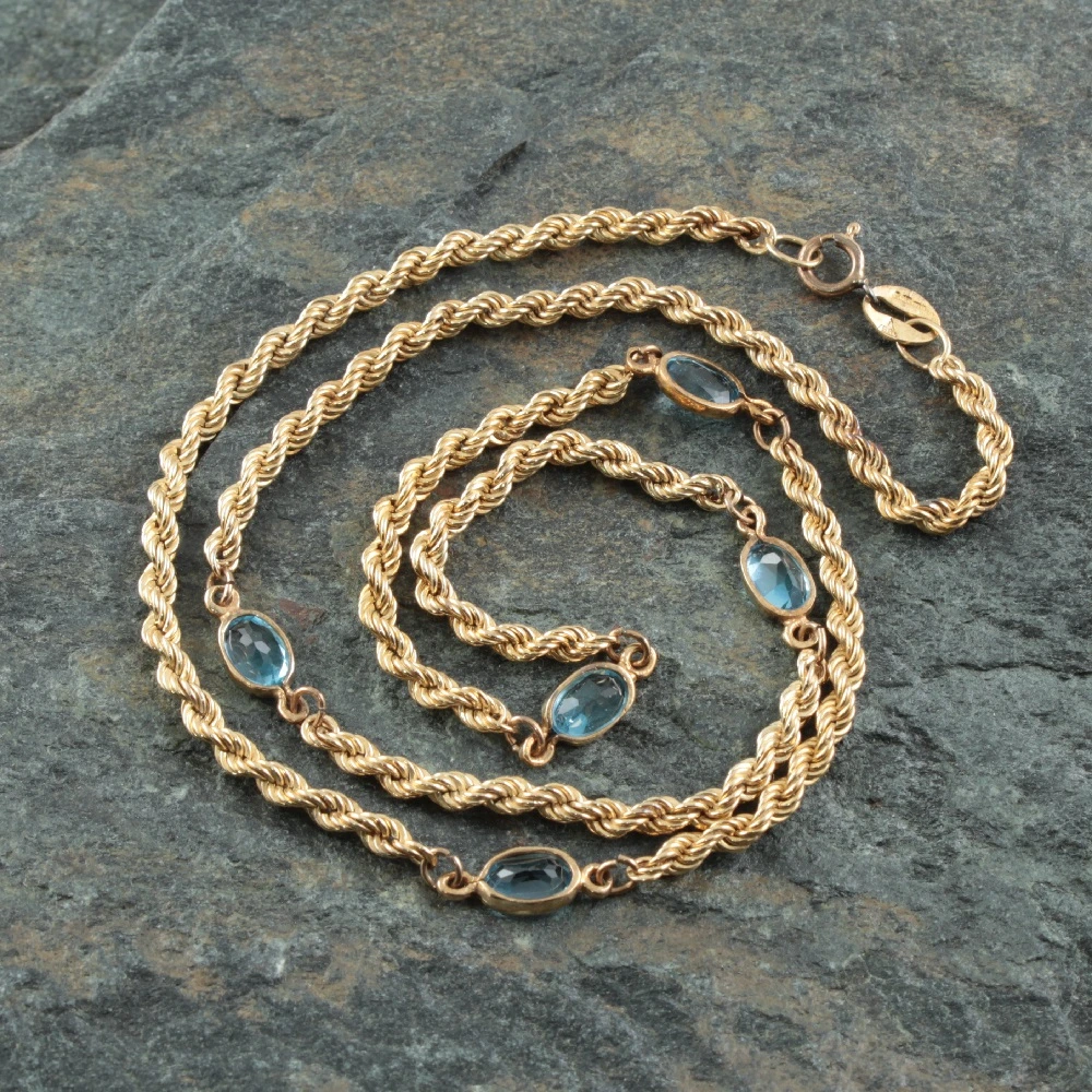 A stylish Retro 1940s Topaz necklace. Made from 9ct gold hollow rope chain with five oval cut topaz gemstones set in collet settings. Hollow gold was commonly used in the 1940s, as jewellers struggled with wartime restrictions on gold. An elegant piece of Retro Jewellery, which would suit almost any style of outfit.