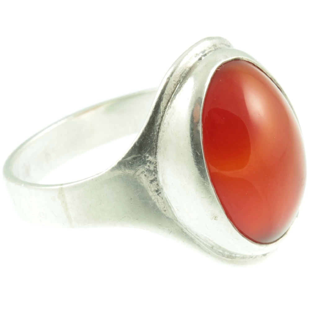 A gorgeous cherry red Mid-Century 1950s Carnelian Silver Ring. A large oval-cut cabochon carnelian gemstone weighing 6.87ct is set in silver using a rub-over setting. The carnelian has been polished to a mirror finish and has a beautiful lustre to it. A lovely example of a 1950s artisan silver ring and very comfortable to wear due to its splayed shoulders.