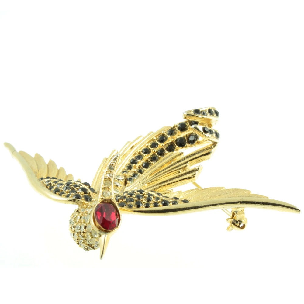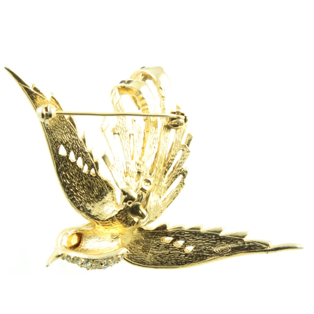A bright & cheerful Vintage 1960s Swallow Brooch. A rhinestone studded swallow brooch in a gold tone setting, sign by Sphinx. This well-made brooch is a lovely piece of vintage costume jewellery.
