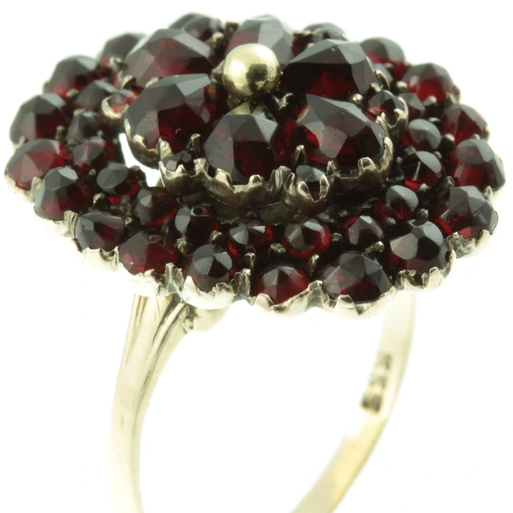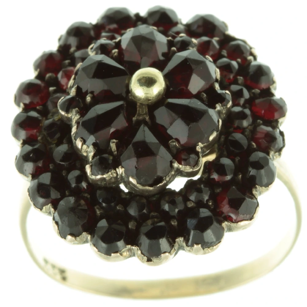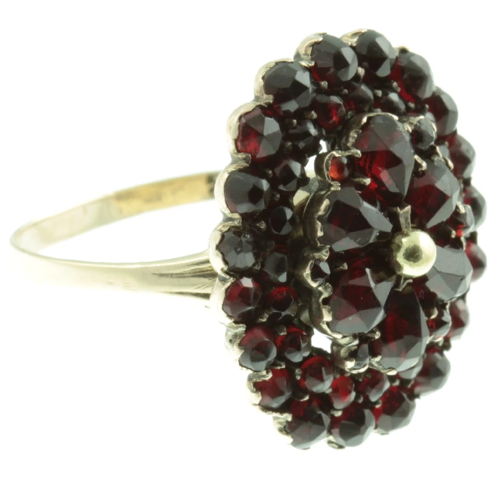 An eye-catching 1940s Retro 8ct Gold Garnet Cluster Ring. Three concentric rows of Garnets have been set in 8ct yellow gold, with a closed back setting and held securely with a central gold pin. 8ct gold was commonly used during world war II in order to stretch supplies of gold, hallmarked 333. A very pretty dress ring.