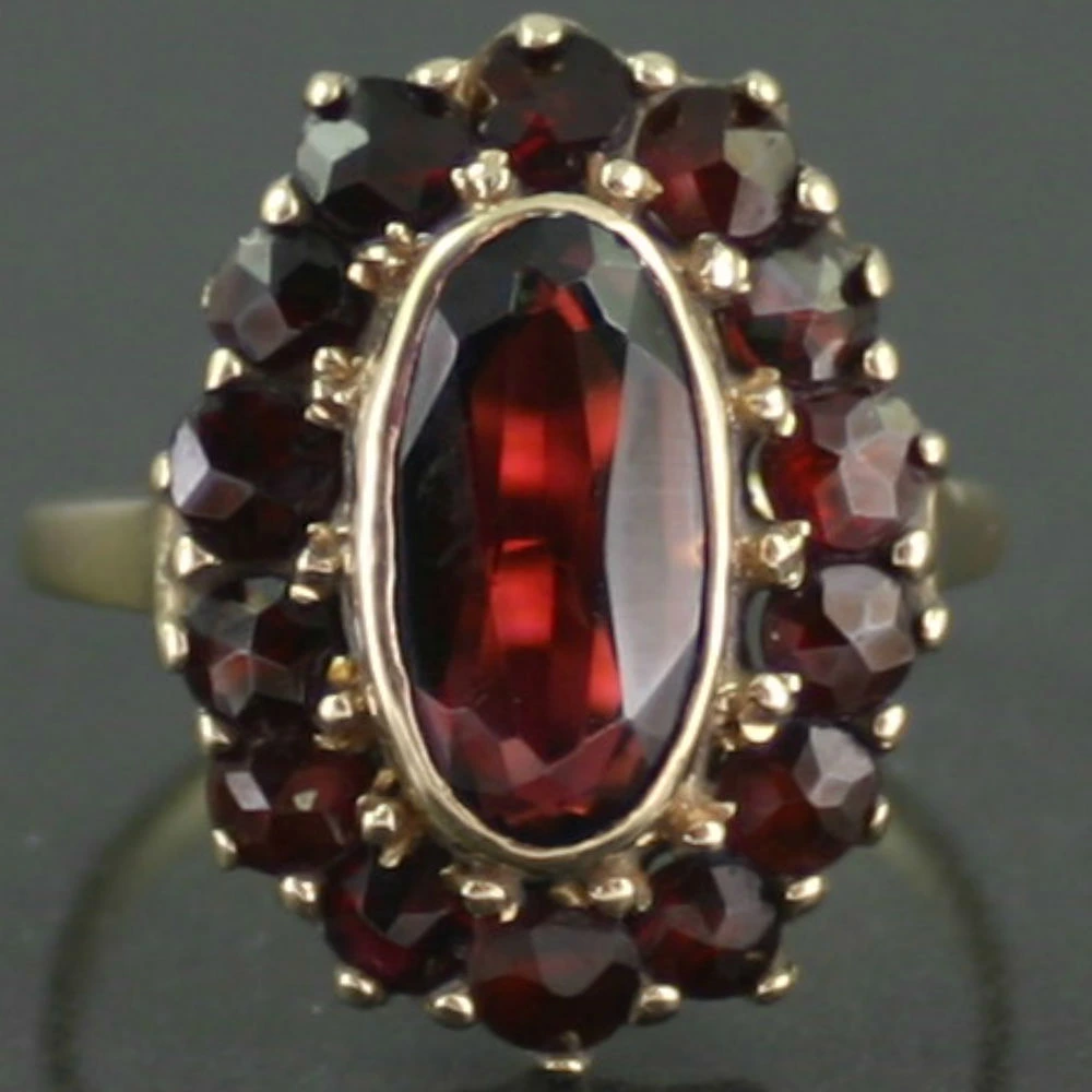 Elongated oval cut garnet gemstone weighing 1.54ct, surrounded by 14 round cut garnets with a combined weight of 84 points and mounted in 8ct yellow gold. Circa 1940s, 8ct gold was commonly used during world war II in order to stretch supplies of gold.