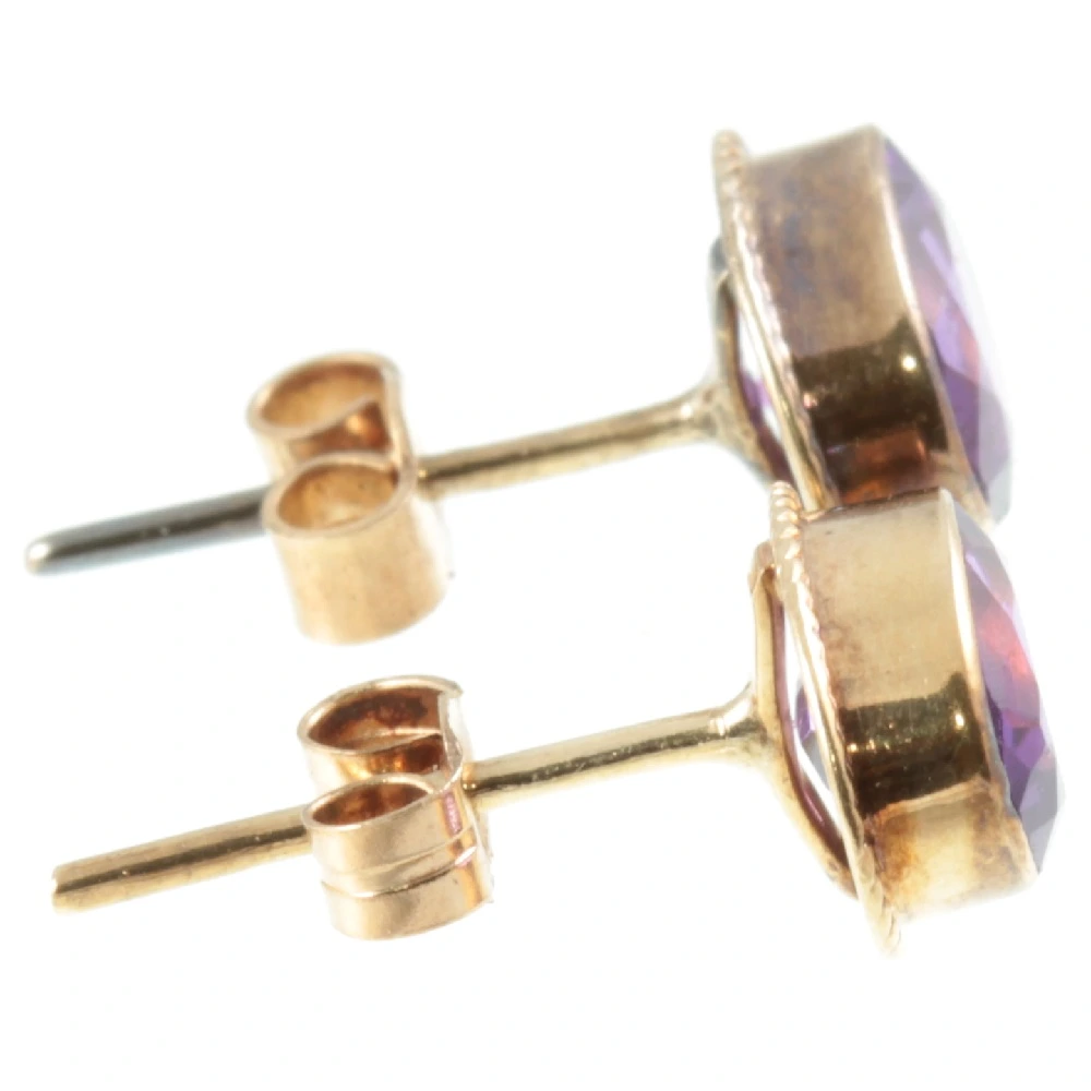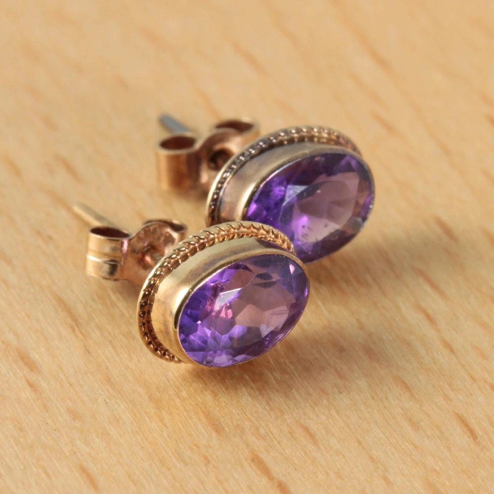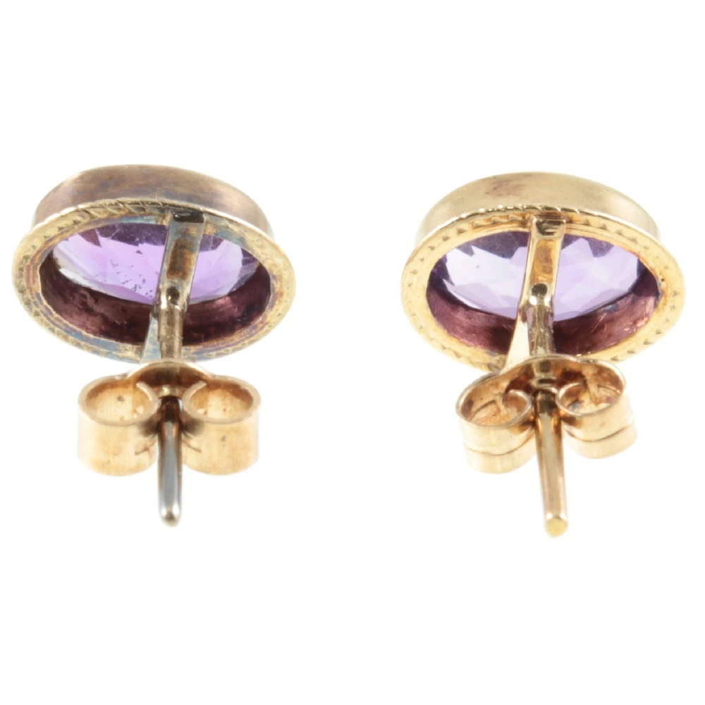A lovely pair of Vintage 9ct gold Amethyst earrings. Oval-cut Amethyst gemstones with a combined weight of 1.12ct have been set in 9ct yellow gold.