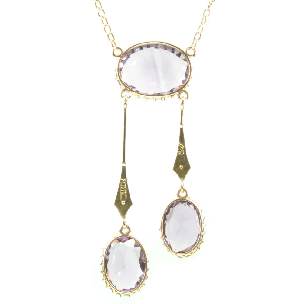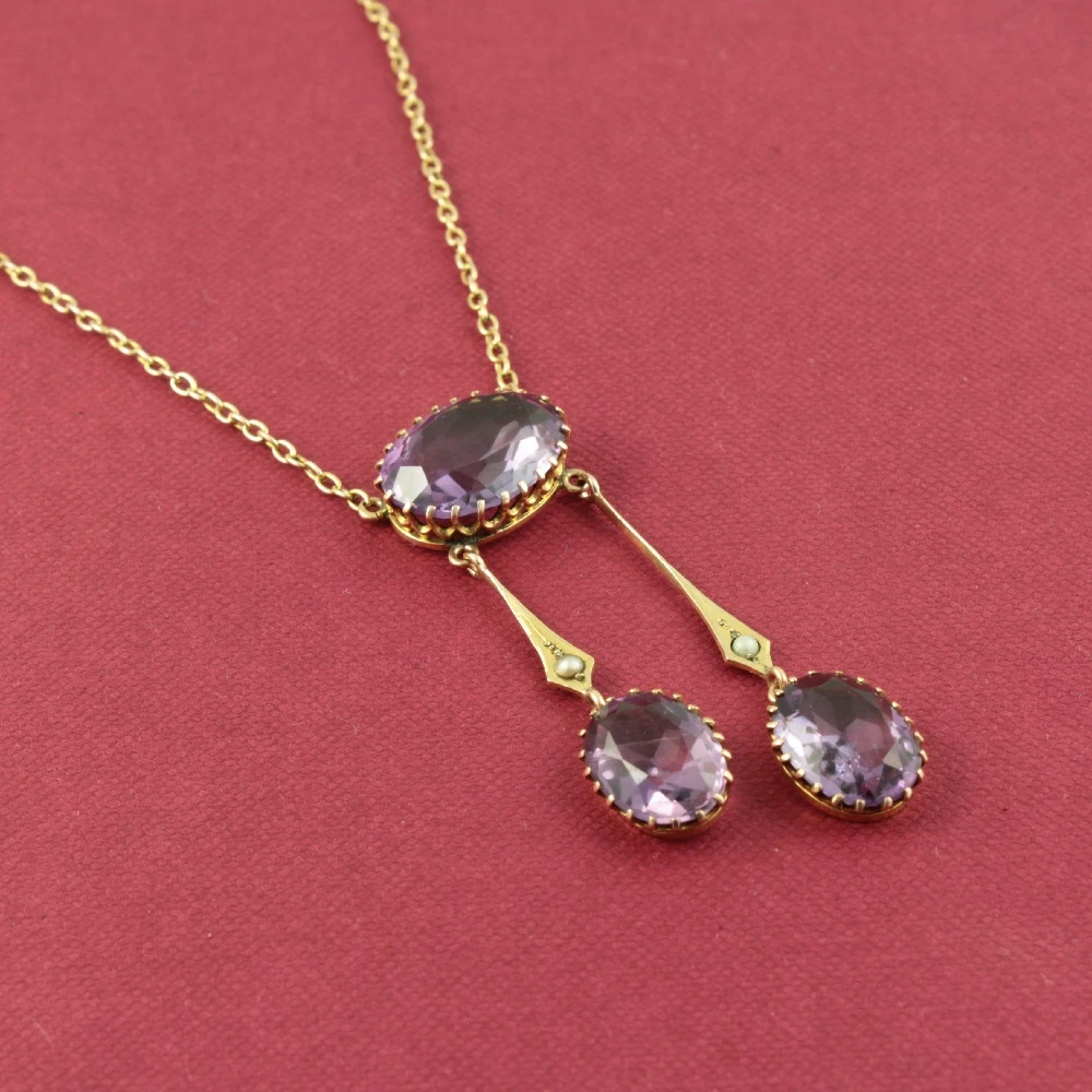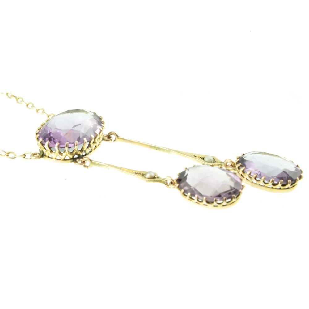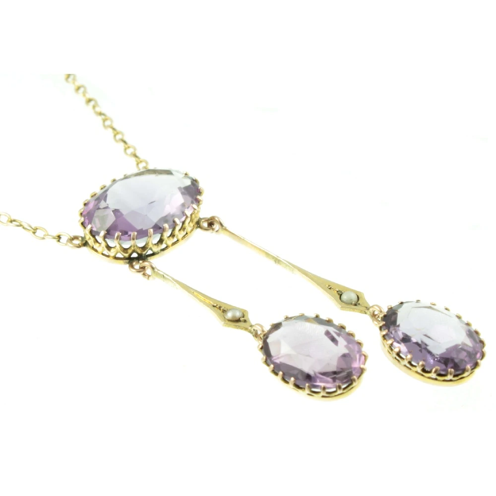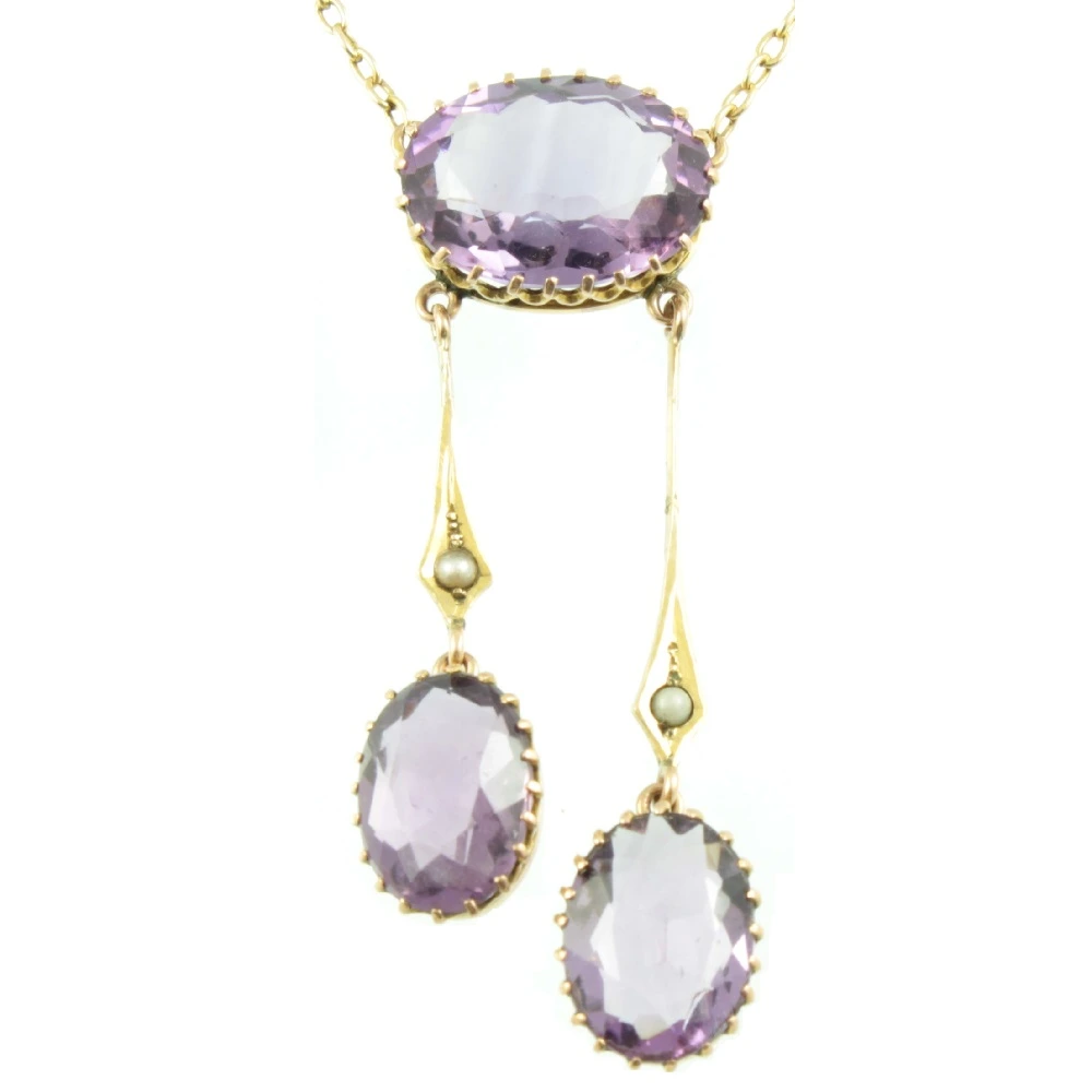 An elegant Edwardian 9ct Gold Amethyst negligee pendant. The central oval cut Amethyst weighing 6.41ct has been securely mounted in an open framework gallery. From which are suspended two smaller oval-cut Amethyst gemstones connected by seed pearl-studded elongated links. Each of these gemstones has excellent clarity and as such caught the light beautifully. A very well-proportioned negligee pendant.