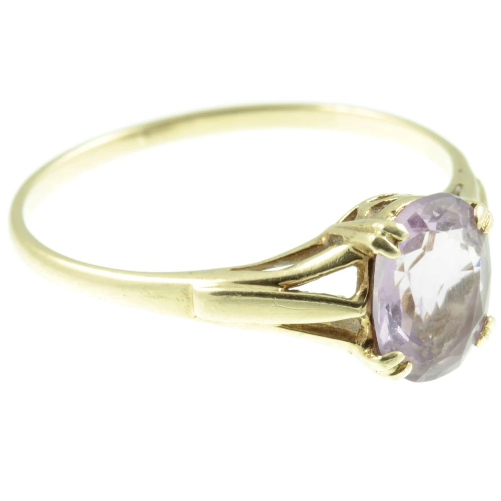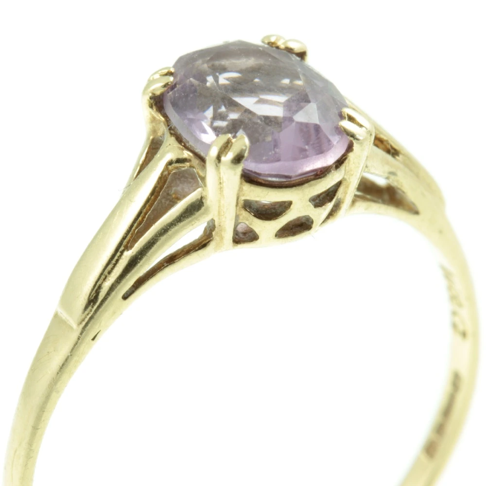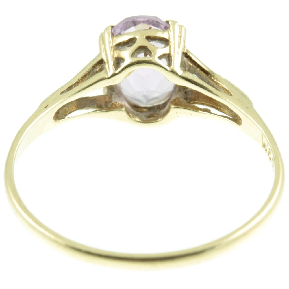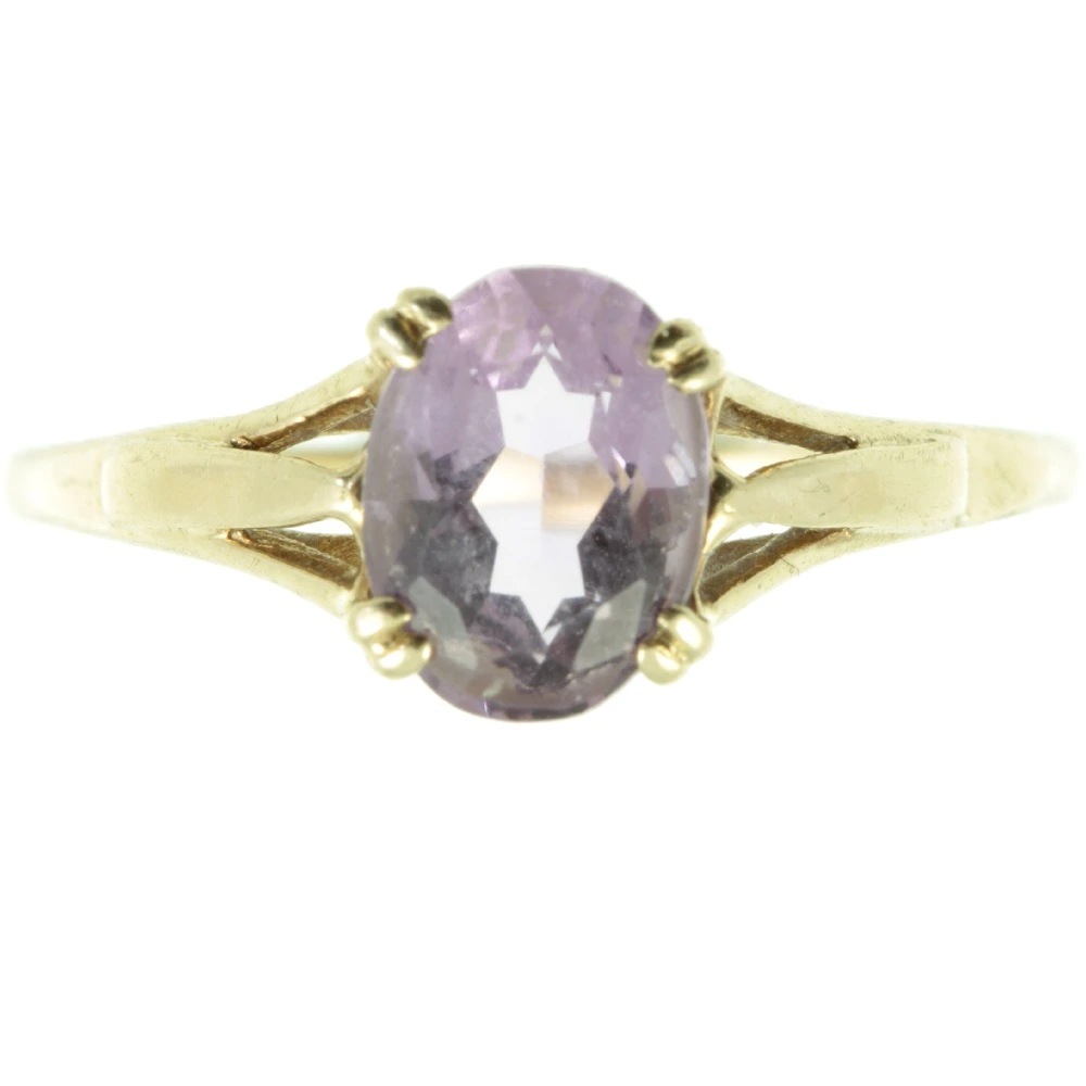A very pretty Vintage Solitaire 9ct Gold Amethyst Ring. An oval-cut Amethyst gemstone weighing 70 points has been set in 9ct yellow gold. This Amethyst has excellent clarity, allowing it to catch the light and sparkle beautifully.