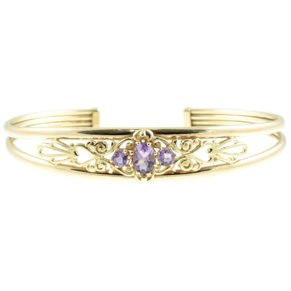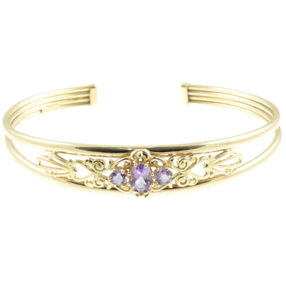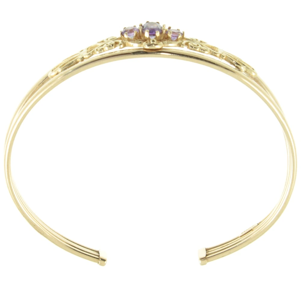 An ornate Vintage 9ct Gold Amethyst torque bangle. A central oval cut amethyst has been set in 9ct yellow gold, with round cut amethyst gemstones to either side. These bright and lively gemstones which have a combined weight of 56 points are raised above an Art Nouveau-style decorative panel. A very pretty vintage torque bangle.