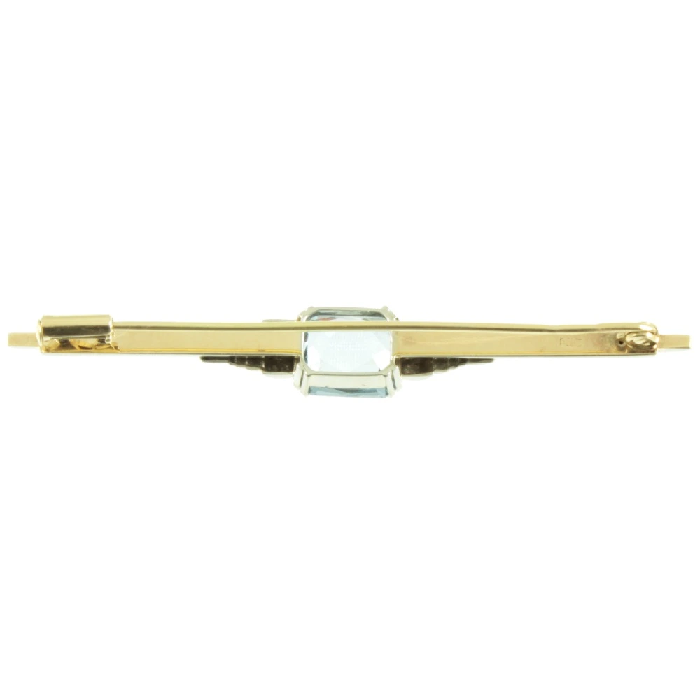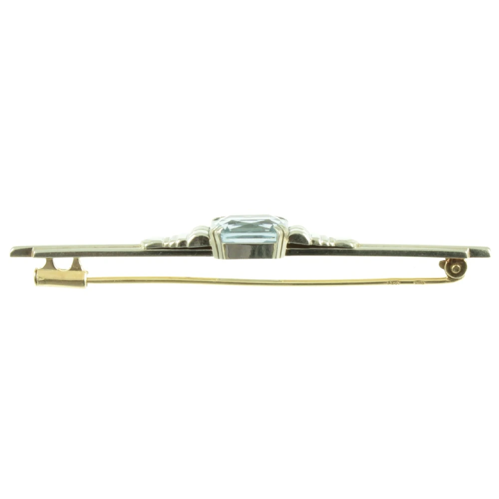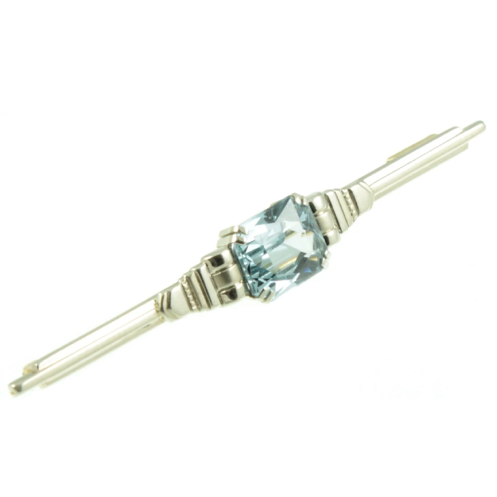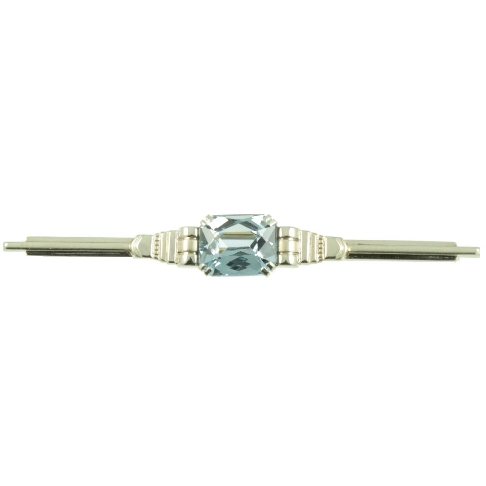 A distinctive Art Deco 9ct Gold Aquamarine brooch. A rectangular-shaped Aquamarine weighing 2ct has been set in 9ct white gold. This scissor-cut aquamarine has excellent clarity and a beautiful colour. Set to either side of the gemstone are white gold geometric shoulders, with the reverse of the brooch being made from 9ct yellow gold. A classic piece of Art Deco jewellery.