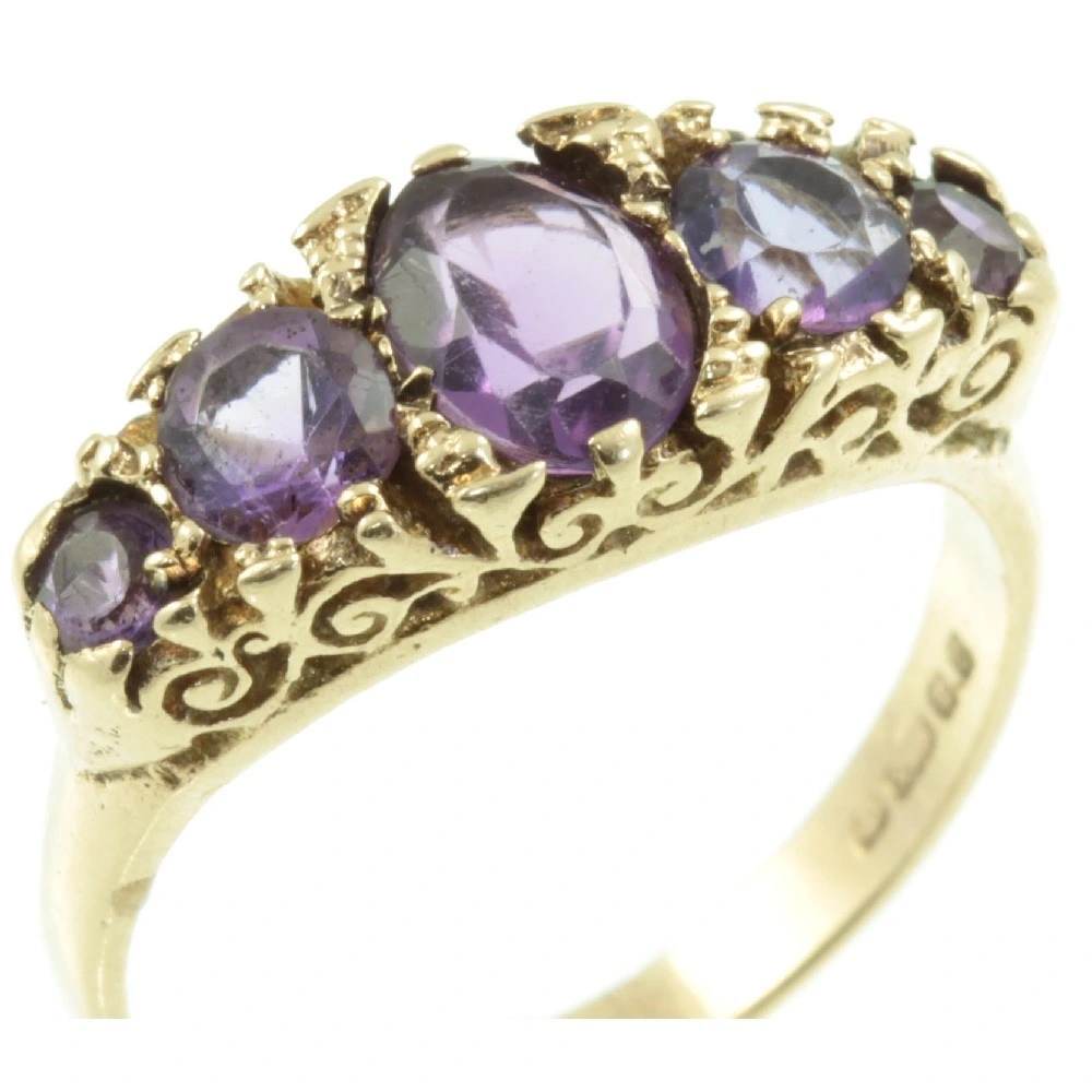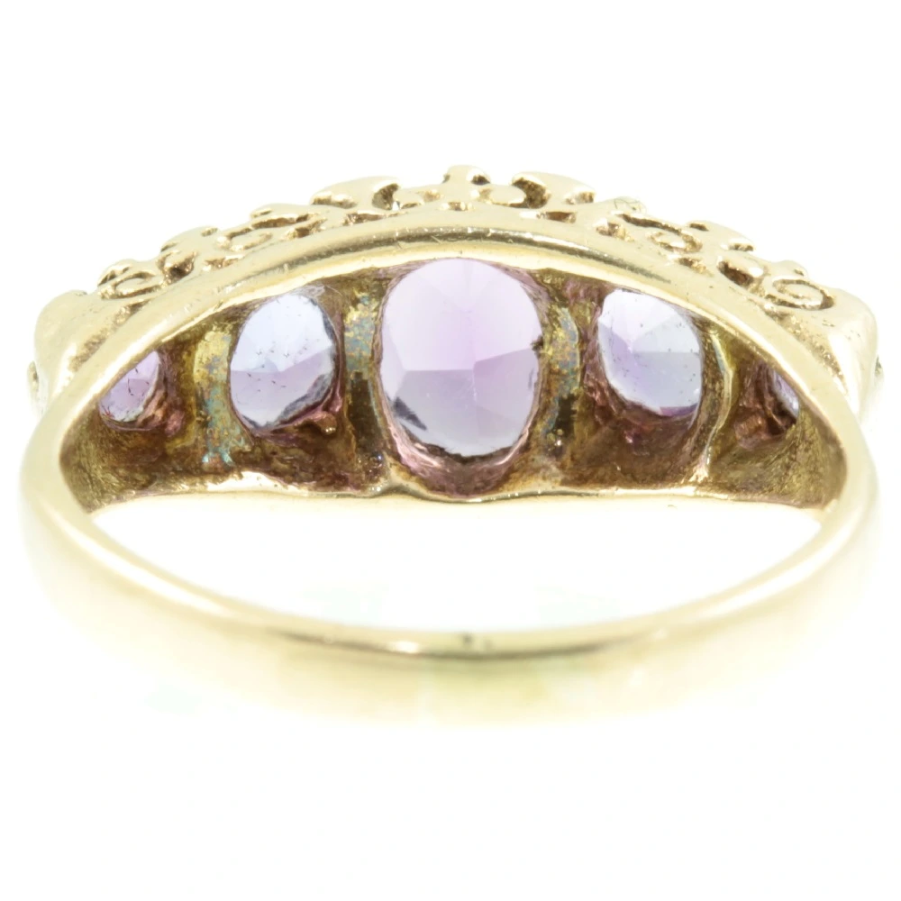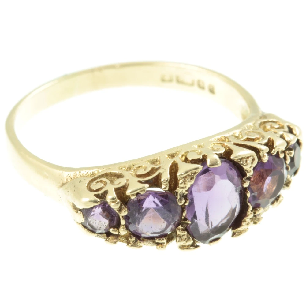 A vibrant Vintage 9ct Gold five stone Amethyst ring. Graduated Amethyst gemstones weighing 1.28ct have been set in 9ct yellow gold. These gemstones have excellent clarity which makes them look bright and lively when worn. This beautiful vintage ring is hallmarked for 1977.