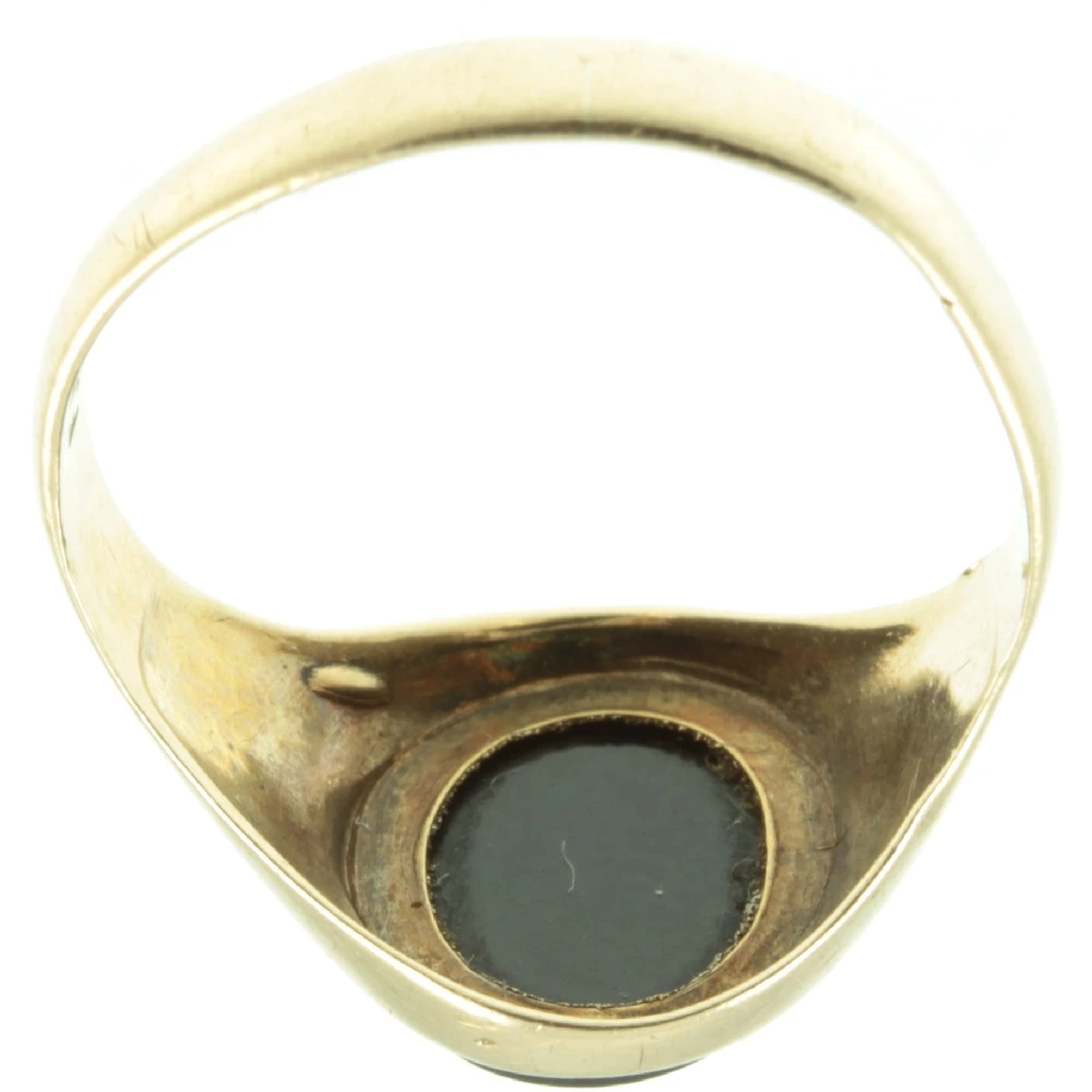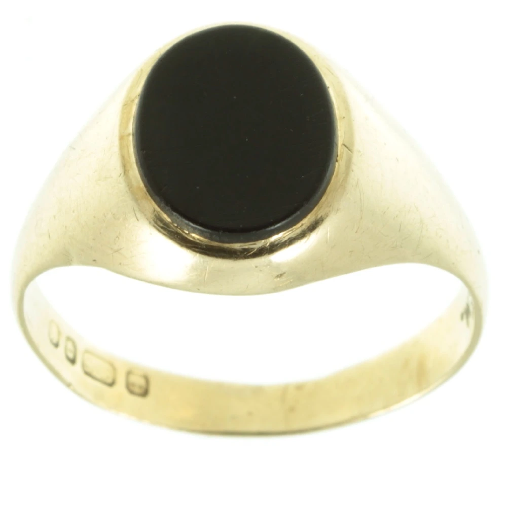 A classic Vintage 9ct gold onyx signet ring. An oval-cut black onyx gemstone set in rich 9ct yellow gold, creating a beautiful contrast between the gold and black. This is a traditional and timeless gentleman`s ring.