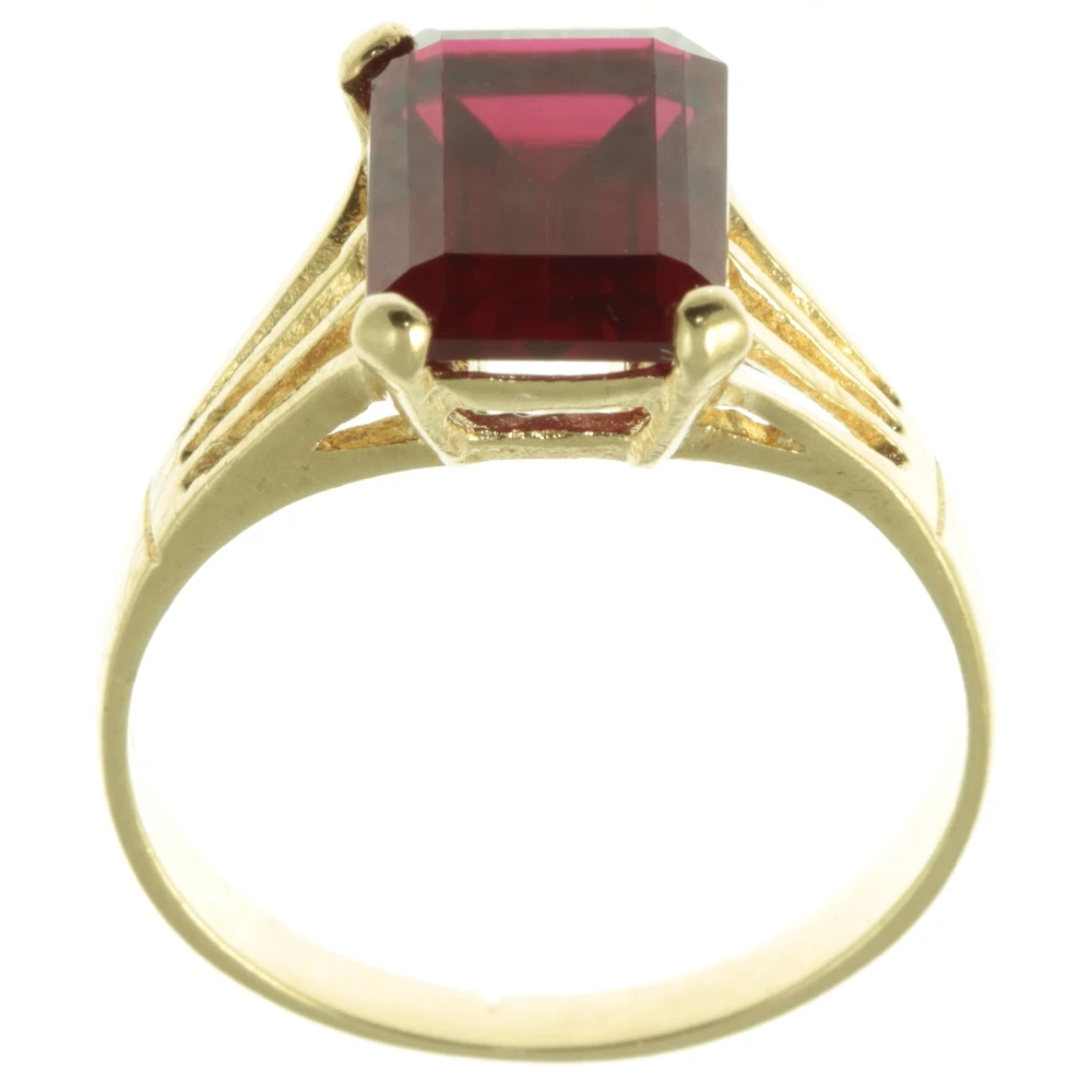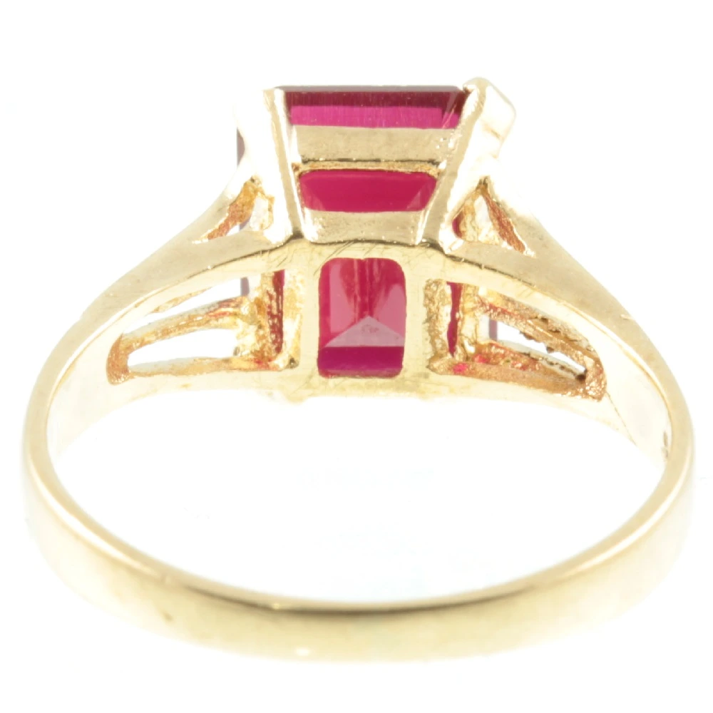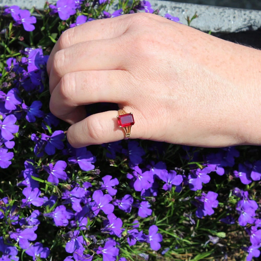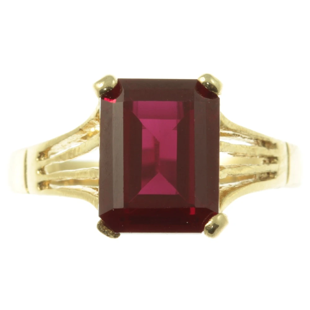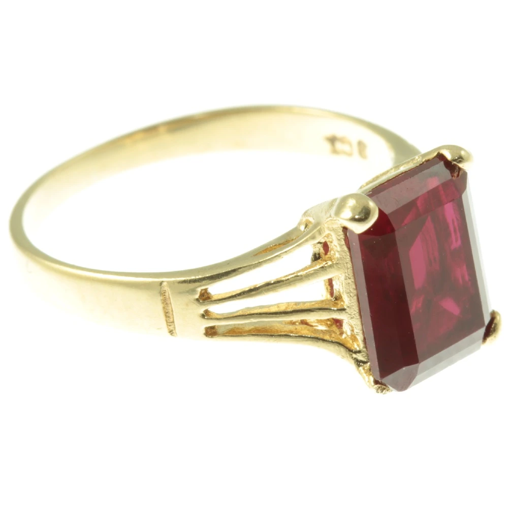 A Vintage 9ct Gold Ruby Ring. The rectangular-cut Ruby gemstone weighing 2.62ct has been set in 9ct yellow gold, with splayed open framework shoulders. This Ruby has a beautiful depth of colour and looks quite tasteful when worn.