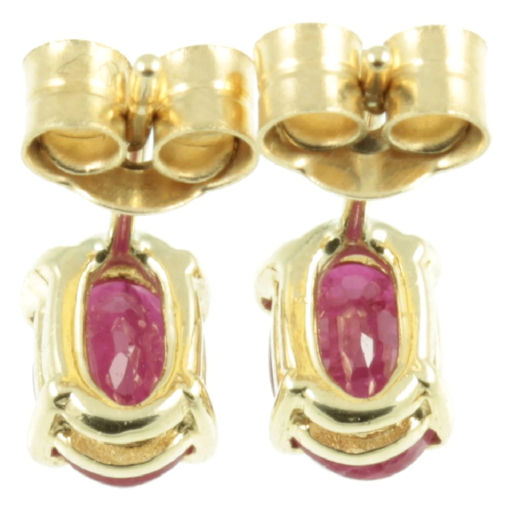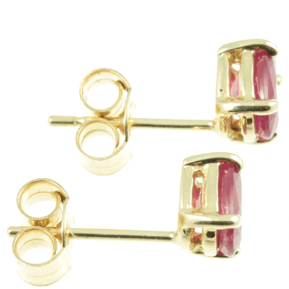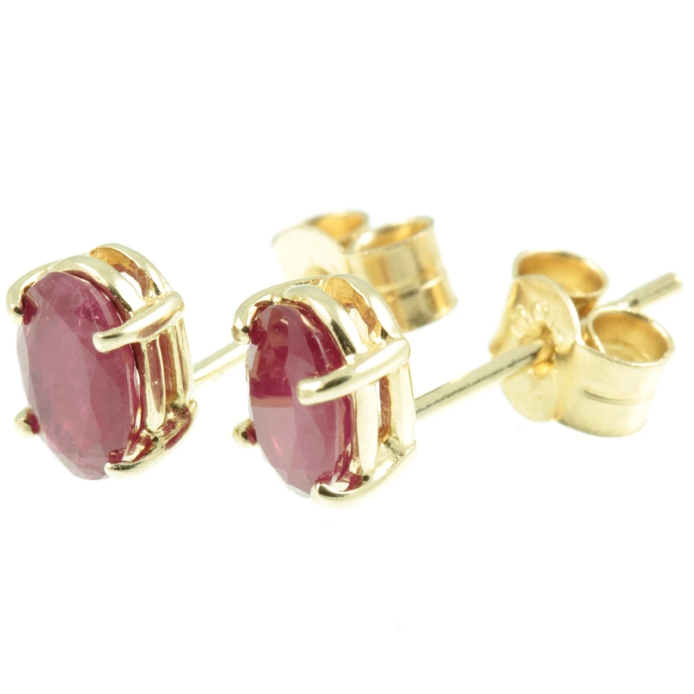 A pair of classic Vintage 9ct Gold Ruby Stud Earrings. Two oval cut ruby gemstones with a combined weight of 1.16ct set in 9ct yellow gold. Ruby is July`s birthstone, symbolizing love and passion. These tasteful earrings are an unwavering jewellery box favourite.