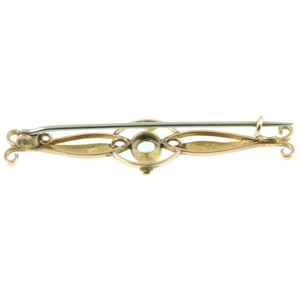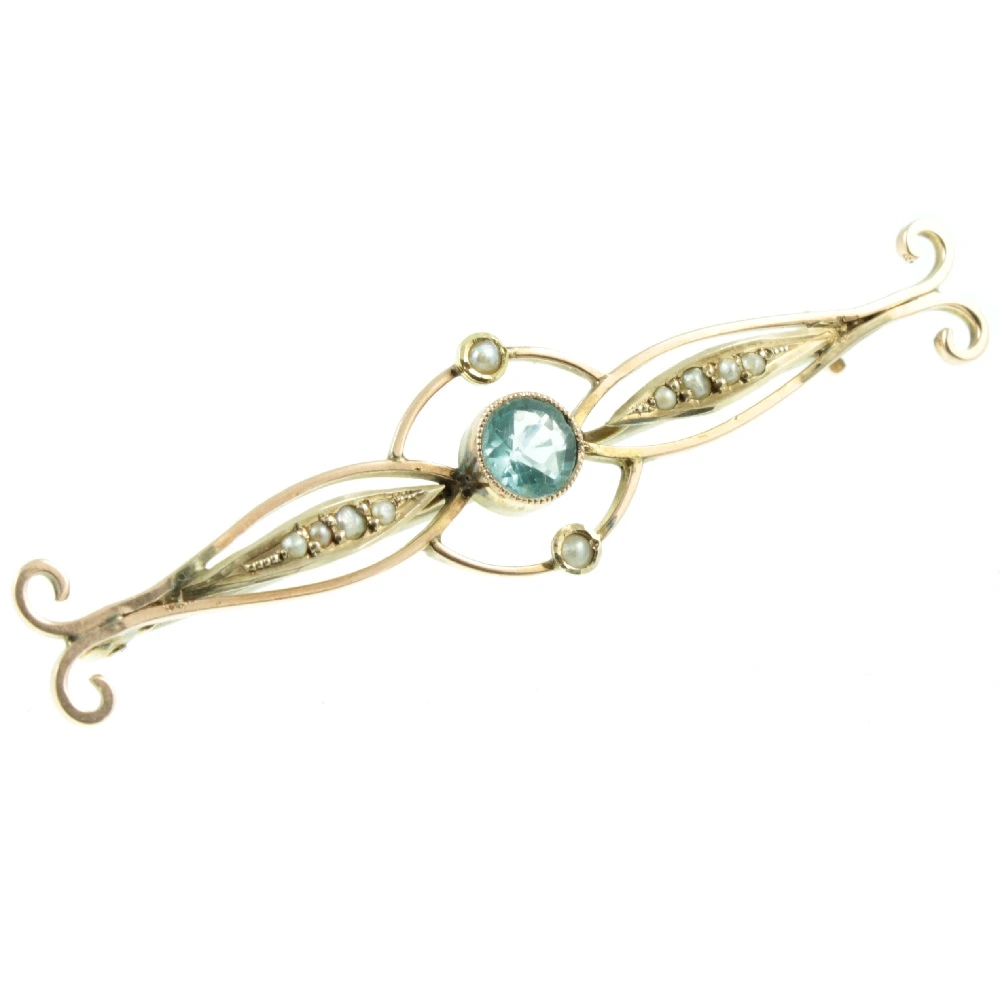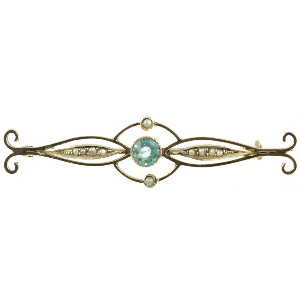 A very pretty Edwardian 9ct Gold Topaz brooch. A round-cut Topaz gemstone weighing 58 points has been set using a bezel setting, which is finished with a milgrain border. Two split pears orbit around this central Topaz, with split pearl detailing to either side, finishing in scroll finals. A fine example of Edwardian craftsmanship.