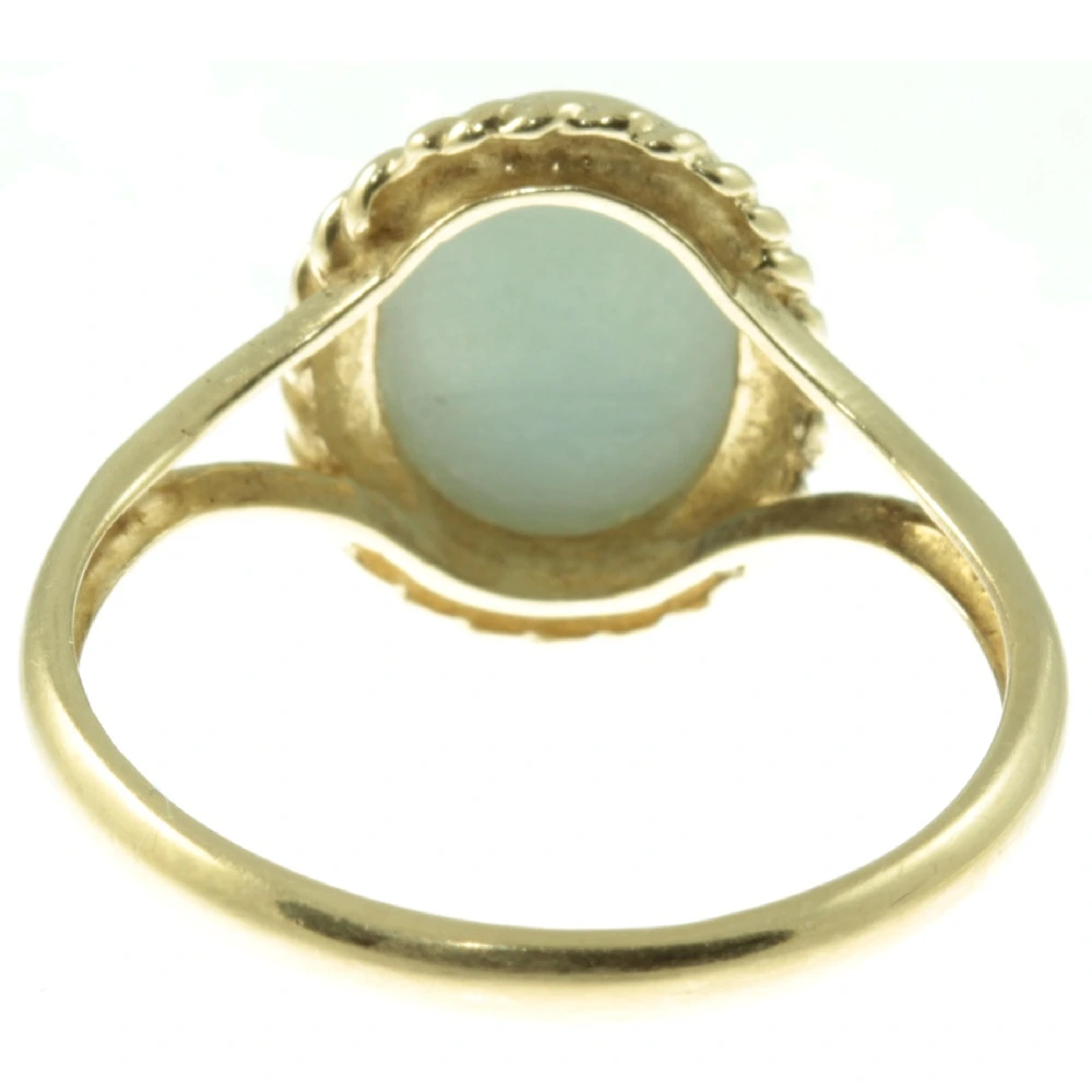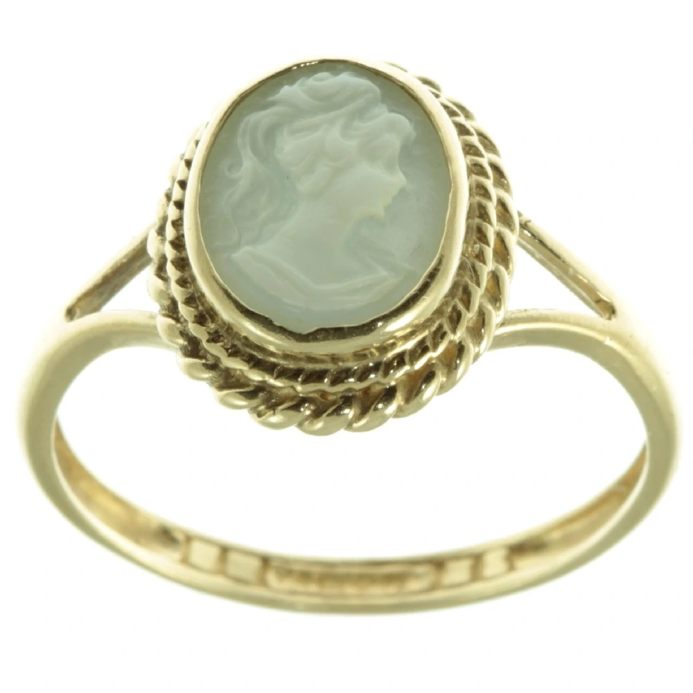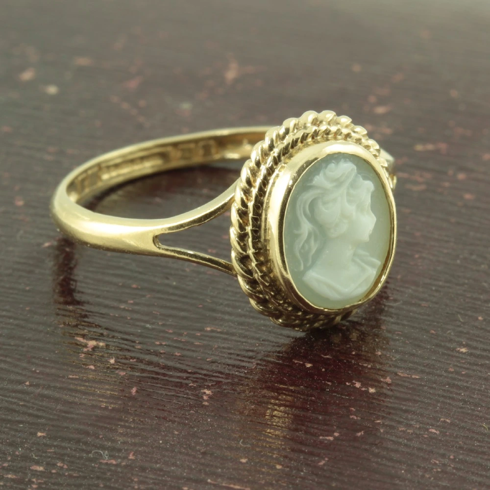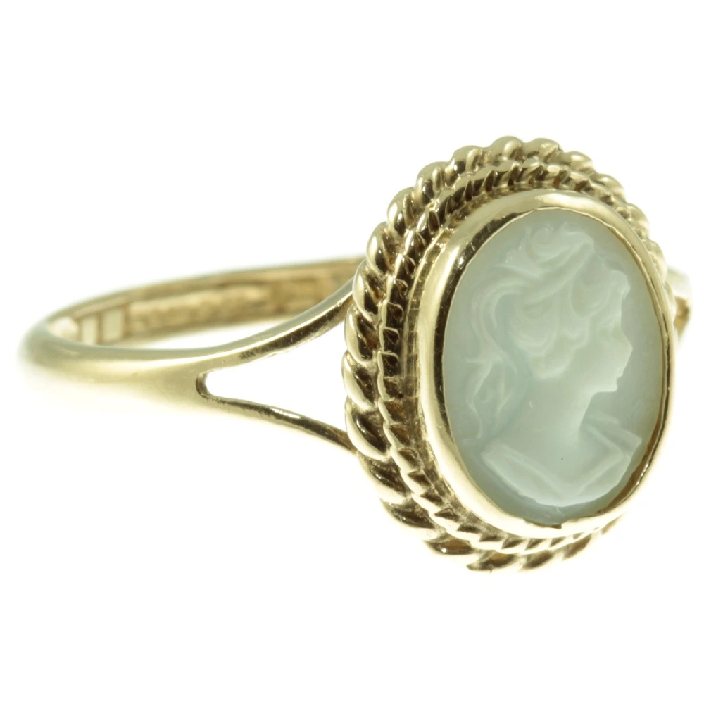 A pretty 9ct Gold Vintage Cameo Ring. This precisely craved cameo has been set in a 9ct gold bezel setting and surrounded by a double twist rope border, with bifurcated shoulders. A classic Victorian-style cameo ring.