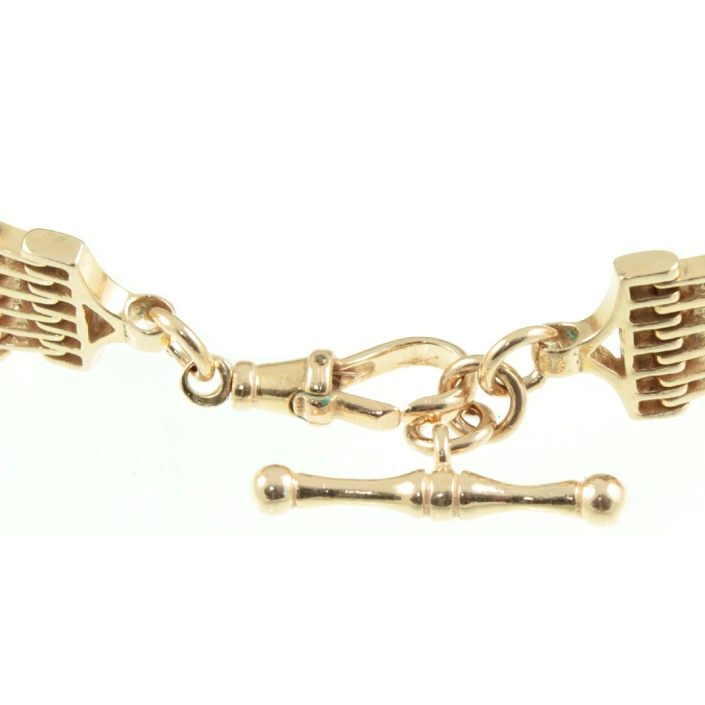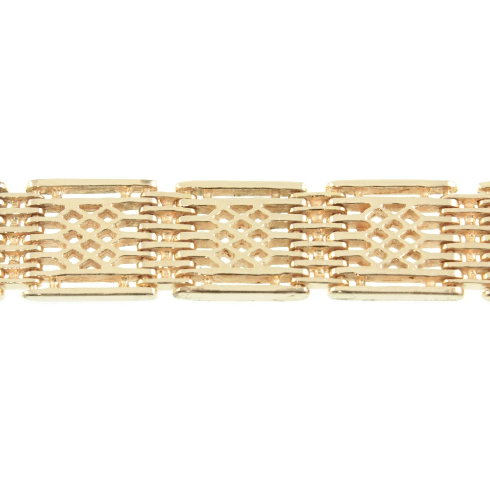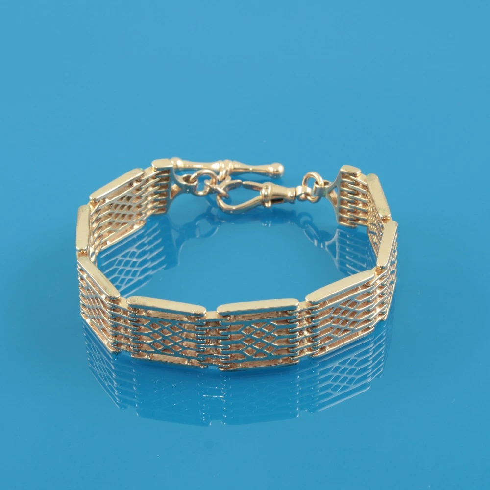 A fabulous Victorian 9ct Rose Gold gate bracelet. Made from 9ct rose gold, each seven-bar high panel contains a geometric design and are connected via articulated links. A very desirable Victorian bracelet, which has a beautifully weighted feel to it when worn.