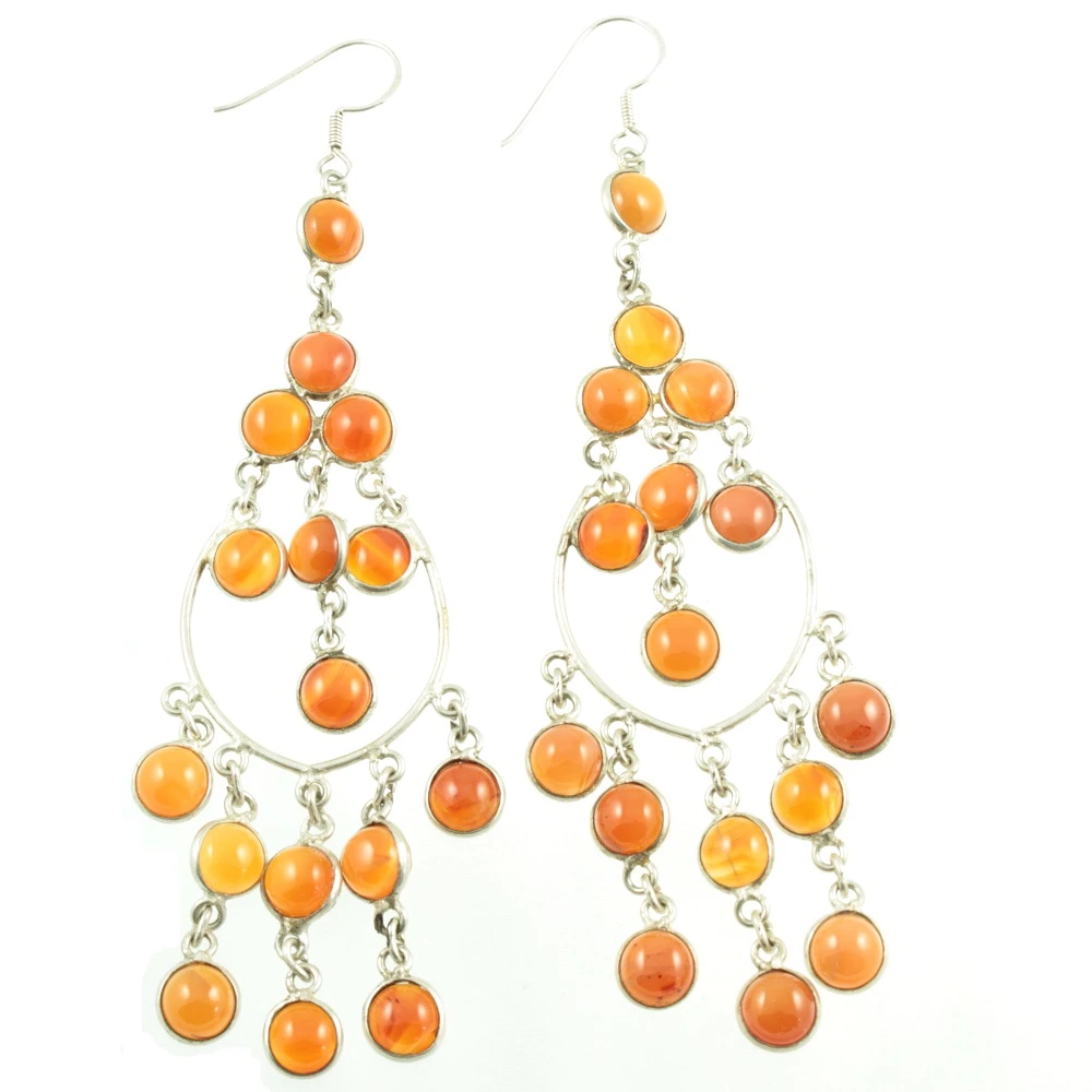 An impressive pair of Vintage Red Agate Chandelier Earrings. Round-cut cabochon red agate gemstones have been set in silver using a rub-over setting. These bright agate gemstones are very evenly matched and produce a beautiful fluid cascading effect when worn.