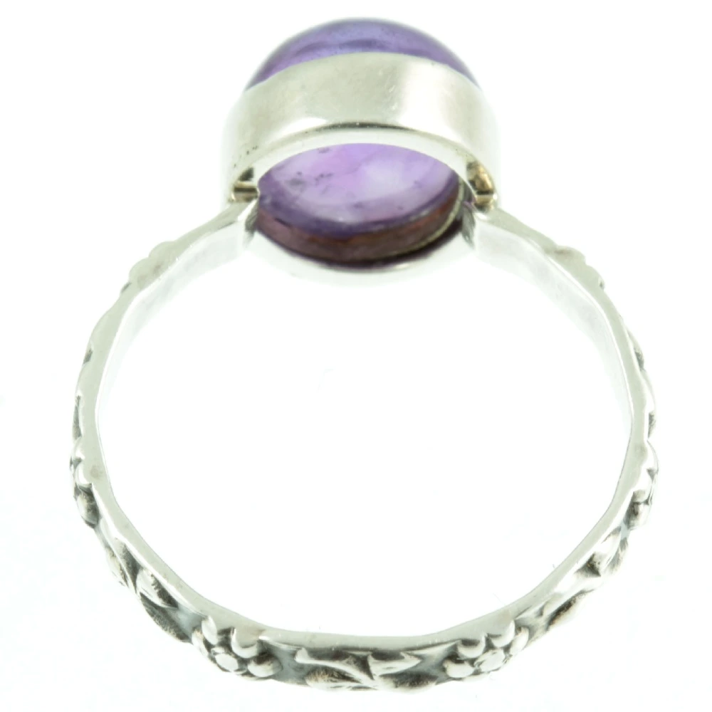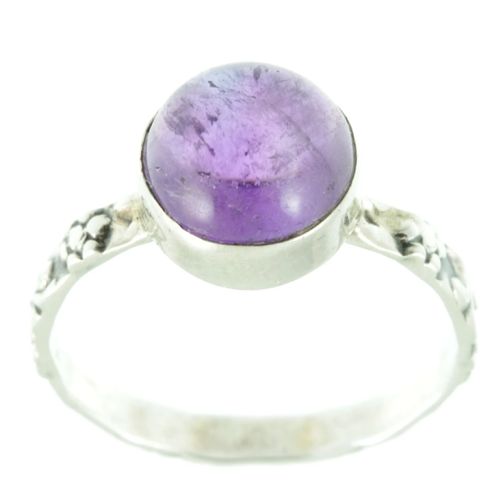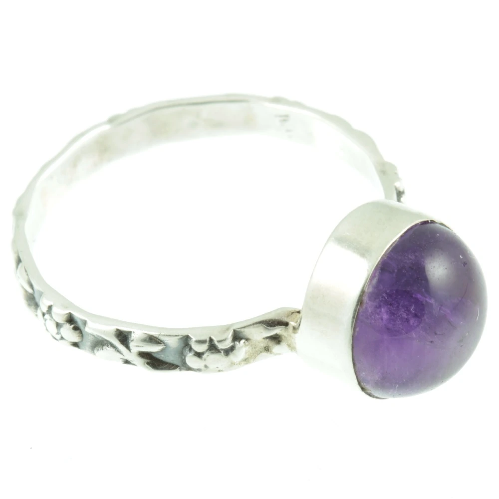 A pretty Vintage Amethyst and Decorative Silver Ring. A polished round-cut cabochon amethyst gemstone weighing 2.60ct is mounted in a rub-over setting. With the band been decorated with raised relief floral motifs, producing both a textured feeling to the band as well a visual contrast. A well-made and wearable piece of vintage jewellery.