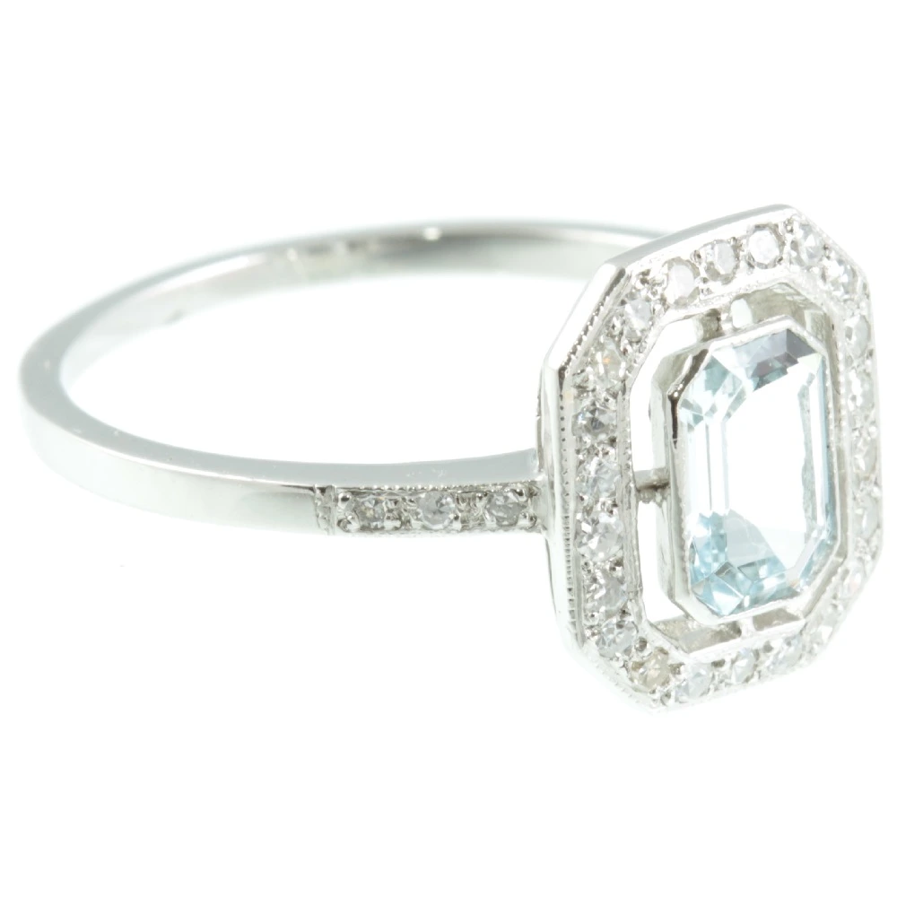 An exquisite Vintage Aquamarine and Diamond Halo ring. The central stone is an emerald-cut aquamarine measuring 72 points, set in a platinum bezel setting. This Aquamarine has excellent clarity and as such reflects the light beautifully. Stepped out surrounding the central stone is a halo of 22 diamonds, finished with a milgrain border. There are a further three diamonds set on each shoulder, ensuring this stunning ring sparkles from every angle.