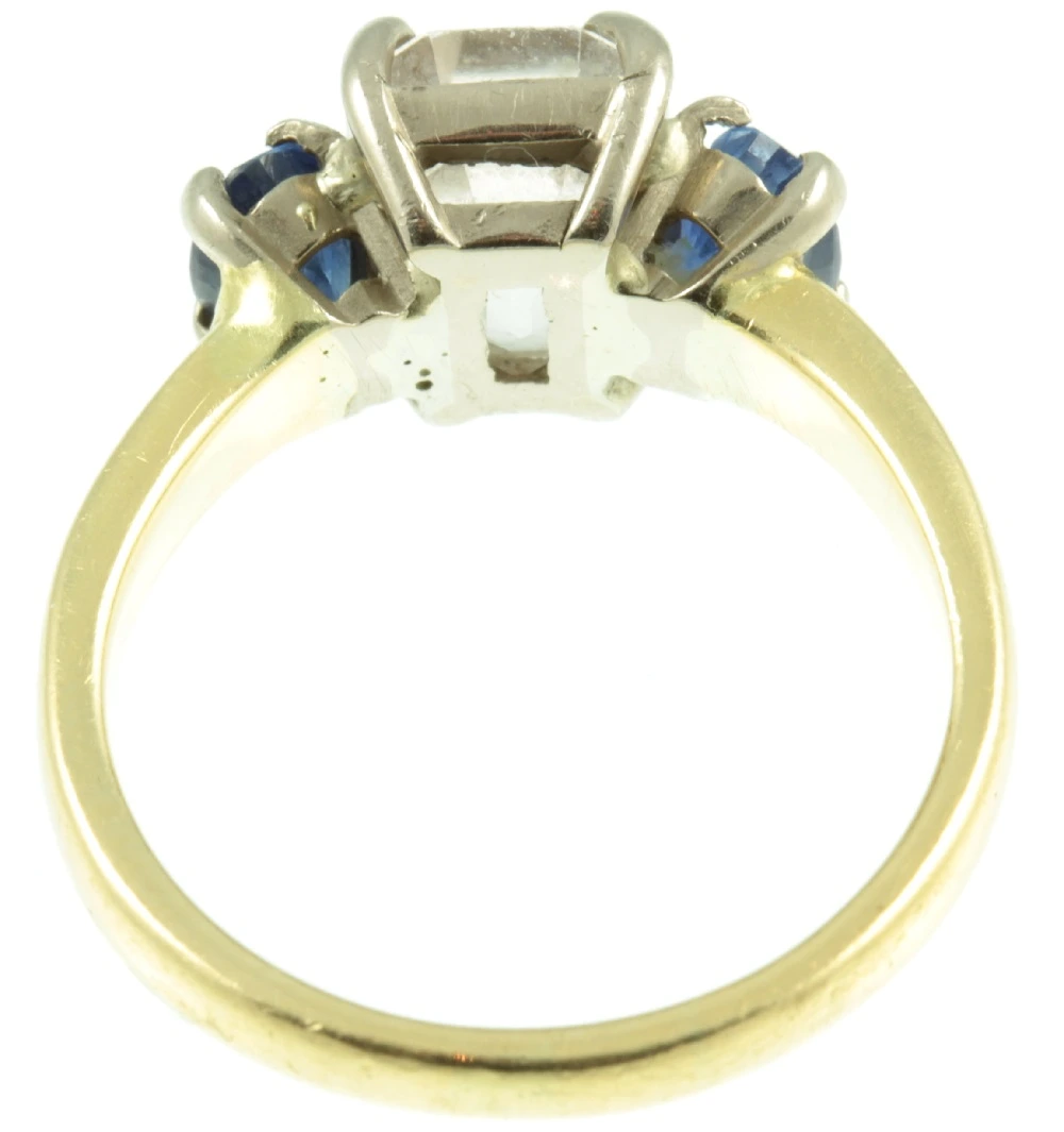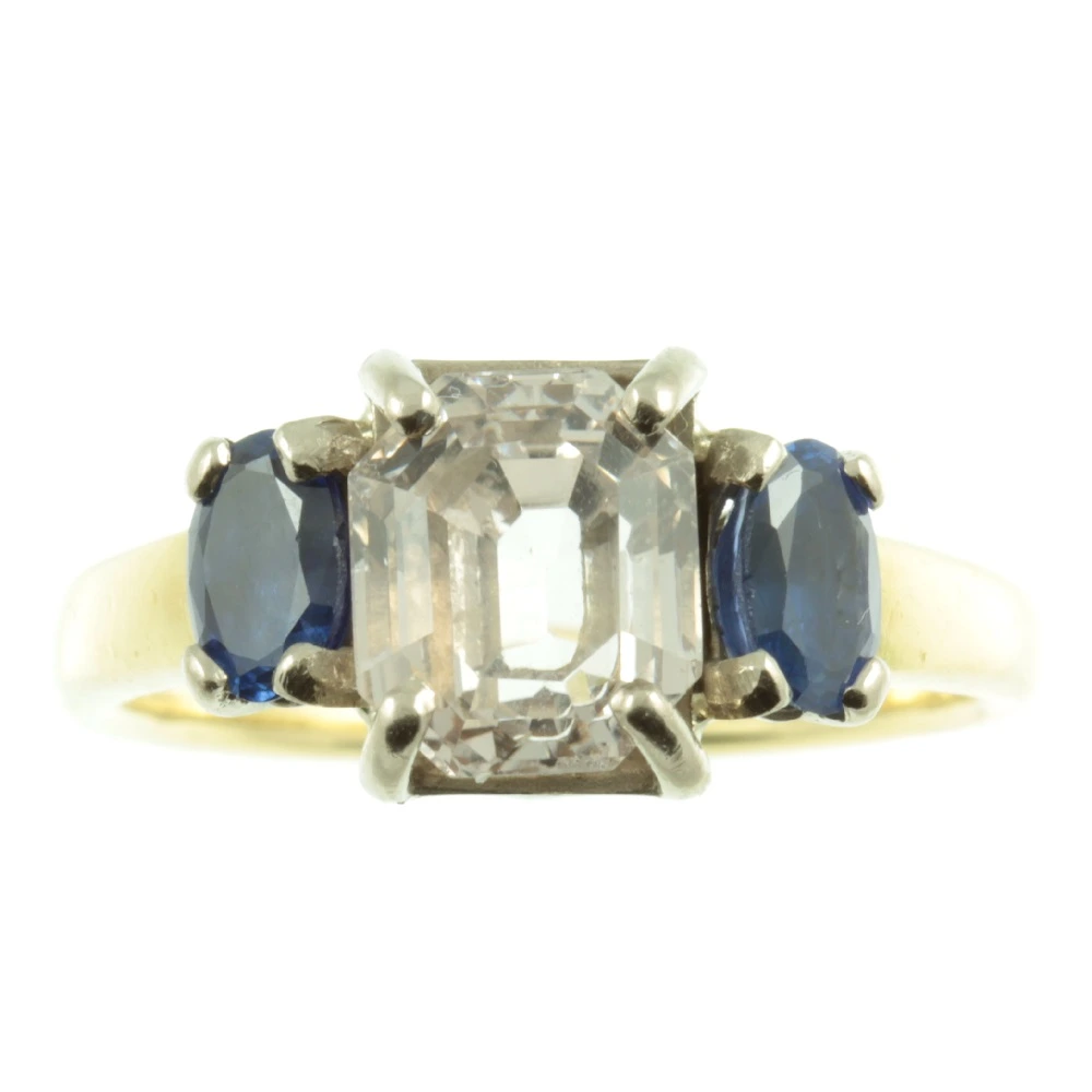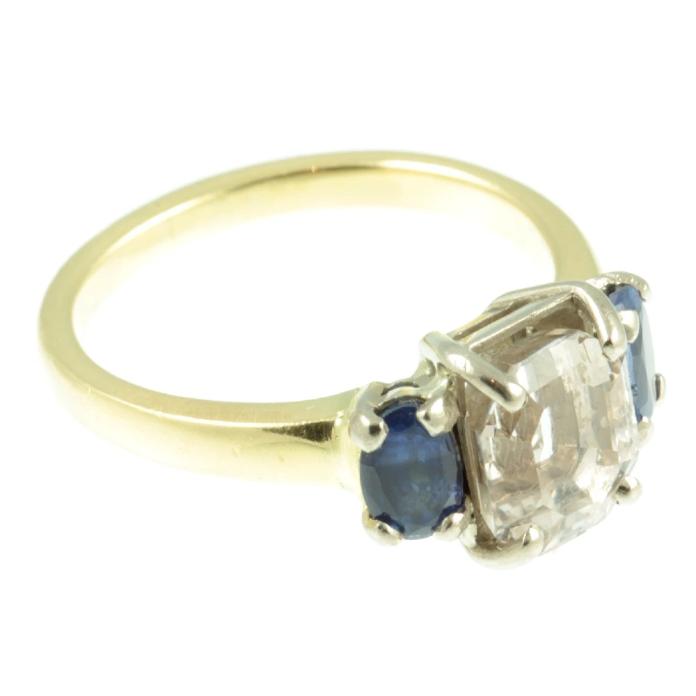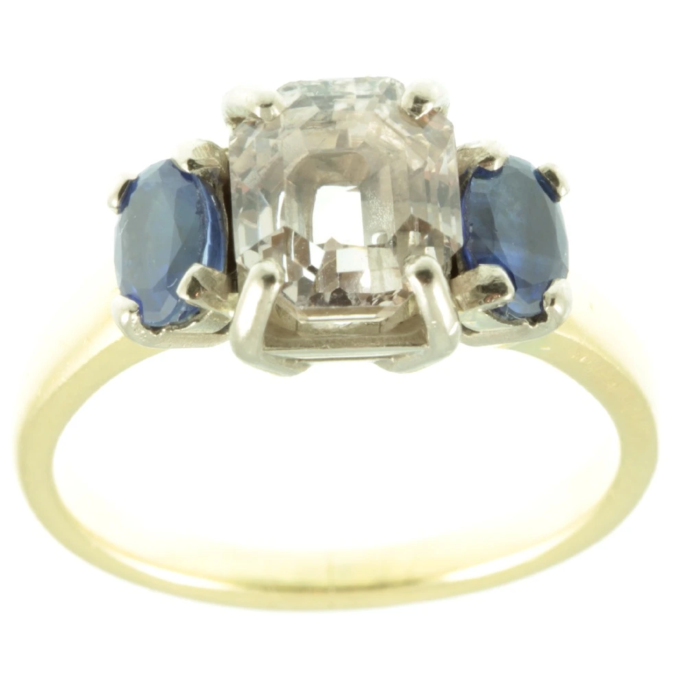 A fabulous Art Deco 3 Stone Sapphire Ring. The featured stone is a gorgeous pink sapphire measuring 3 carats set in luxurious 18ct white gold by means of a secure claw setting. This Asscher cut pink sapphire has excellent clarity and catches the light beautifully. It is flanked on each side by an admiral blue oval cut sapphire, which have a combined weight of 1.20ct. Both of these side sapphires are very well-matched and have beautiful colour saturation. Like the main stone, these admiral blue sapphires are set in 18ct white gold with claw settings. While the band is made from rich 18ct yellow gold. This ring represents quintessential elegance and sophistication.
