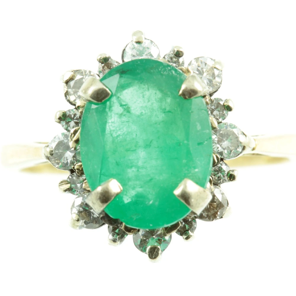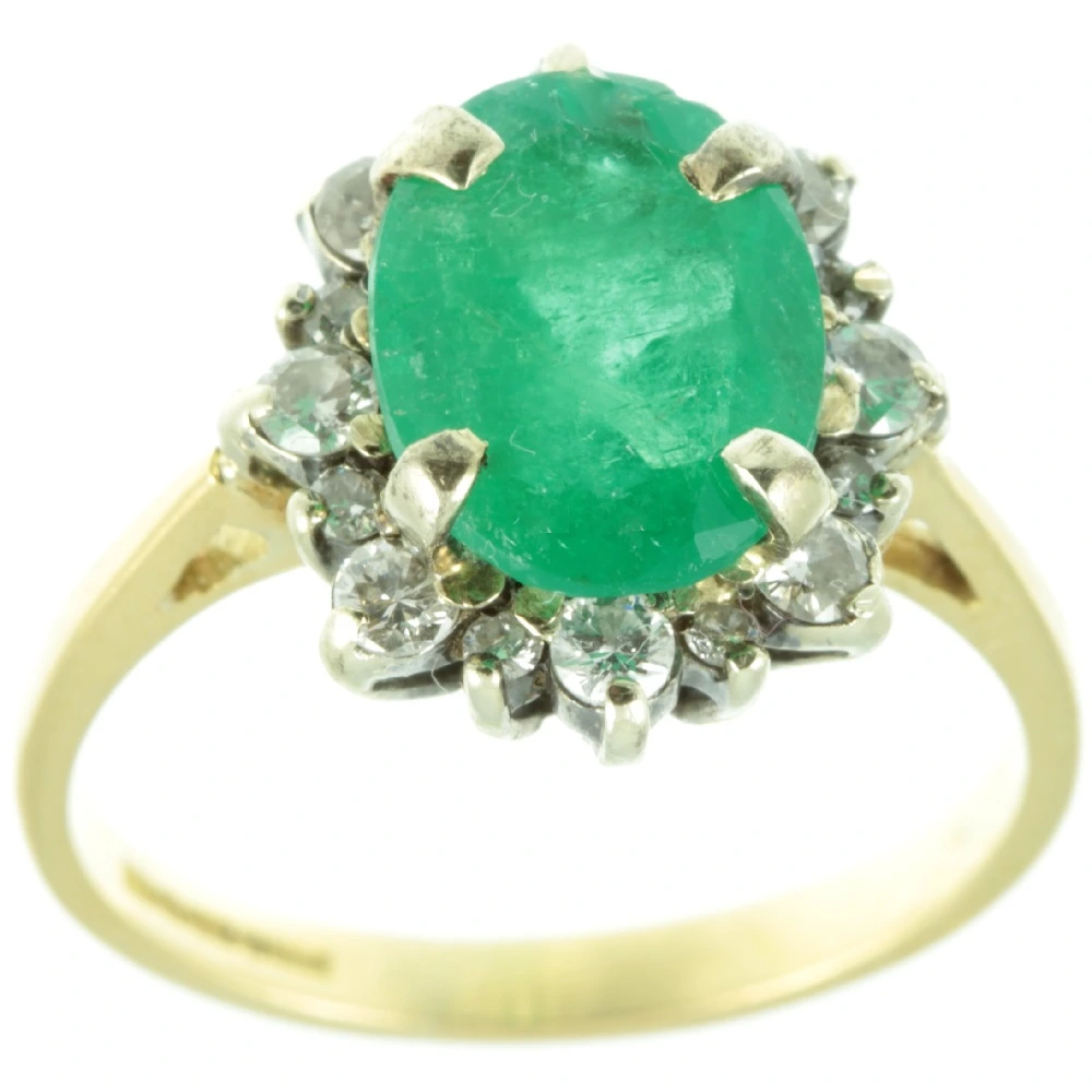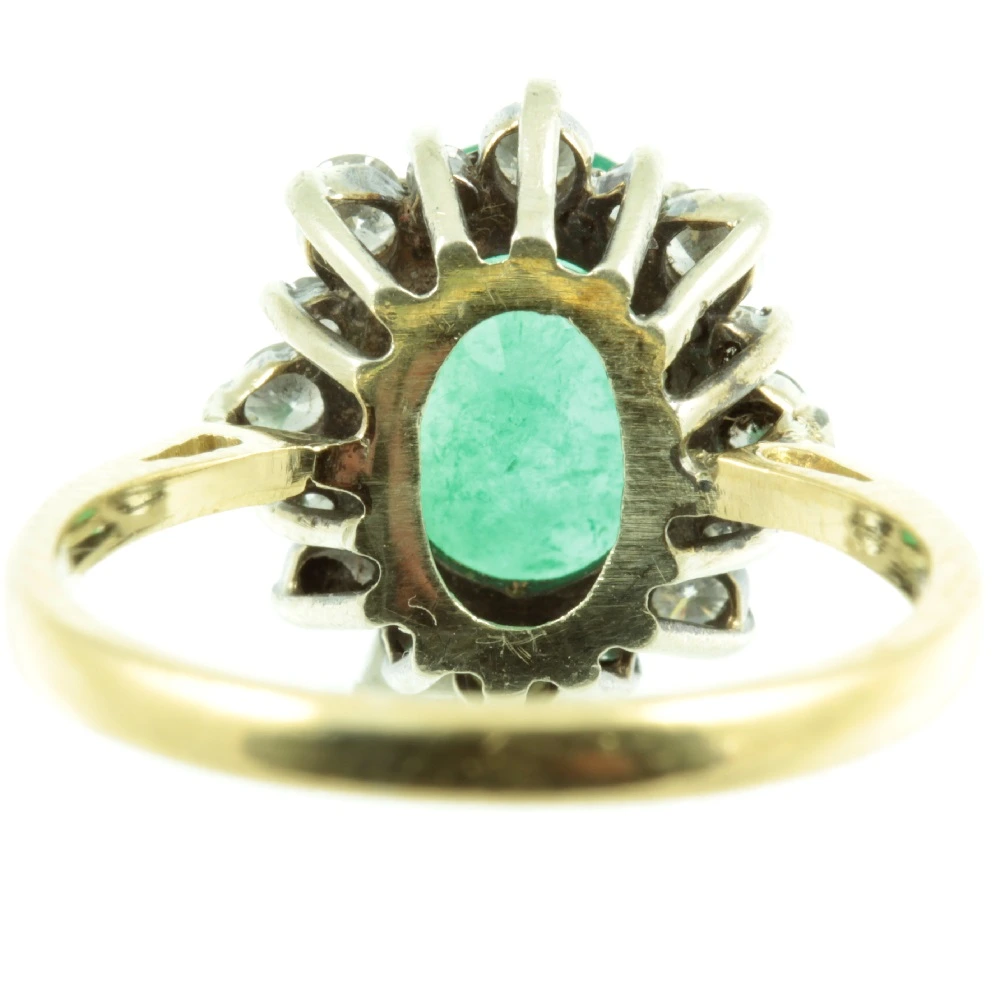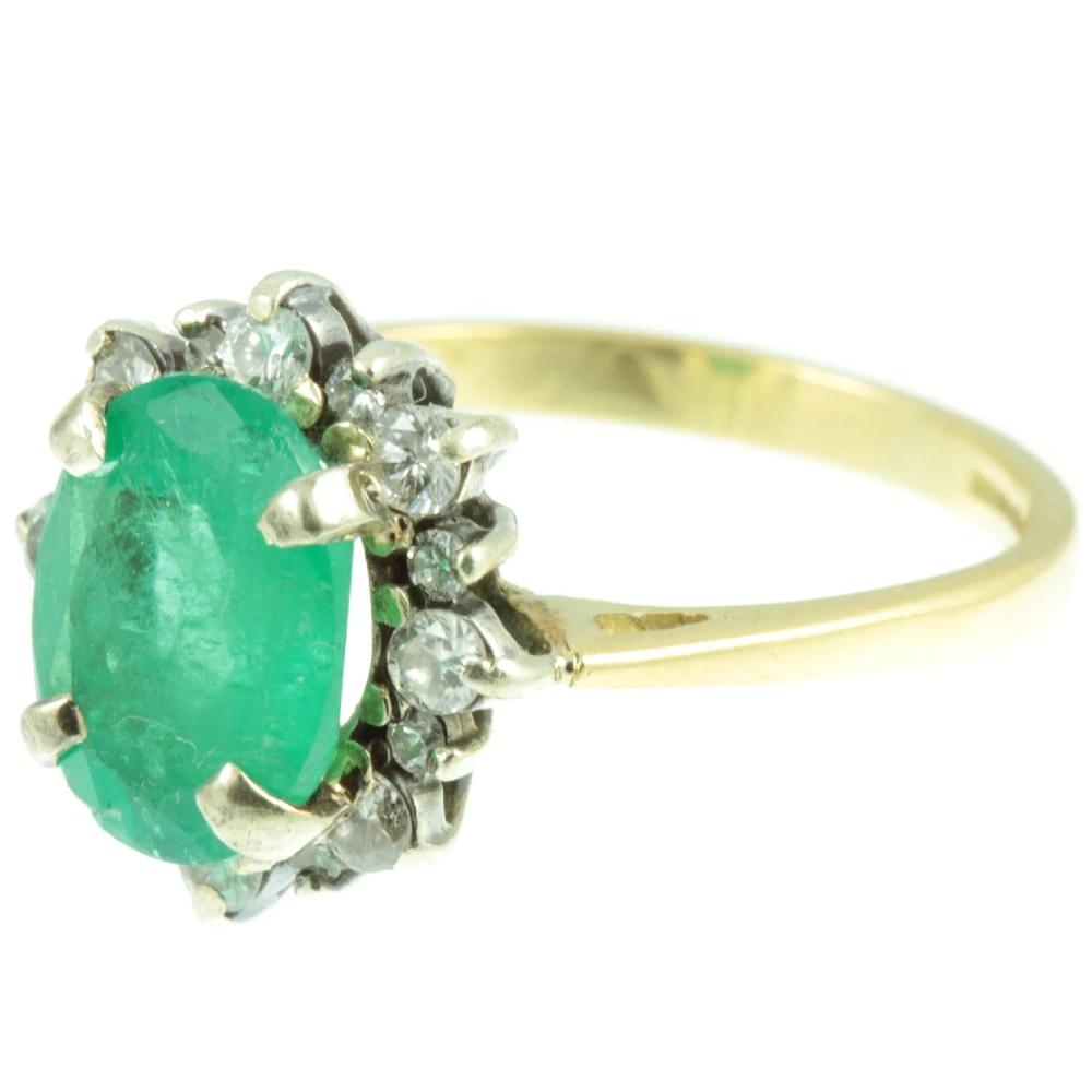 A fine Art Deco Emerald and Diamond Ring. This bright and lively emerald gemstone weighing 1.57 ct is mounted using a secure claw setting. Surrounding is 16 round-cut brilliant diamonds, that have a combined weight of 0.48 ct. All of these diamonds are very evenly matched and have excellent clarity, producing a beautiful sparkle as they catch the light The diamonds are secured with claw settings and are raised up on an 18ct white gold prong setting. While the band is of made rich 18ct yellow gold, creating a beautiful contrast. A beautifully designed and very well-made ring.