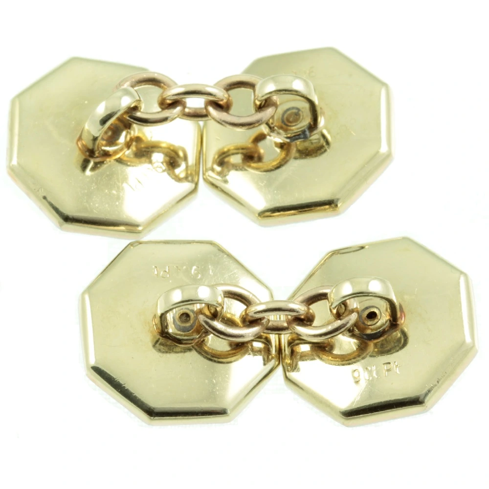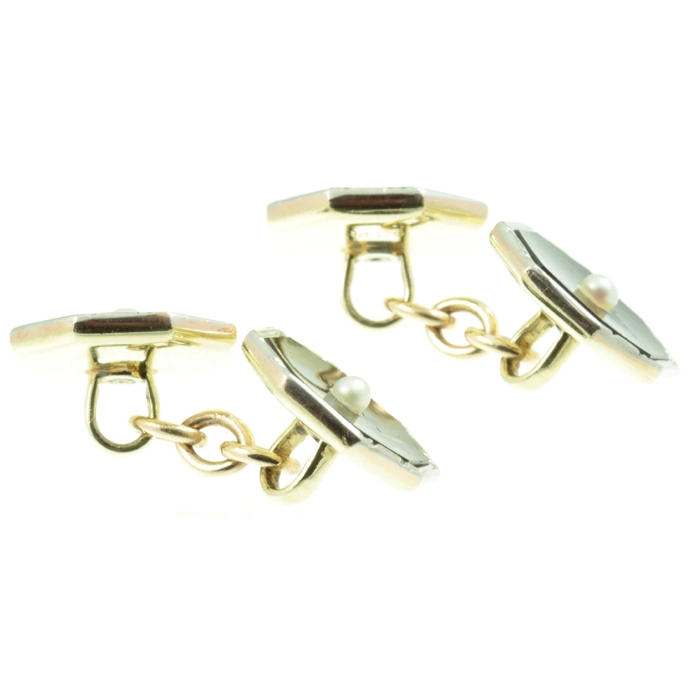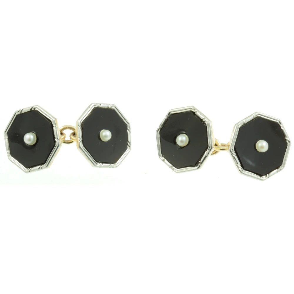 An exquisite pair of Art Deco Onyx and Pearl Cufflinks. Highly polished octagonal pieces of Onyx, each featuring a seed pearl at their centre and a platinum surround. These cufflinks have 9ct yellow gold backs and each is connected with a cable link chain. A stunning pair of cufflinks.