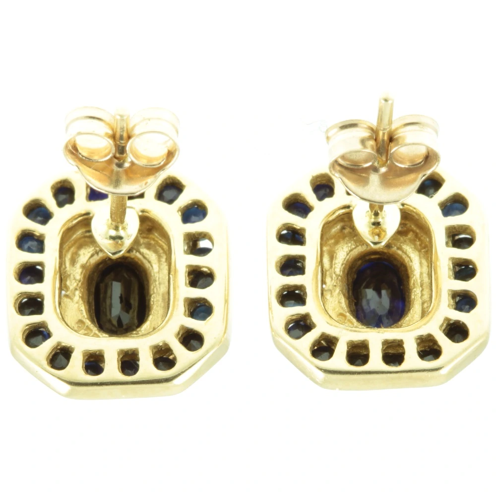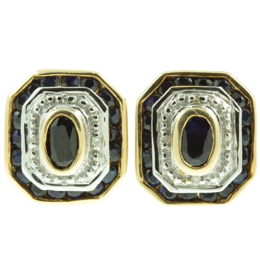 An exquisite pair of Art Deco Sapphire and Diamond Earrings. Two oval cut sapphires with a combined weight of 42 points are set in rich 9ct yellow gold in a raised rub-over setting. Below these admiral blue sapphires is a diamond accented panel made from 9ct white gold. The total diamond weight of both earrings is 8 points. Surrounding the diamond accent panel is a continuous row of sapphires, which have a combined weight in both earrings of 36 points. Holding these sapphires in place is an outer wall of rich 9ct yellow gold, which contrasts beautifully. These meticulously crafted earrings are of exceptional quality.