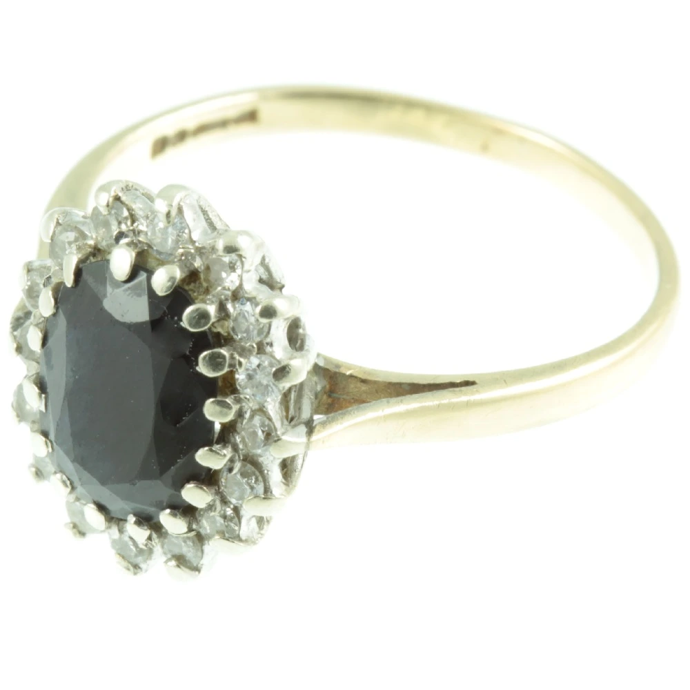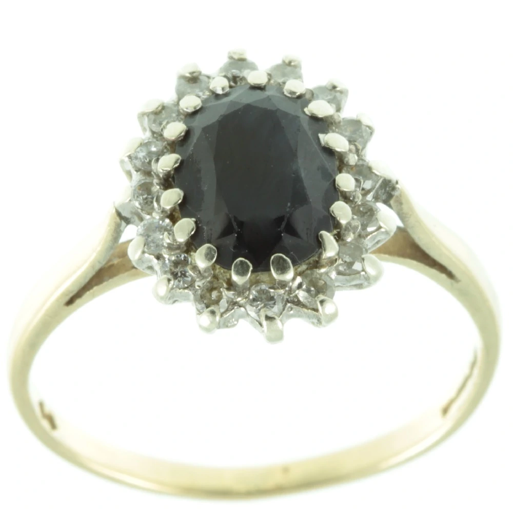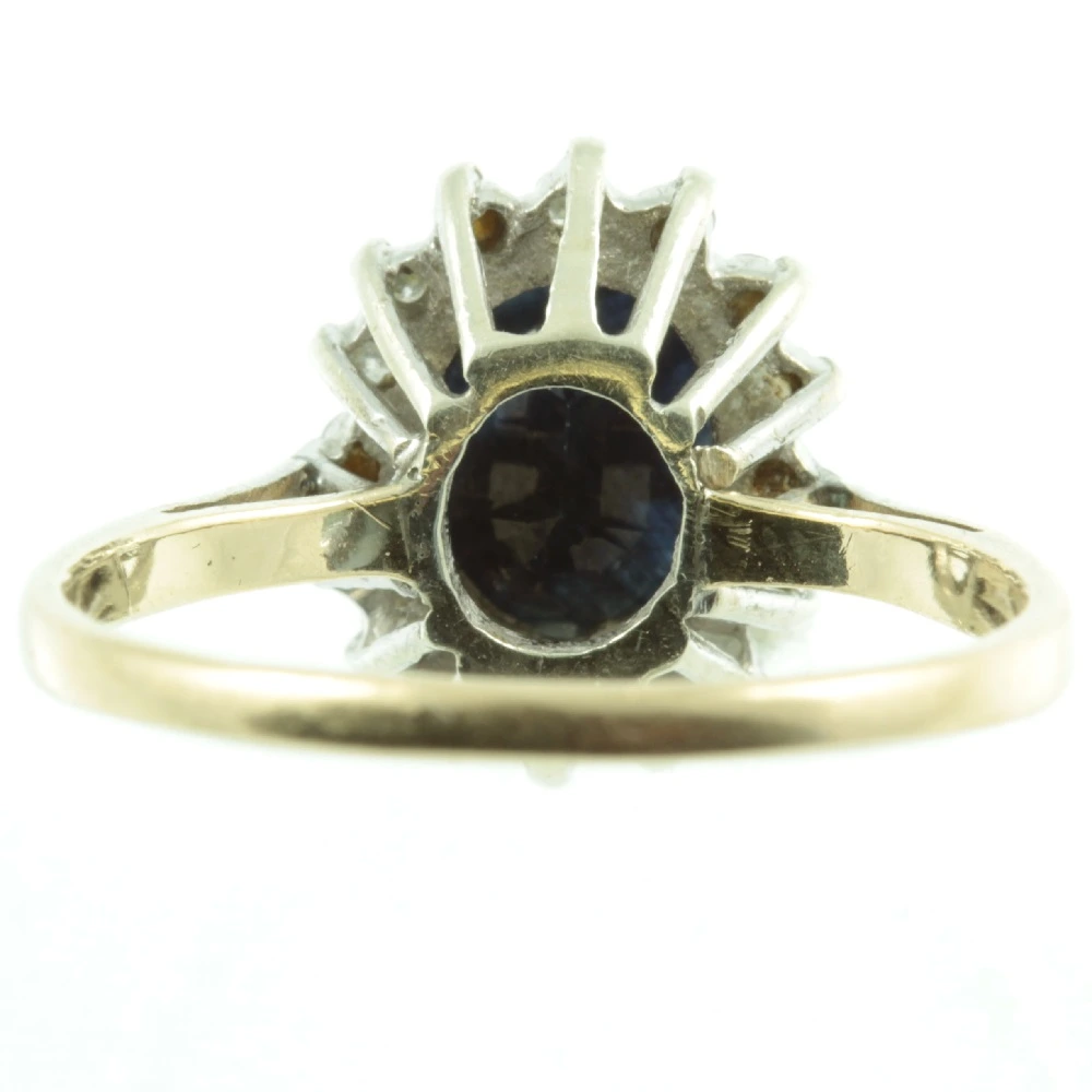 A classic Art Deco Sapphire and Diamond Ring. An oval-cut sapphire weighing 1.51ct is set in an 18ct white gold claw setting. Making it very secure for everyday use. Surrounding this gorgeous sapphire is a row of brilliant round cut diamonds measuring 18 points again set in 18ct white gold. The entire top section of this ring is raised up upon an 18ct white gold prong setting, with the band being made from rich 18ct yellow gold which contrasts beautifully. A most desirable ring.