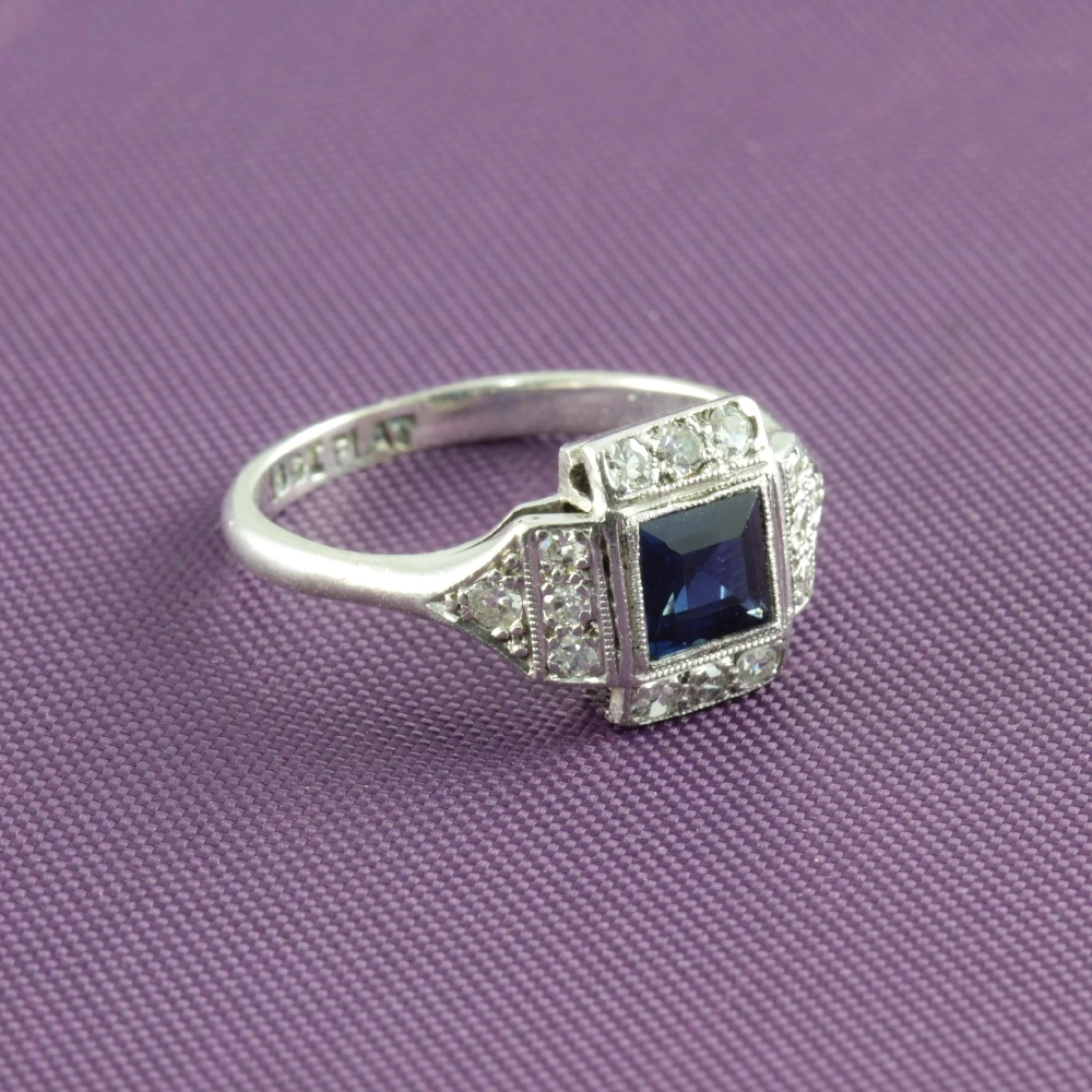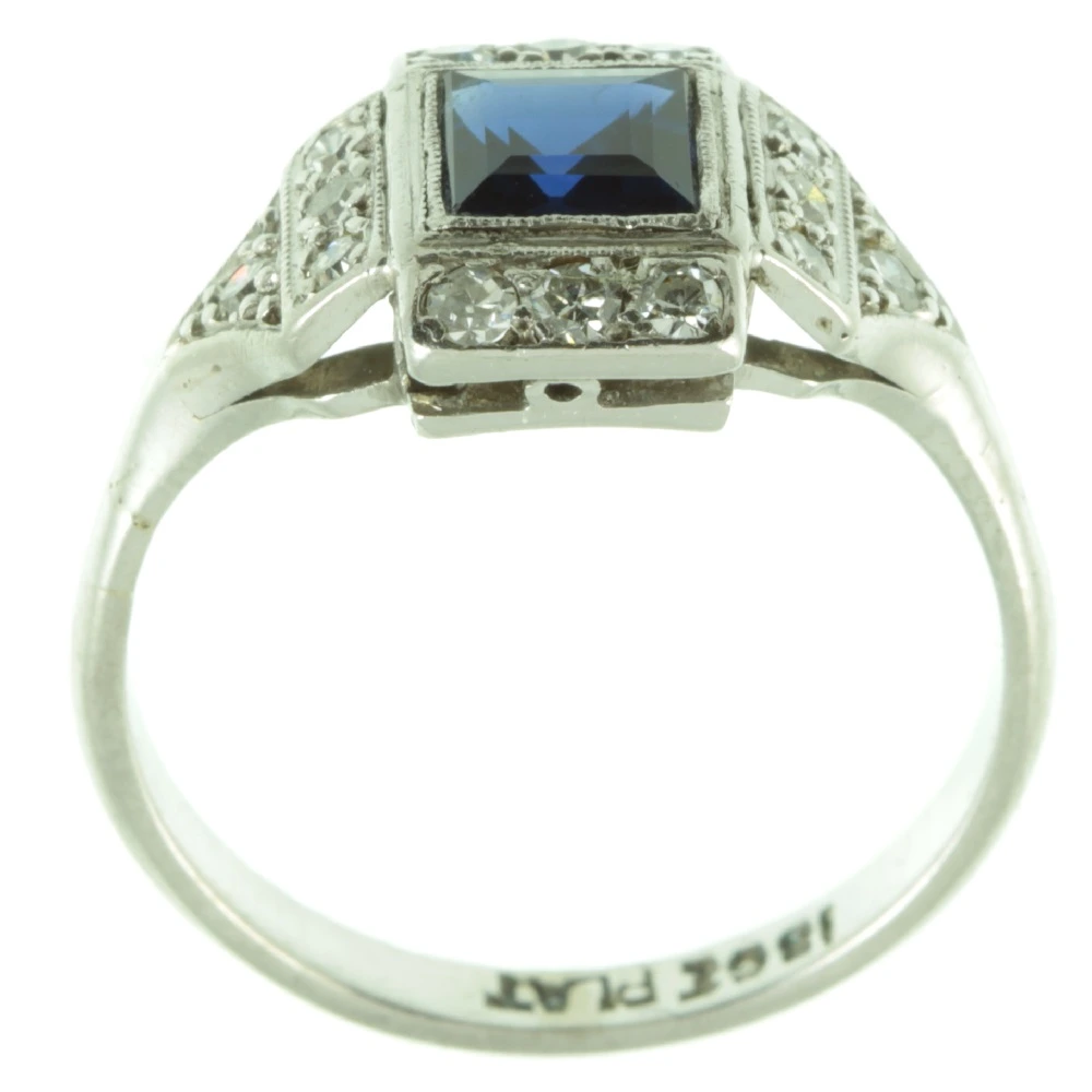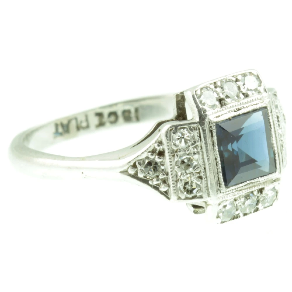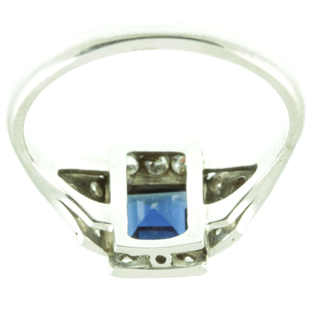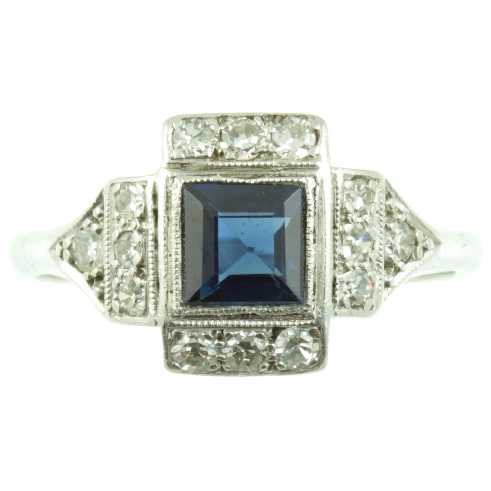 A classic Art Deco style Sapphire ring. The central sapphire gemstone weighing 46 points has been set in 18ct white gold and is surrounded by a fine milgrain border. There is a row of three round cut diamonds on each side of the sapphire and finished with a single diamond on each tapered shoulder. A beautiful antique Sapphire ring.