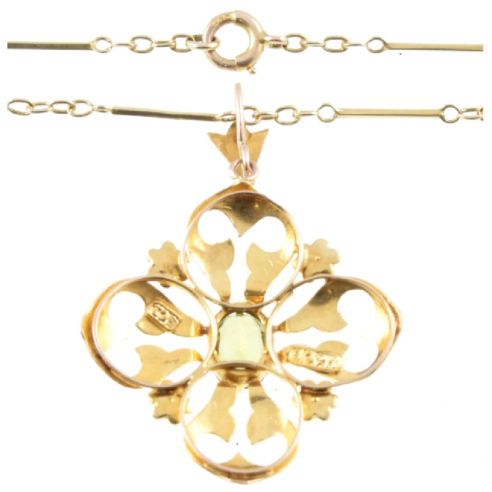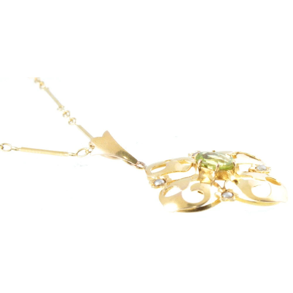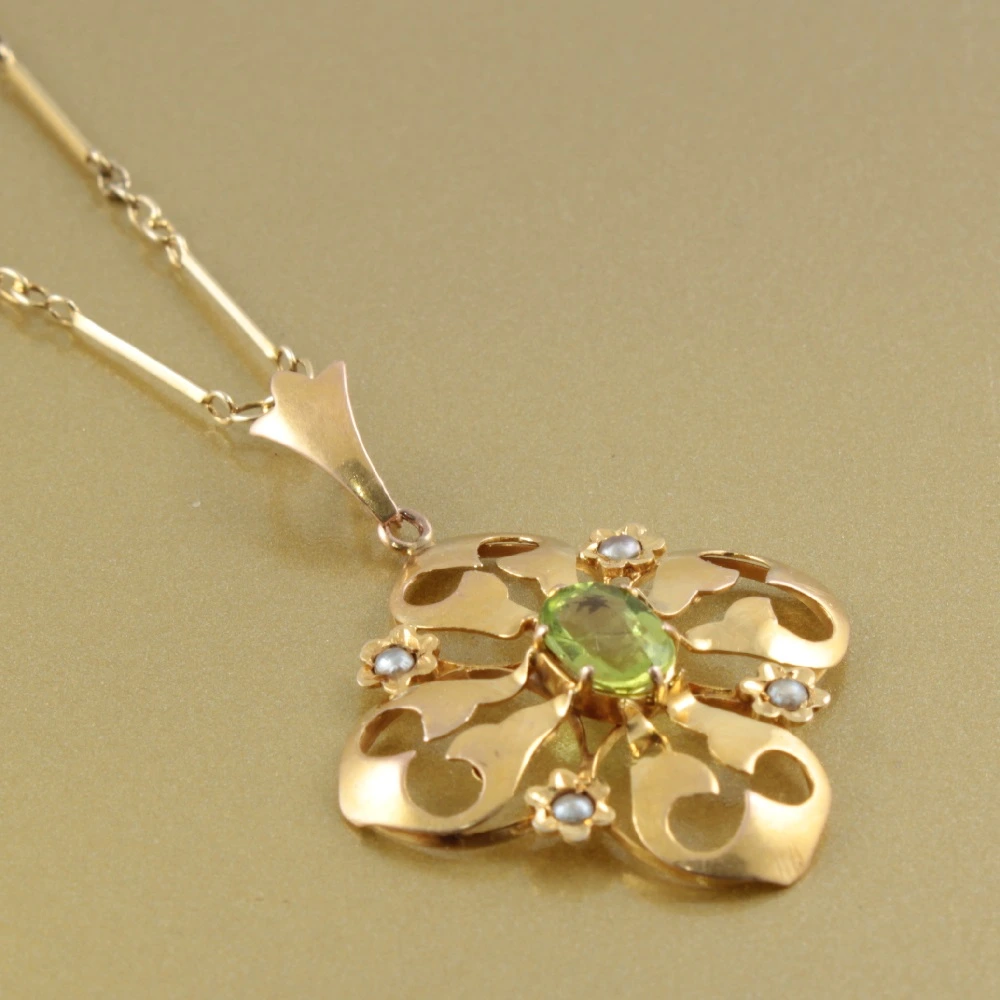 An attractive Art Nouveau Peridot pendant necklace. An oval cut Peridot gemstone weighing 70 points has been set in the center of open foliate scrollwork, with four split pearls. This gorgeous Art Nouveau pendant is suspended from a 9ct gold fetter link chain.