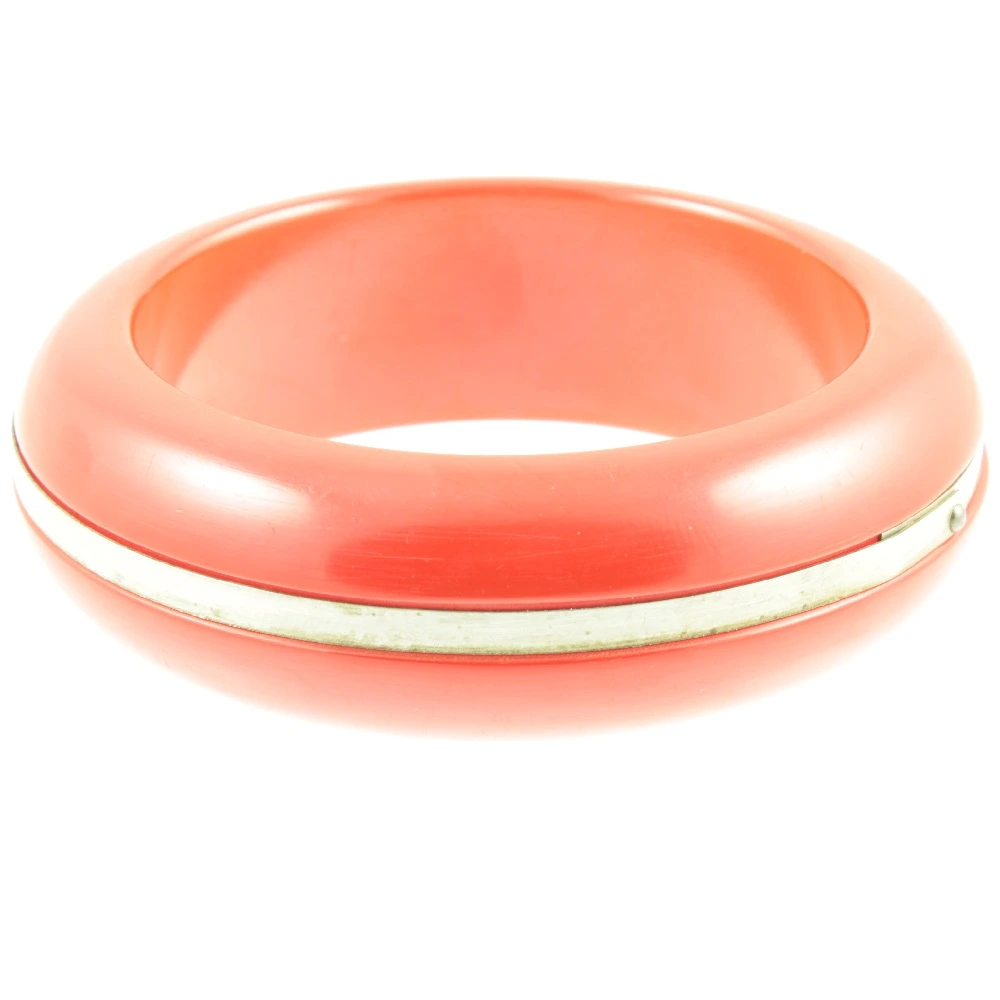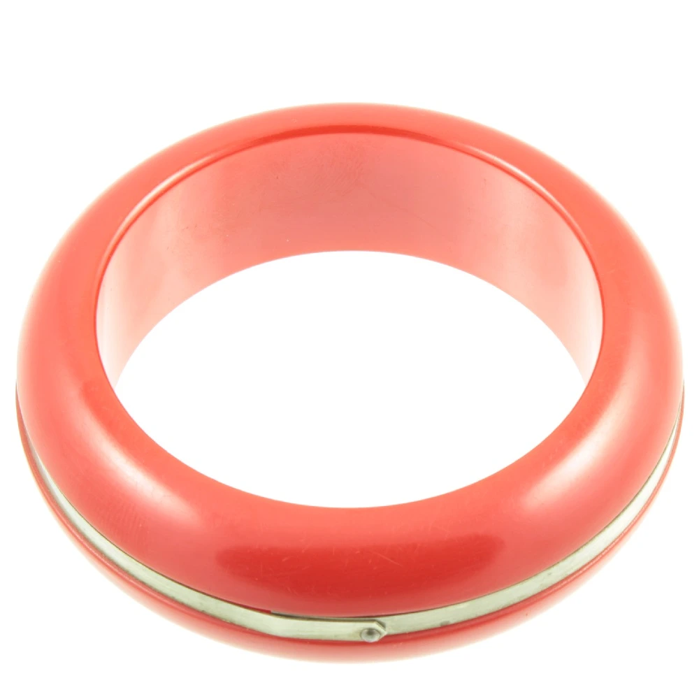 An impressive 1940s Retro Cherry Red Bakelite Bangle. A large cherry red bakelite bangle, with an inlaid silver-tone metal strip. An icon retro bangle.