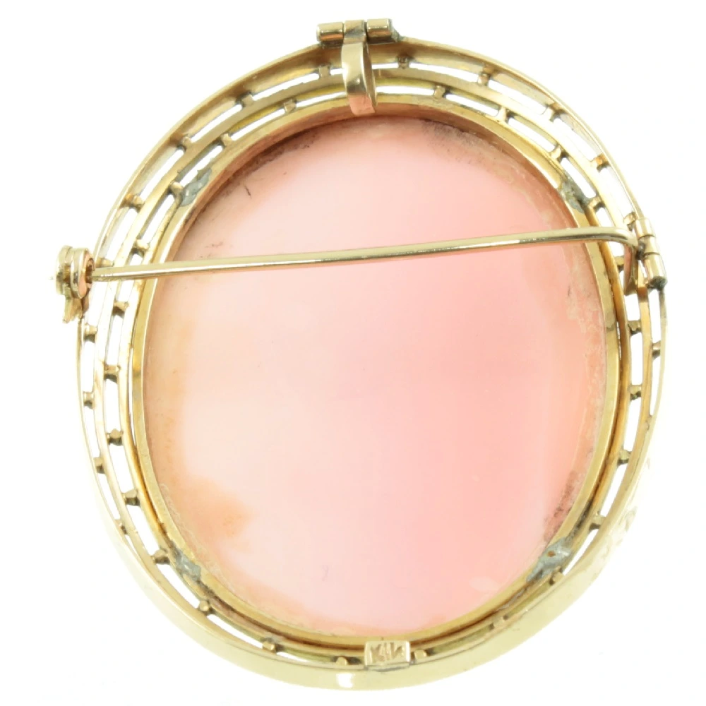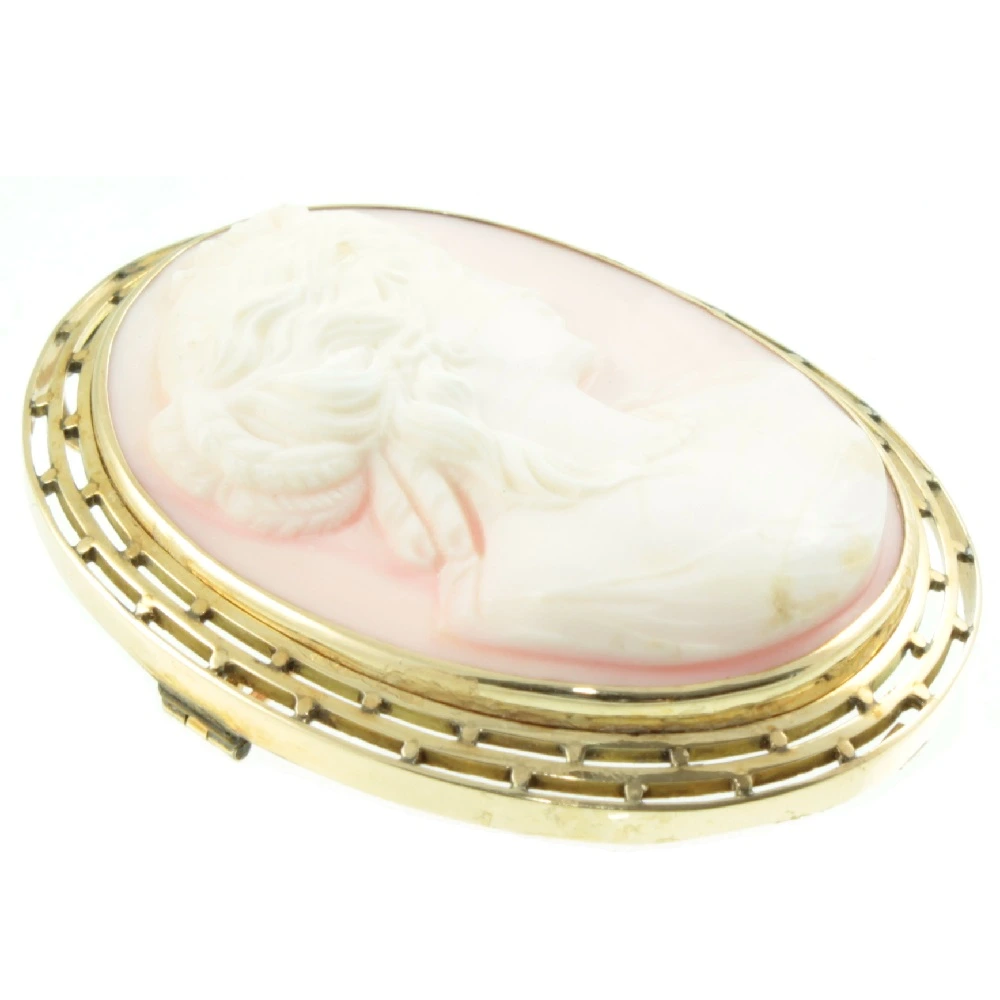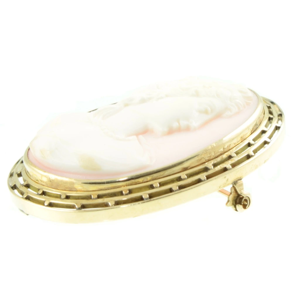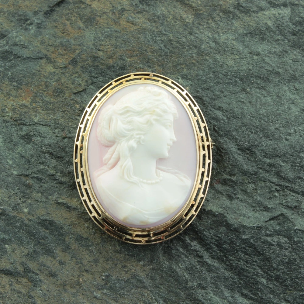 An intricately carved Edwardian Conch shell cameo brooch. Showing a lady in profile against a background of delicate pink, mounted in 14ct yellow gold. There are very slight tool marks still visible upon close inspection, which verifies that this cameo was hand-carved. A fine example of Edwardian period craftsmanship.