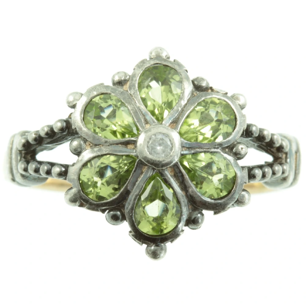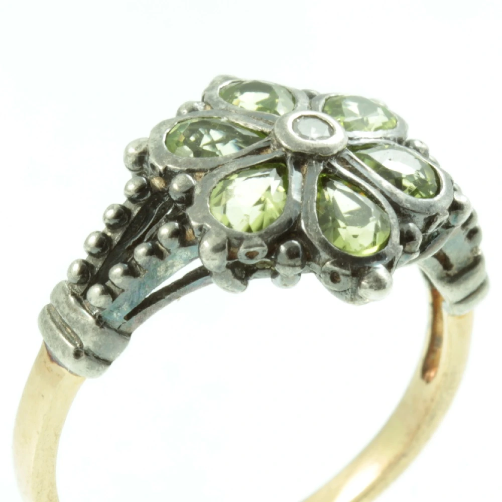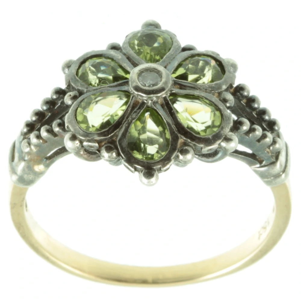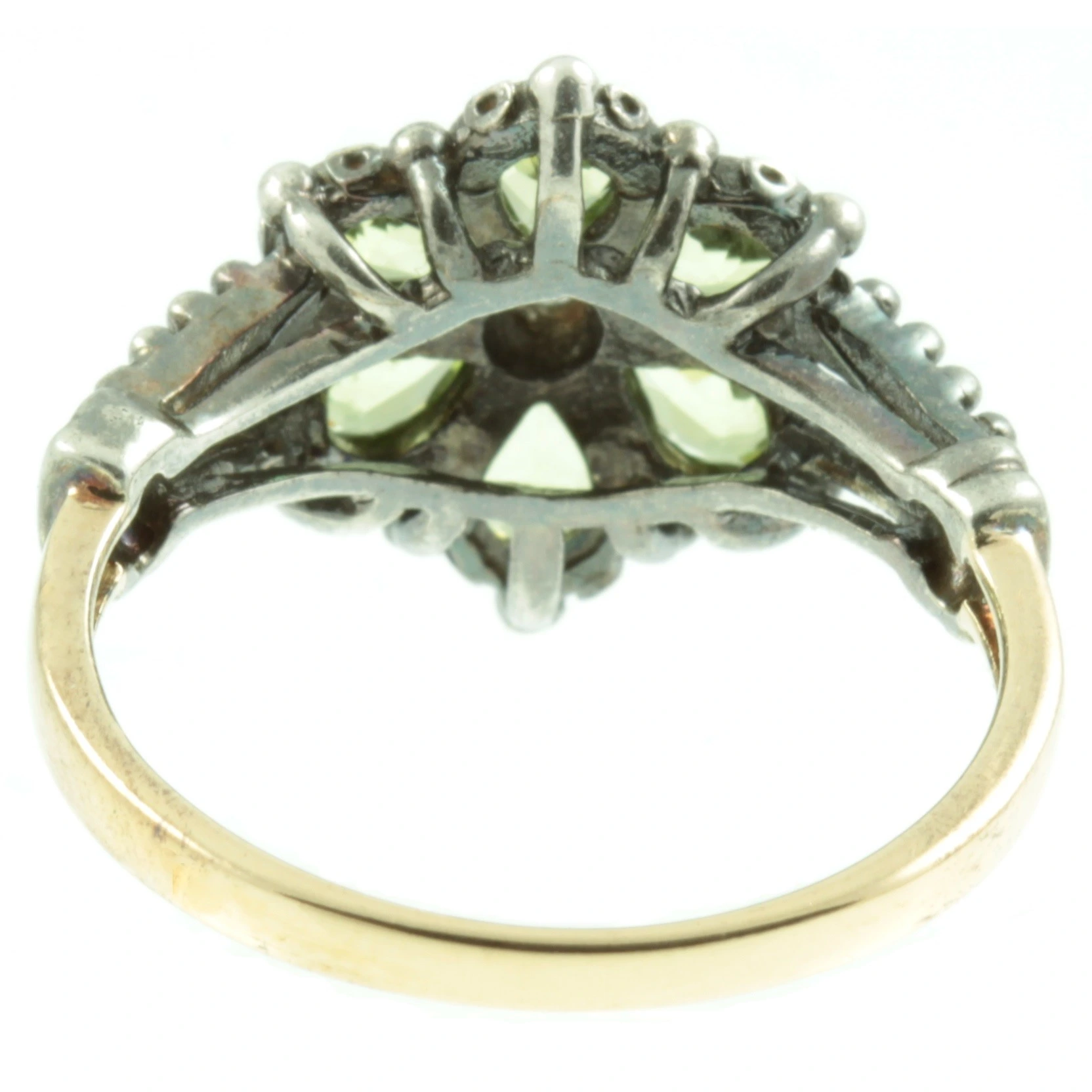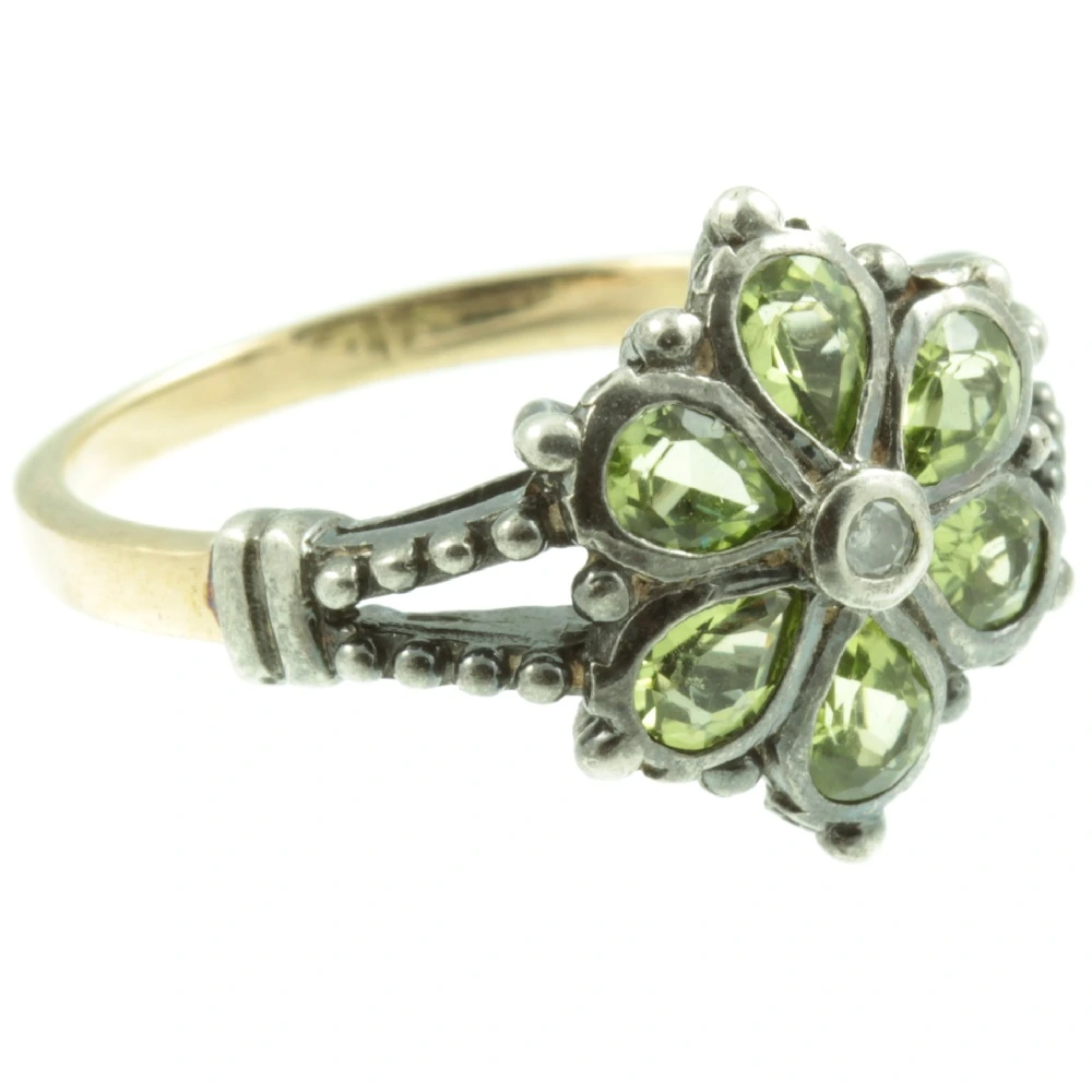A bright and lively Vintage Diamond and Peridot Cluster Ring. Six pear-cut peridot gemstones surround a brilliant-cut diamond, with a 15ct yellow gold band. These peridot gemstones catch the light beautifully.