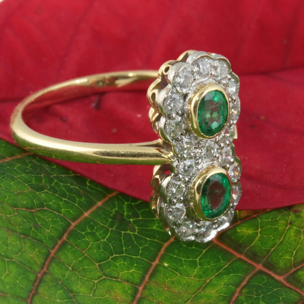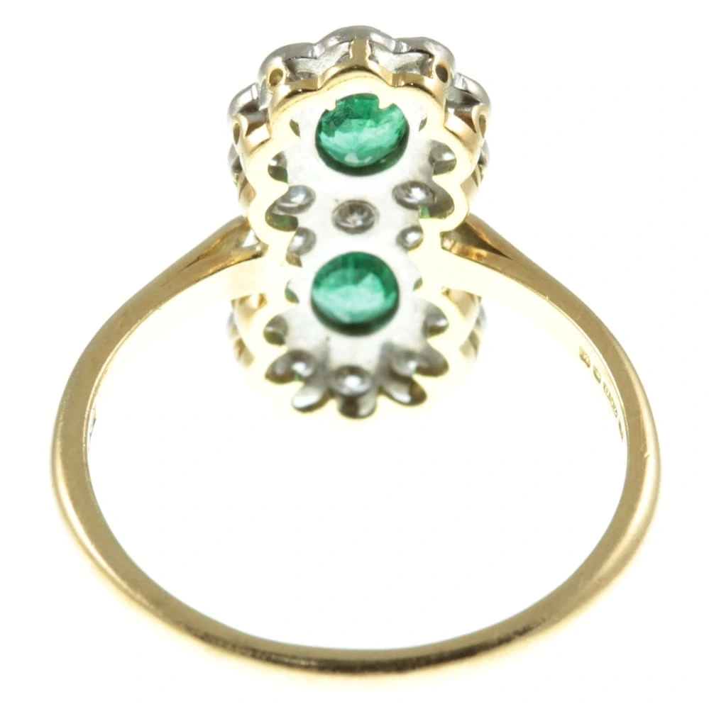 A fabulous Double Cluster Emerald and Diamond Ring. Two oval-cut Emerald gemstones have been set in yellow gold using a rub-over setting. These bright and lively Emeralds are surrounded by nineteen round-cut diamonds, set in white gold with a scallop edge finish. The underside of the top gallery and the band is made from yellow gold giving a beautiful contrast.