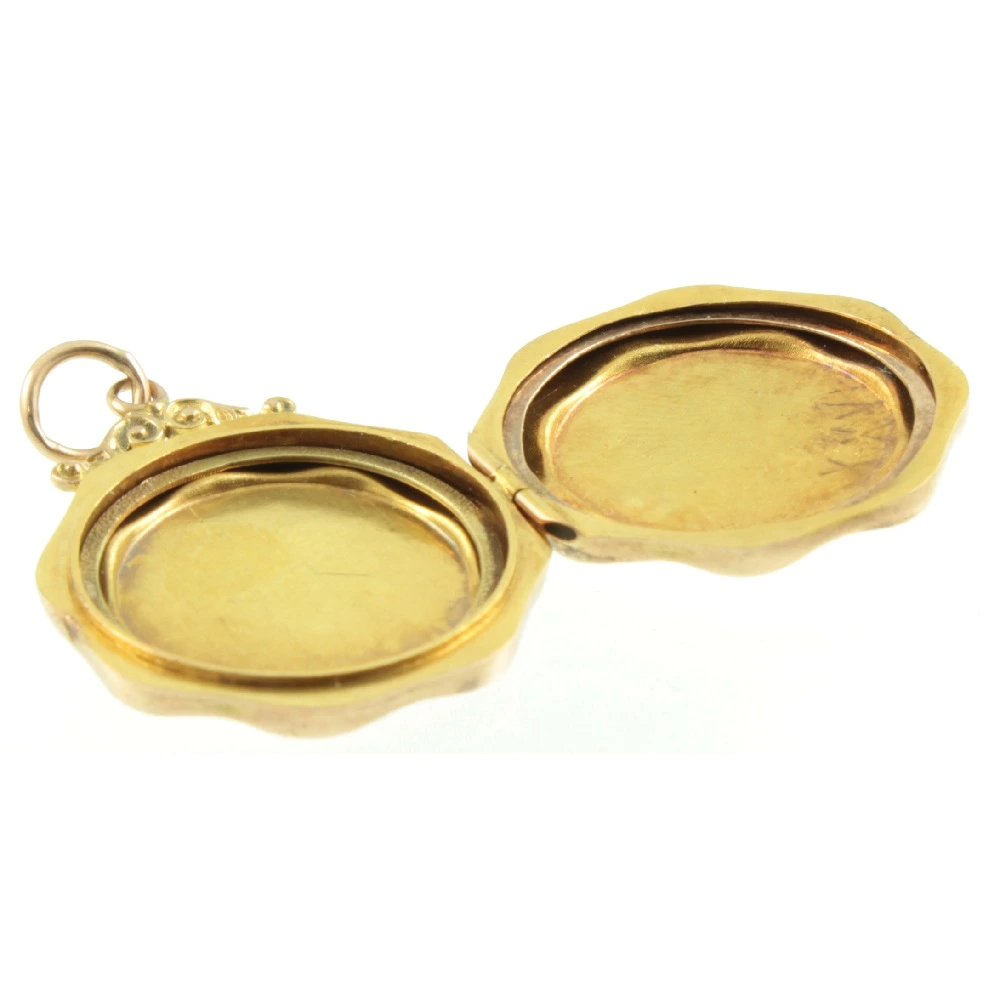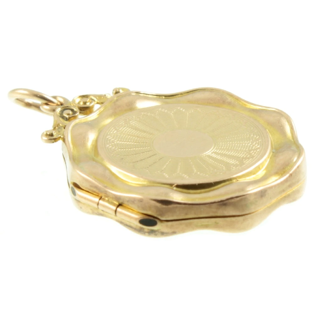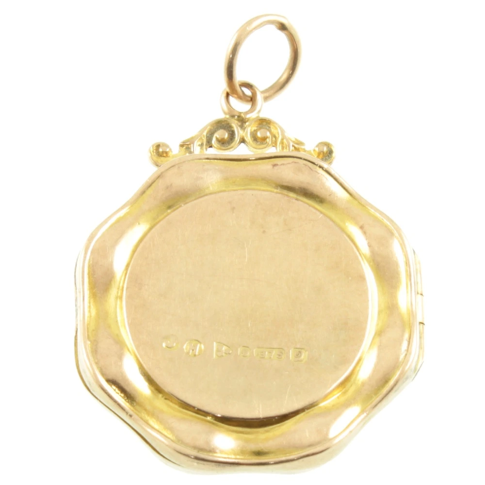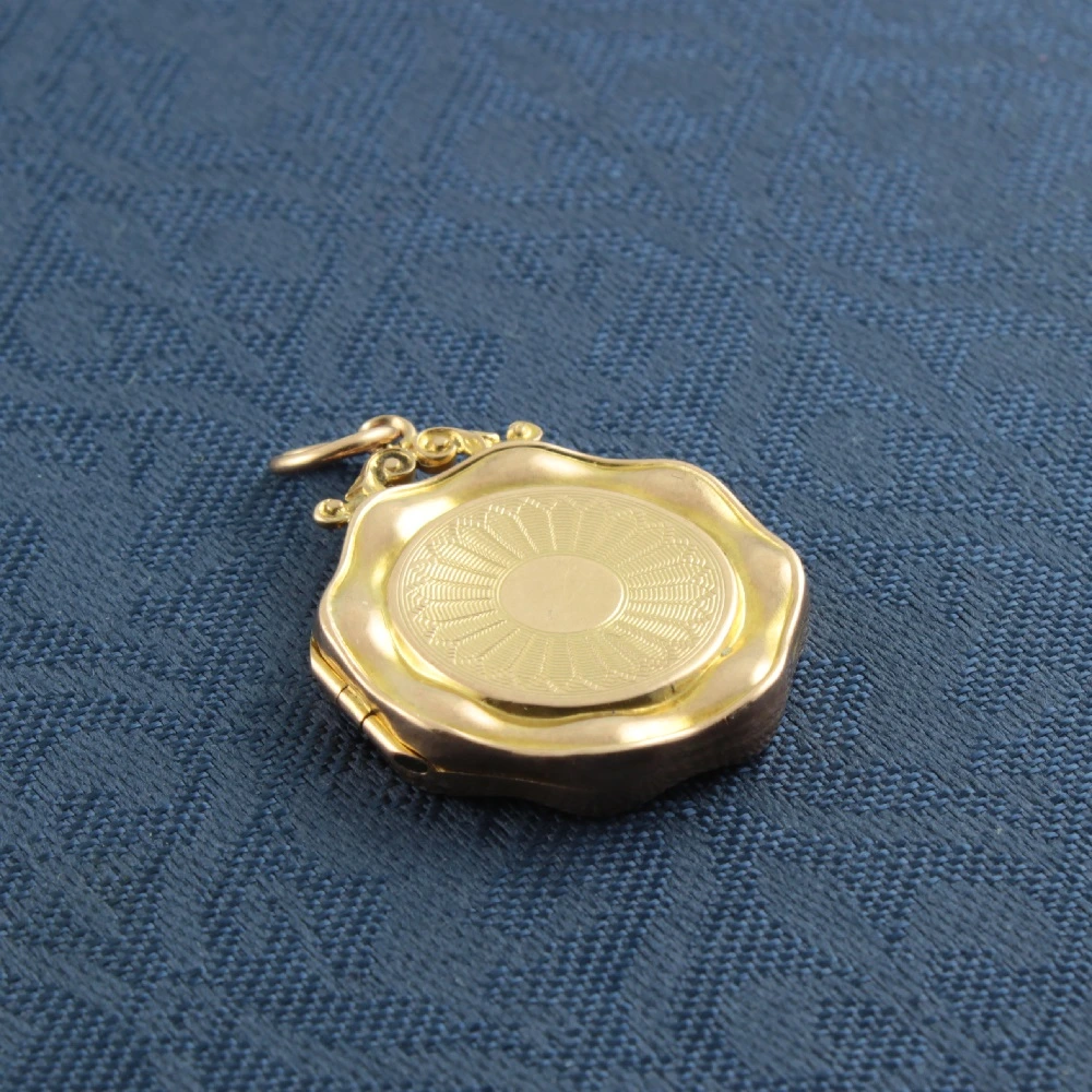 A Decorative Edwardian 9ct gold locket. An octagonal-shaped locket, with an engine-turned geometric pattern. This beautiful locket is then finished with scroll detailing at the top. Contains hallmarks for Chester 1916. An elegant and timeless pendant locket.