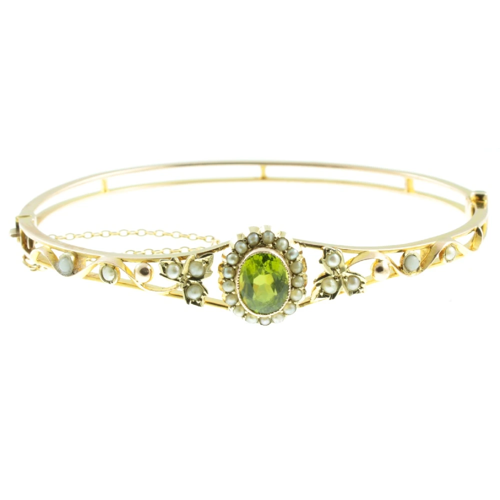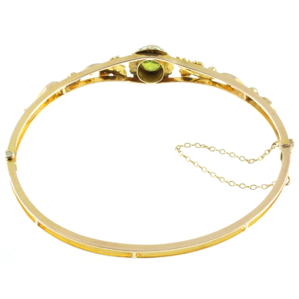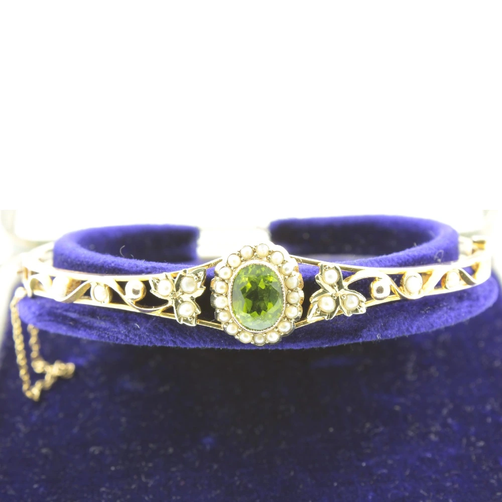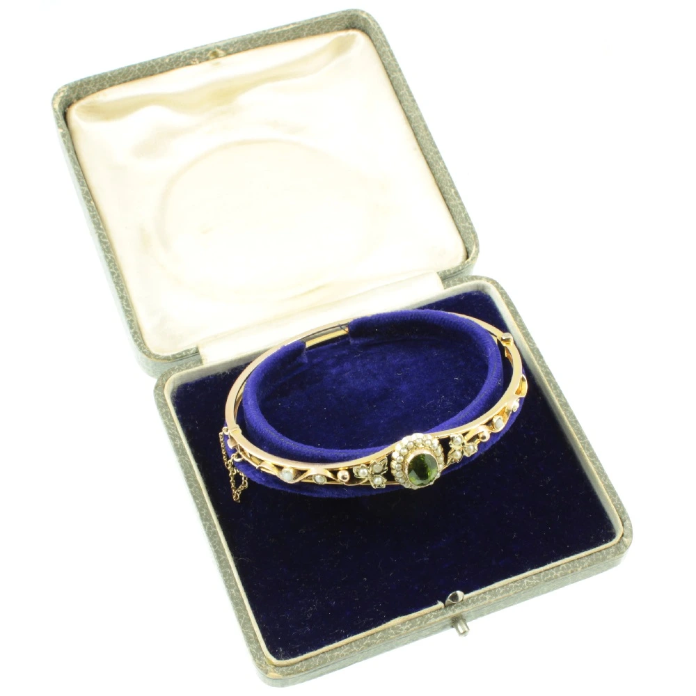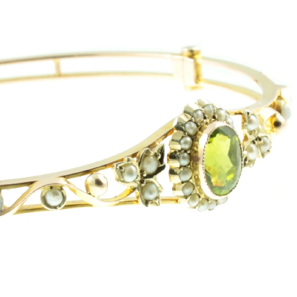 An exquisite Edwardian peridot and pearl bangle. An oval cut peridot gemstone weighing 1.7ct has been set in 9ct gold with a surround of split seed pearls, with a split pearl foliate design to either side. This bangle is hinged and fitted with a safety chain, it also comes with its original box. A very desirable piece of jewellery that looks amazing when worn.