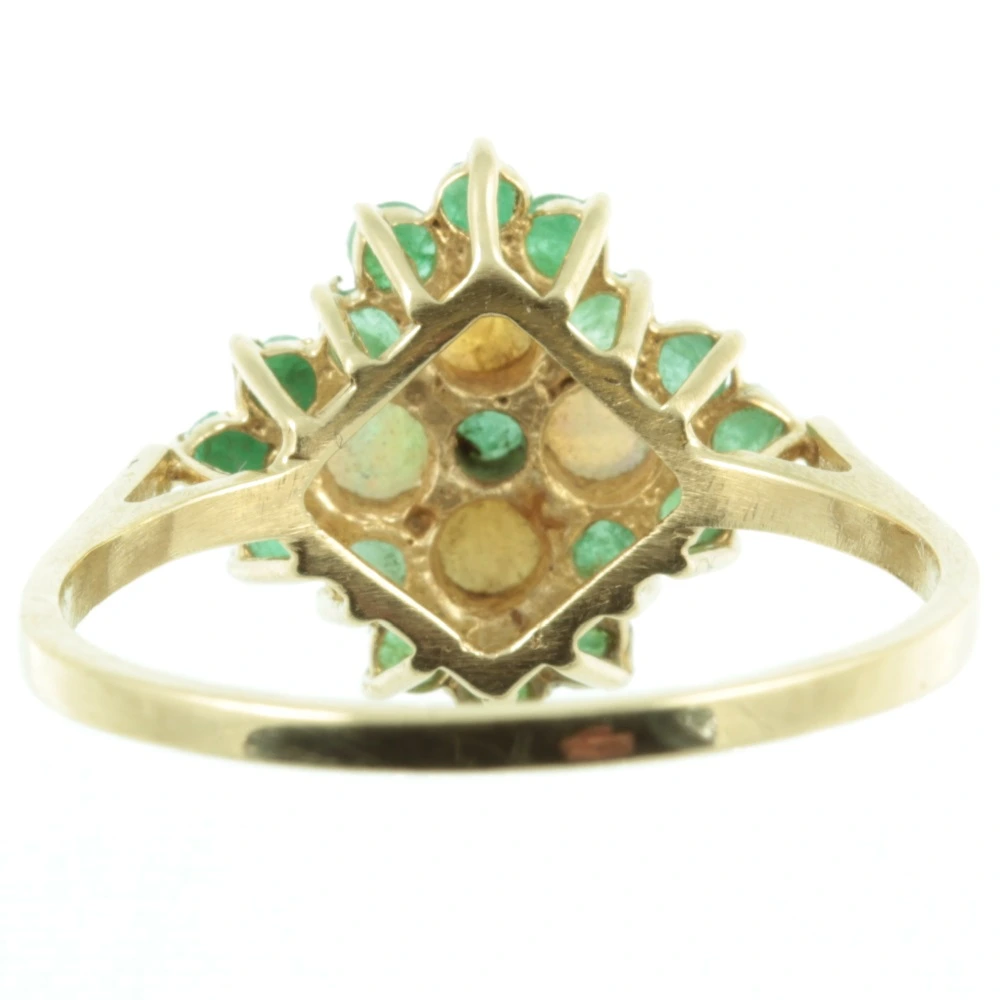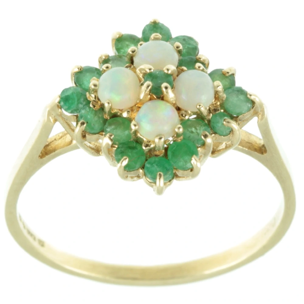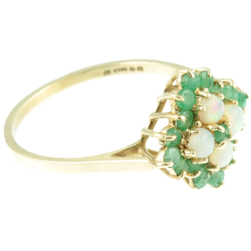A gorgeous Vintage Emerald and Opal Ring. Four fiery round-cut cabochon opals set in a cluster of 17 round-cut emerald gemstones. Each of these opals has a magical play of colour, so intense that it can even be seen in the photo which is unusual. Each round-cut emerald has a beautiful depth of colour and they work really well with the opals. The entire top section of this ring is set on a raised prong setting, which like the band is made of rich 9ct yellow gold. A really pretty vintage ring