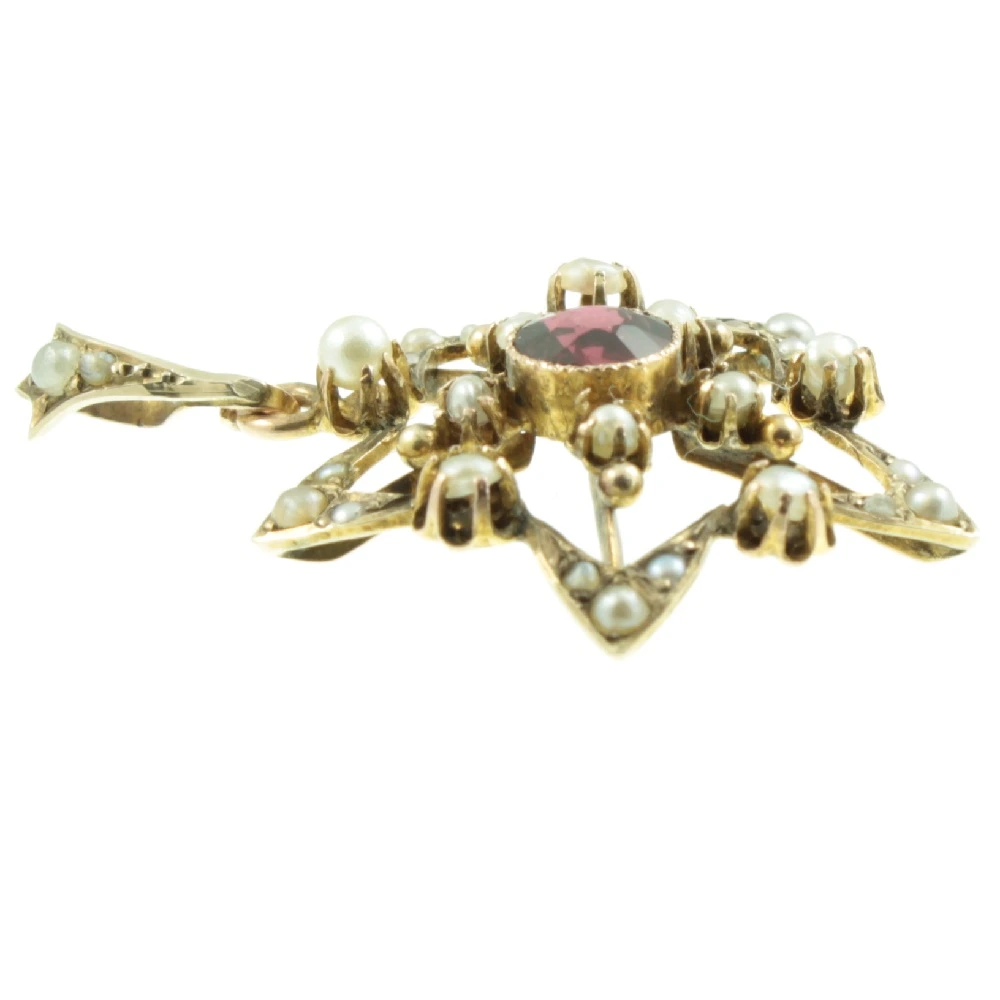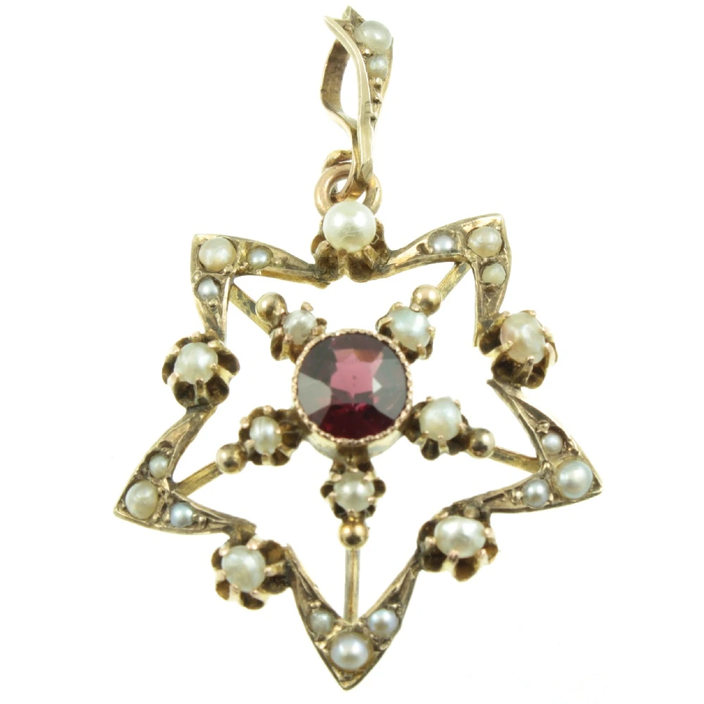An ornate Edwardian Garnet and Pearl Star Pendant. A round cut garnet weighing 70 points has been set in 9ct yellow gold with a milgrain finish. Surrounding this central gemstone a four seed pearls which point outwards to a seed pearl and split seed pearl star. A classically Edwardian pendant.