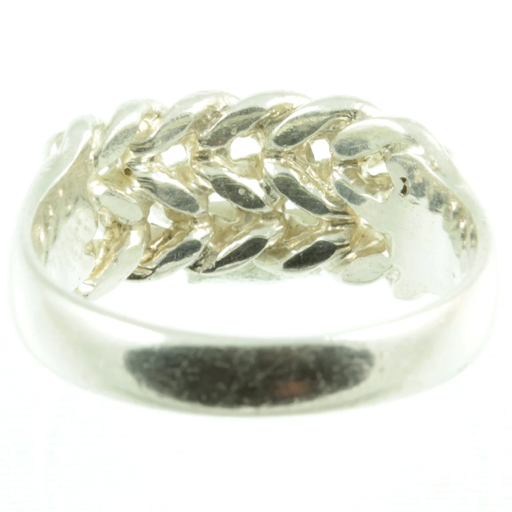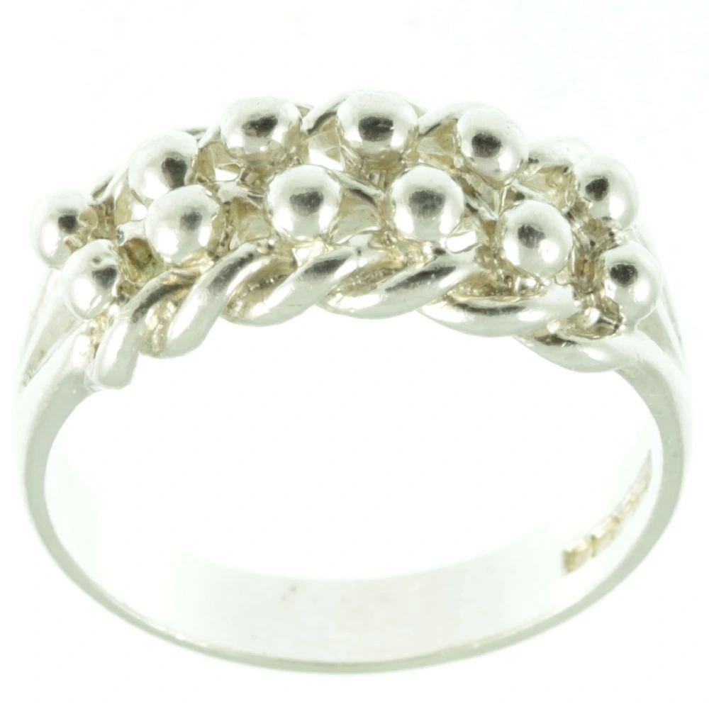 A bright Vintage Gentlemens Silver Keepers Ring. The top section of this ring features two rows of sterling silver spheres set on a double plait. This ring is hallmarked for 1987 and is stamped with the maker’s mark “D&W”. A beautifully vintage ring.