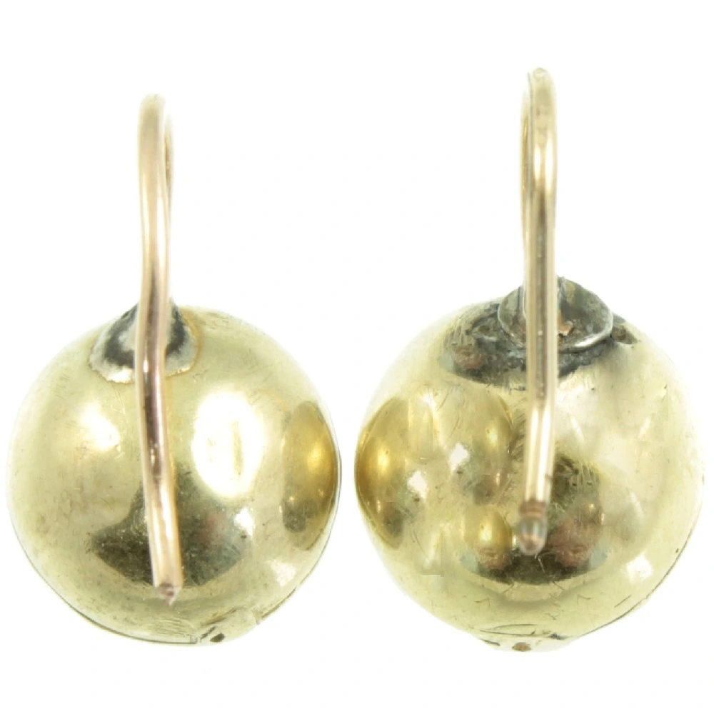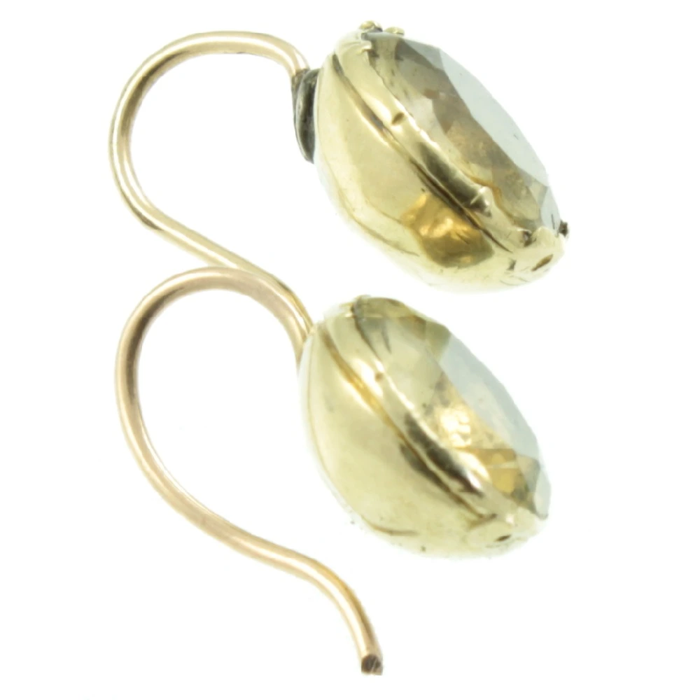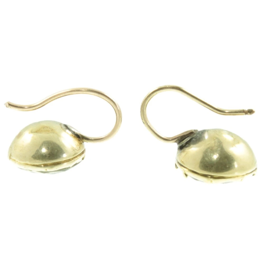 An original pair of Georgian paste earrings. These foil-back paste stones have been set in a 9ct yellow gold closed-back setting and fitted with shepherd hooks. The foil backing is to enhance the stone`s sparkle and has aged beautifully with little patches of foxing visible, circa 1870.