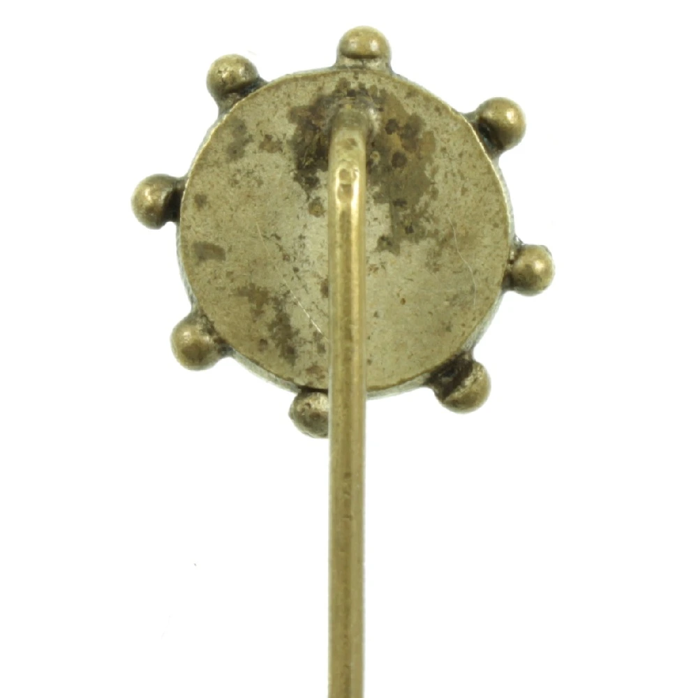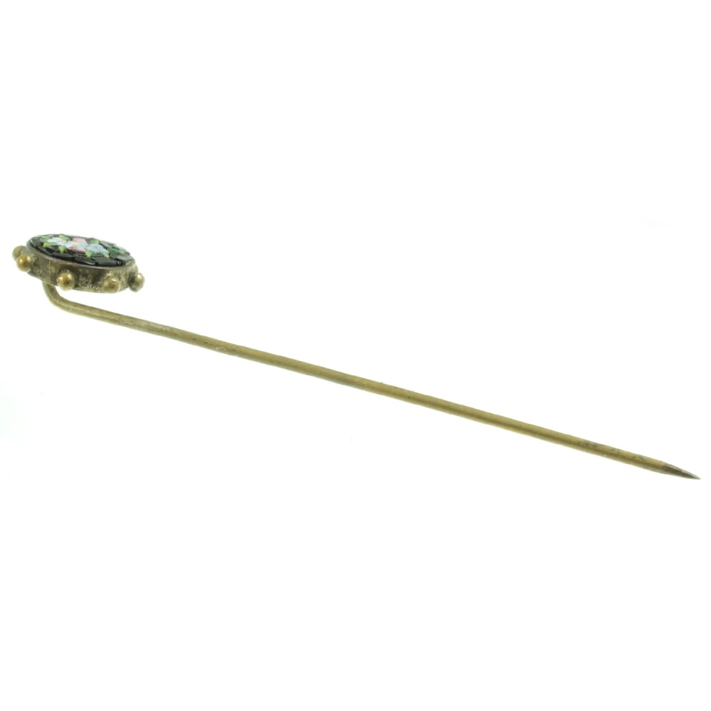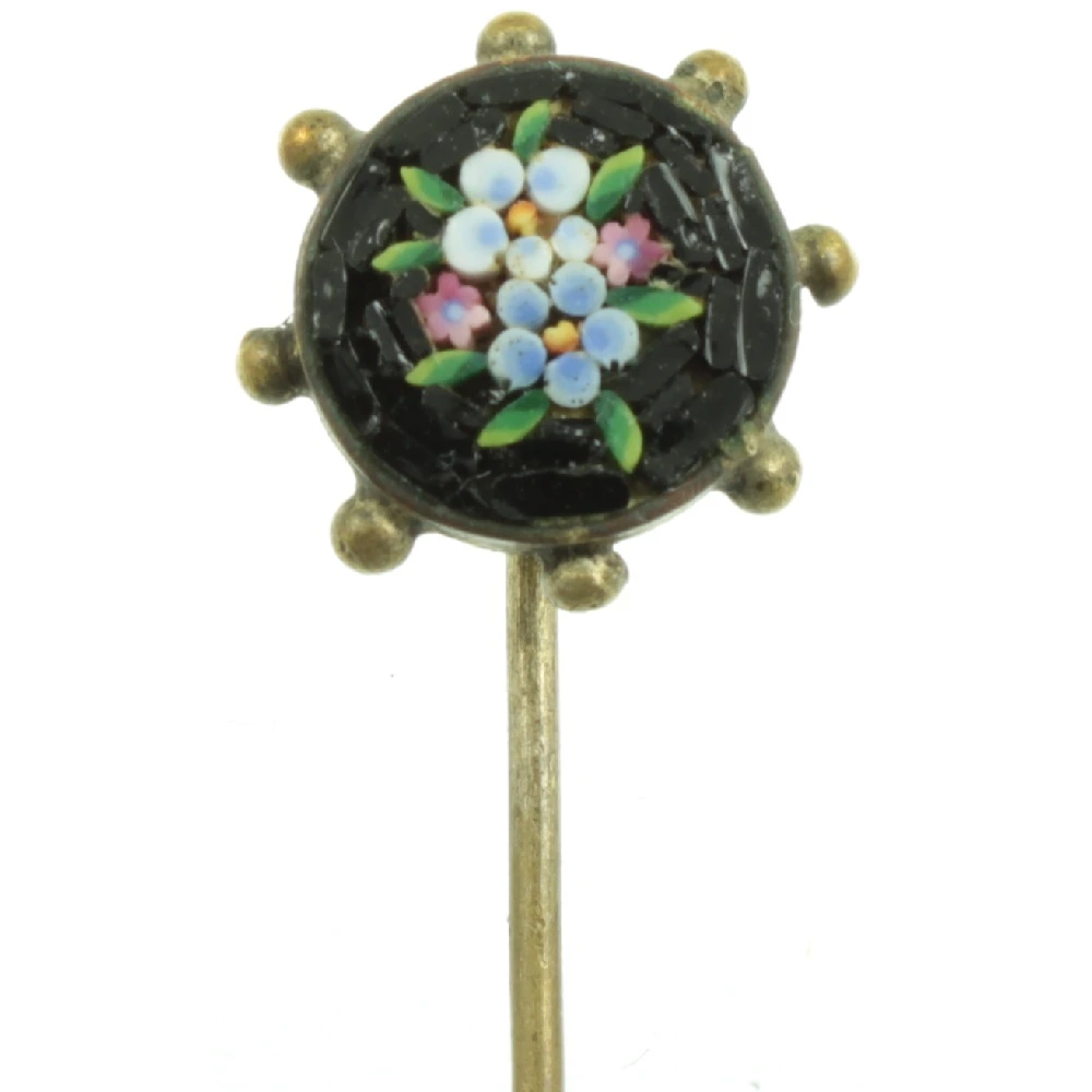 A meticulously crafted Victorian micro mosaic tie pin. Tiny pieces of ceramics have been arranged to depicting four flowers and foliage on a black background. This micro mosaic has then been mounted in a gold-tone setting, a rare and unique piece of Victorian craftsmanship. All of our tie pins are sold with a stopper fitted to the point.