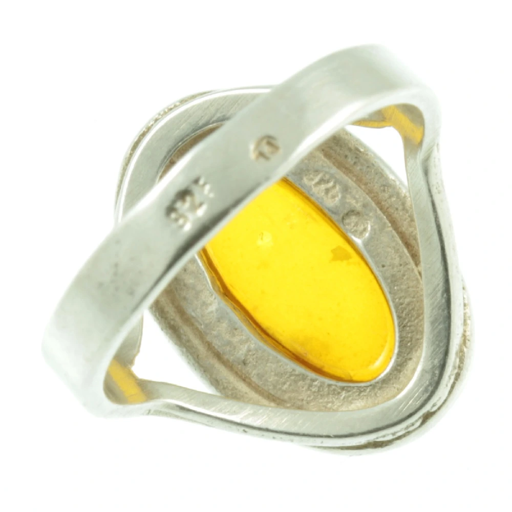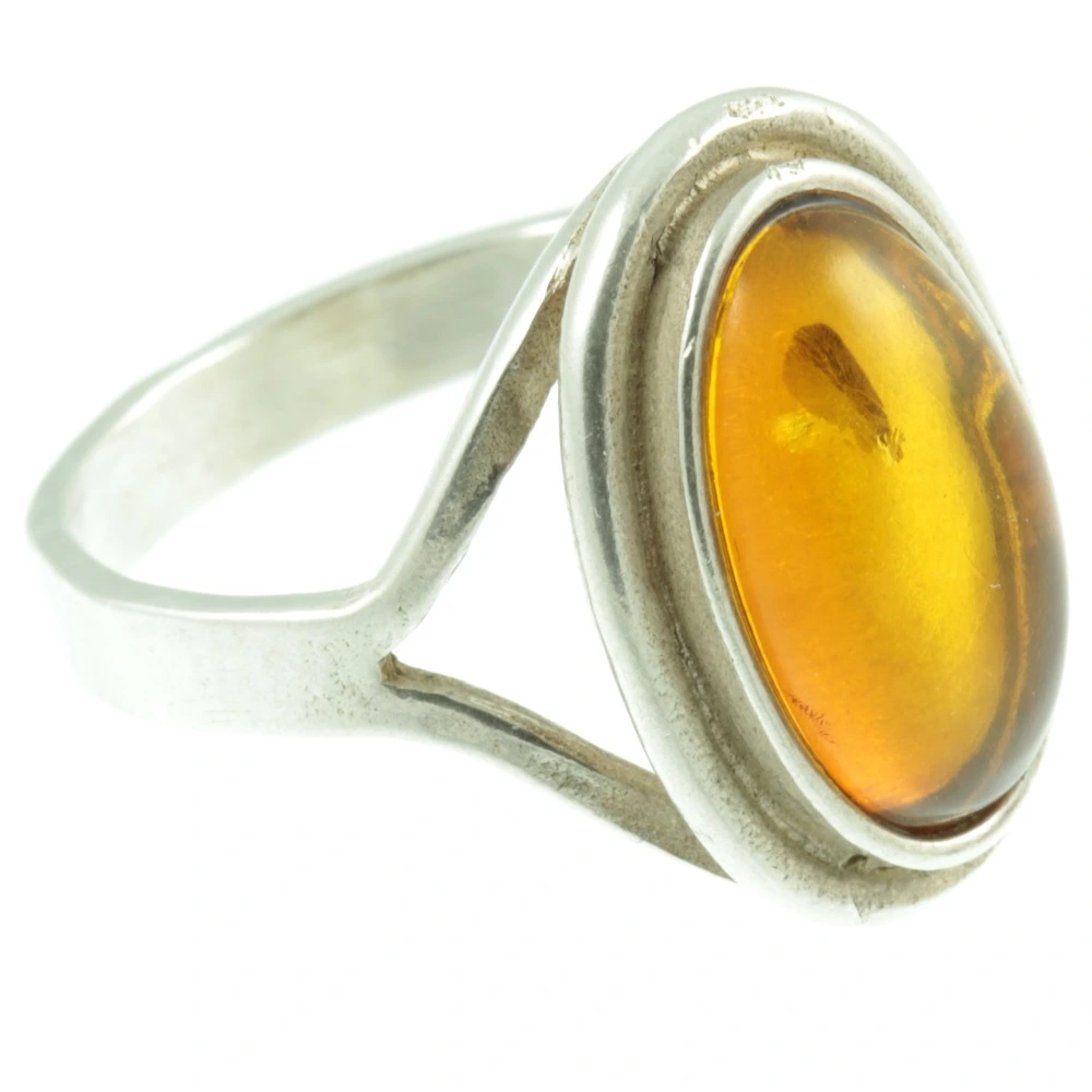 A very pretty 1950s Mid-Century Amber and Silver Ring. An oval-shaped amber set in sterling silver, using a rub-over setting. There are contained in this amber a number of foliage fragments, which glitter and add depth to the ring. Also, the colour of this amber changes to a rich cognac when worn because the light cannot pass through from behind. A Scandinavian-inspired, artisan-made ring.