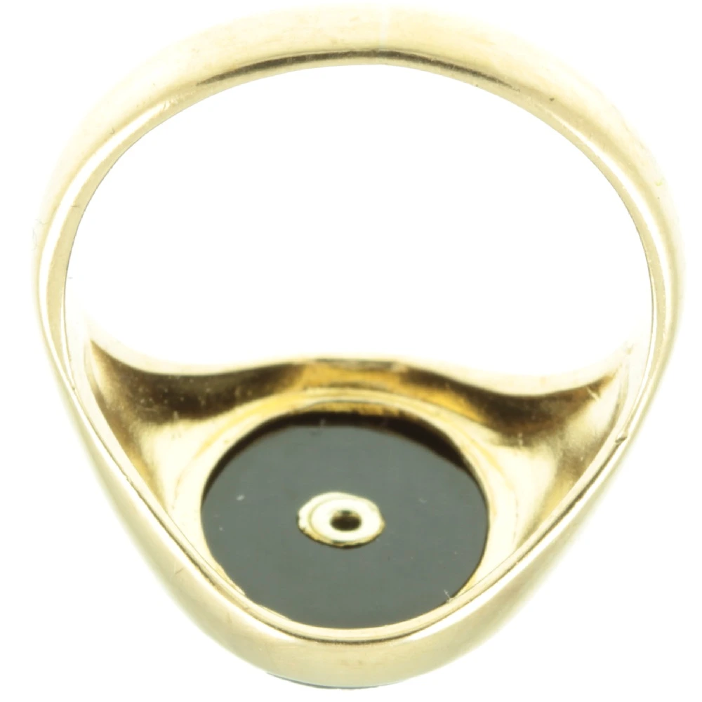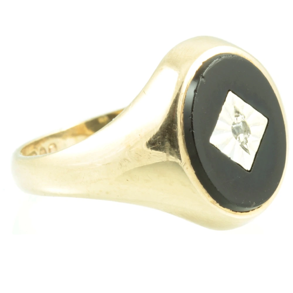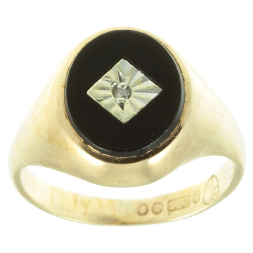 A classic Vintage Onyx and Diamond Signet Ring. An oval-cut onyx gemstone containing a single-cut diamond mounted in a diamond-shaped panel made of 9ct white gold, with the band being made from rich 9ct yellow gold. A very stylish piece of men`s vintage jewellery.