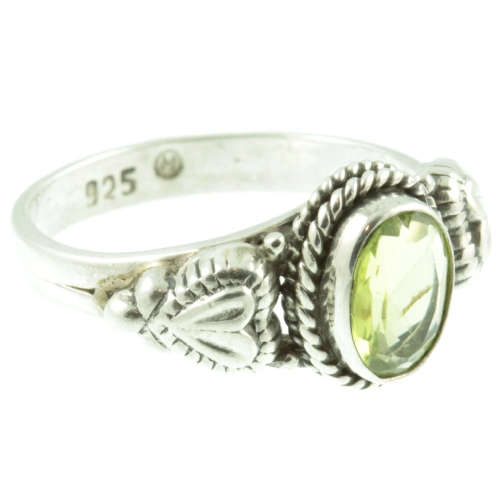 A charming Vintage Peridot Sterling Silver Ring. An oval-cut peridot gemstone weighing 47 points is set in sterling silver using a rub-over setting. This peridot has beautiful clarity making it bright and lively. Below this gemstone is two rows of twisted ropes, with silver hearts set on each shoulder. A unique and beautiful vintage ring.